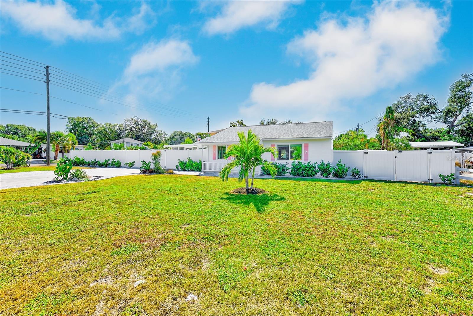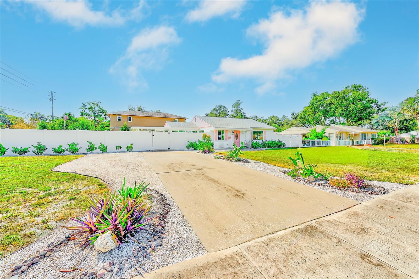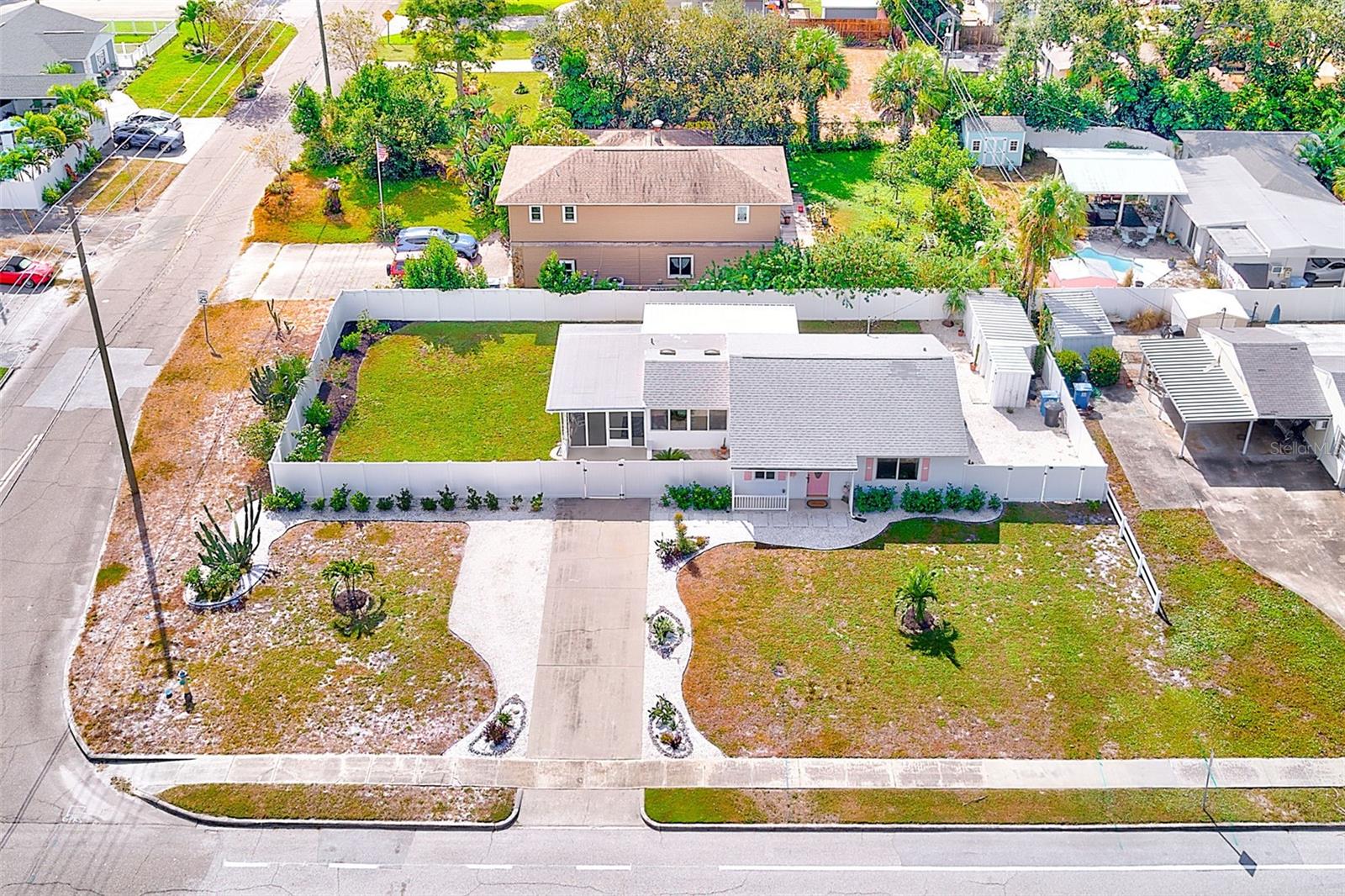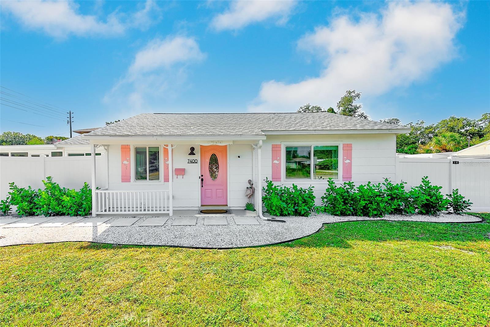 Welcome to an impeccably remodeled 2-bedroom, 3-bath home on a handsome corner lot with room to add a pool — in a full no-flood zone, less than 10 minutes from the beaches of Treasure Island, Madeira Beach and St. Pete Beach, and only 10-15 minutes to vibrant downtown St. Petersburg. Inside, the style feels entirely custom-designed: luxury vinyl plank flooring throughout, three beautifully finished bathrooms with distinctive tile work, and abundant attention to detail. The third full bath (recently constructed with future pool plans in mind) is sleek and modern; the second bath is a statement room with oversized polished porcelain tile (60×120), a freestanding tub set against a deep blue vertical tile accent wall and a floating wood vanity with brushed-gold fixtures; the primary bath exudes spa-like elegance with marble-look wall tile, hexagonal floor tile and a slatted wood-vanity design. The kitchen is full of personality and charm: butcher-block countertops paired with light-blue upper and white lower cabinets, stainless-steel appliances, an island cooktop and a bay window at the sink. In the adjacent dining area, custom window bench seating complements a matching butcher-block table, and skylights overhead flood the space with bright, cheerful natural light. Major systems and structural upgrades have been completed 2023-2024: new HVAC with ductwork, full 200-amp electrical service and panel, hurricane-impact sliders & windows, fresh exterior paint (2024), new vinyl privacy fence and gating for vehicle/boat/RV storage, programmable outdoor lighting, well-pump irrigation system, and two large aluminum storage sheds (16×8 & 7×6) for generous storage without rust. Mature Peruvian Apple cacti anchor the landscaping, together with recently planted palms, avocado and orange trees — a lush backdrop that complements the clean modern interiors. This home is truly move-in ready, thoughtfully updated from top to bottom, offering designer styling, peace of mind, and a prime location.