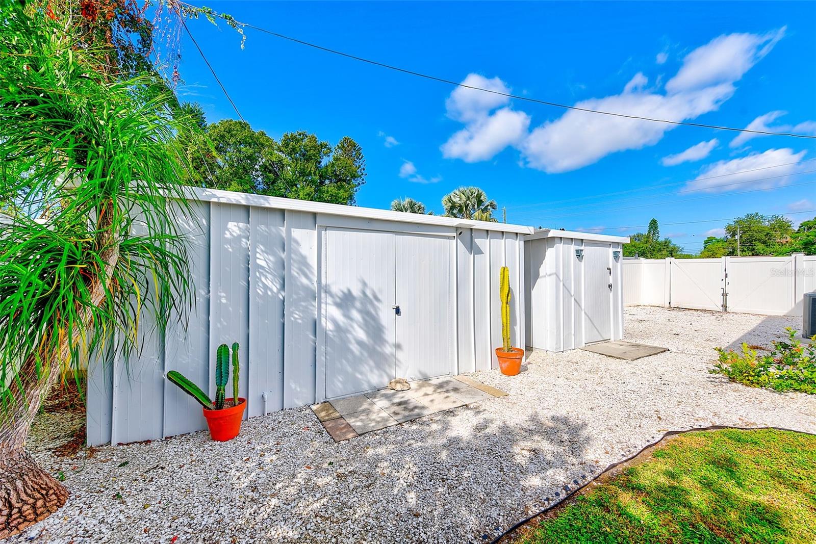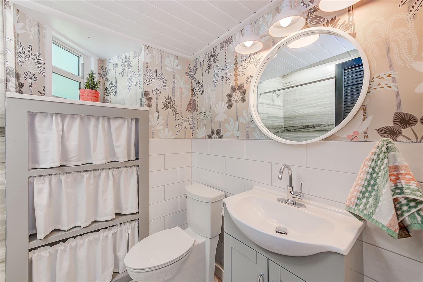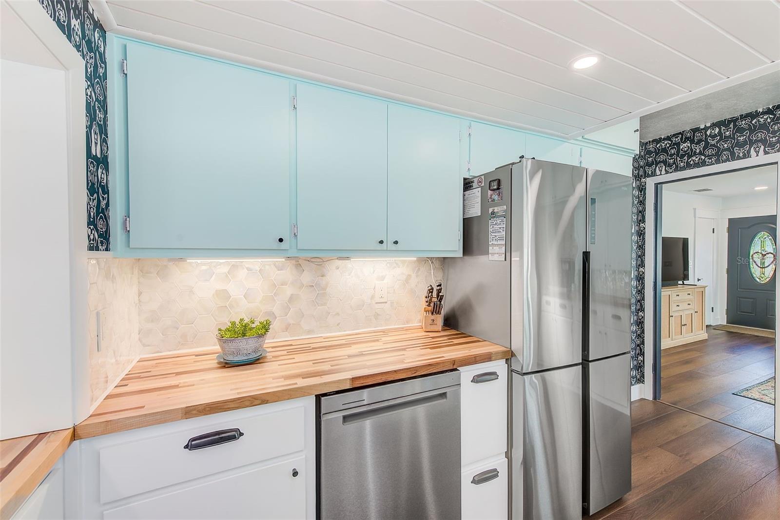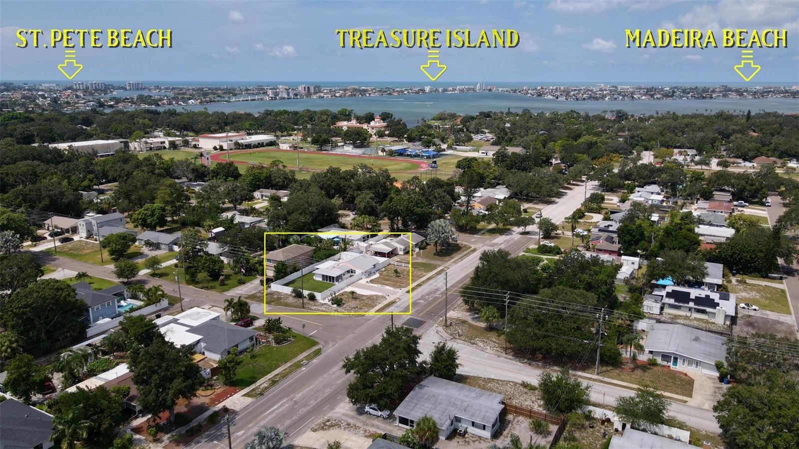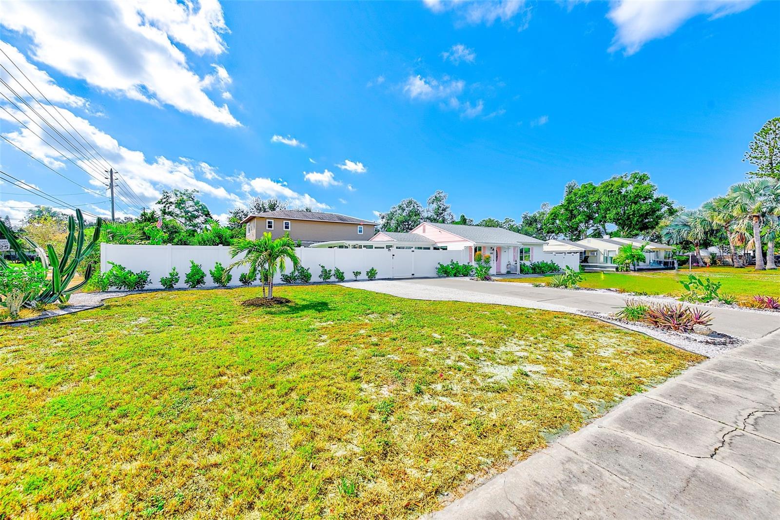 Welcome to an impeccably remodeled 2-bedroom, 3-bath home on a handsome corner lot with room to add a pool — in a full no-flood zone, less than 10 minutes from the beaches of Treasure Island, Madeira Beach and St. Pete Beach, and only 10-15 minutes to vibrant downtown St. Petersburg. Inside, the style feels entirely custom-designed: luxury vinyl plank flooring throughout, three beautifully finished bathrooms with distinctive tile work, and abundant attention to detail. The third full bath (recently constructed with future pool plans in mind) is sleek and modern; the second bath is a statement room with oversized polished porcelain tile (60×120), a freestanding tub set against a deep blue vertical tile accent wall and a floating wood vanity with brushed-gold fixtures; the primary bath exudes spa-like elegance with marble-look wall tile, hexagonal floor tile and a slatted wood-vanity design. The kitchen is full of personality and charm: butcher-block countertops paired with light-blue upper and white lower cabinets, stainless-steel appliances, an island cooktop and a bay window at the sink. In the adjacent dining area, custom window bench seating complements a matching butcher-block table, and skylights overhead flood the space with bright, cheerful natural light. Major systems and structural upgrades have been completed 2023-2024: new HVAC with ductwork, full 200-amp electrical service and panel, hurricane-impact sliders & windows, fresh exterior paint (2024), new vinyl privacy fence and gating for vehicle/boat/RV storage, programmable outdoor lighting, well-pump irrigation system, and two large aluminum storage sheds (16×8 & 7×6) for generous storage without rust. Mature Peruvian Apple cacti anchor the landscaping, together with recently planted palms, avocado and orange trees — a lush backdrop that complements the clean modern interiors. This home is truly move-in ready, thoughtfully updated from top to bottom, offering designer styling, peace of mind, and a prime location.
