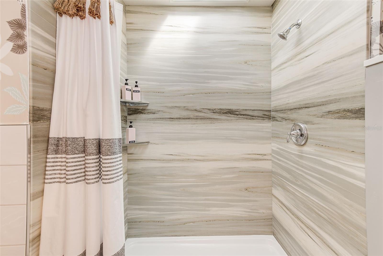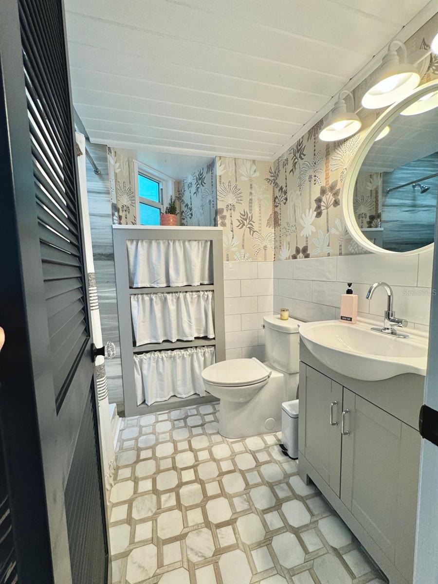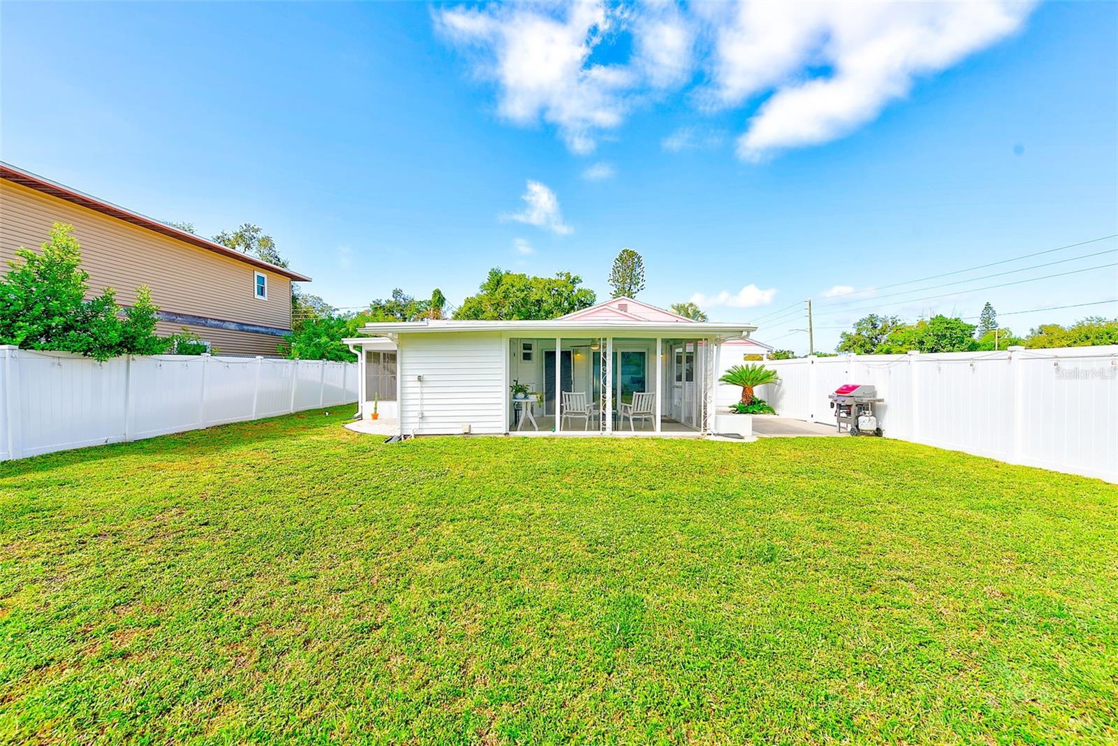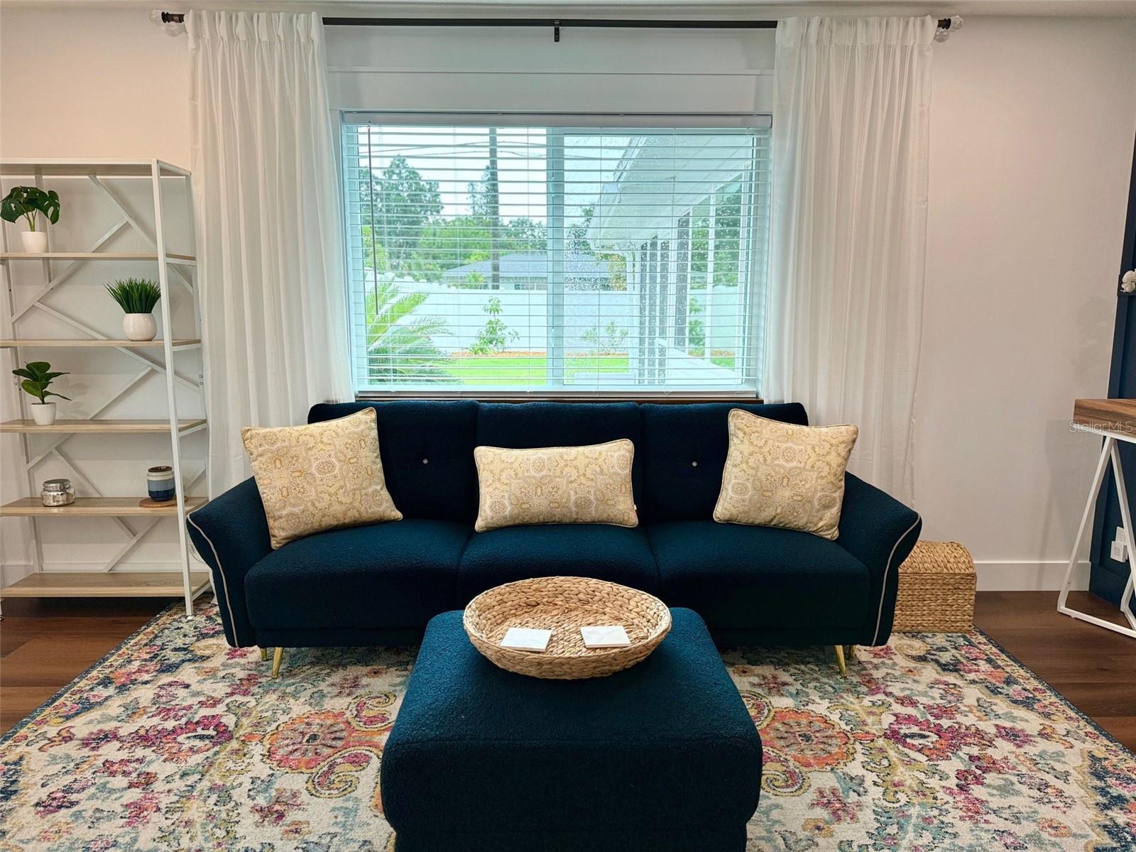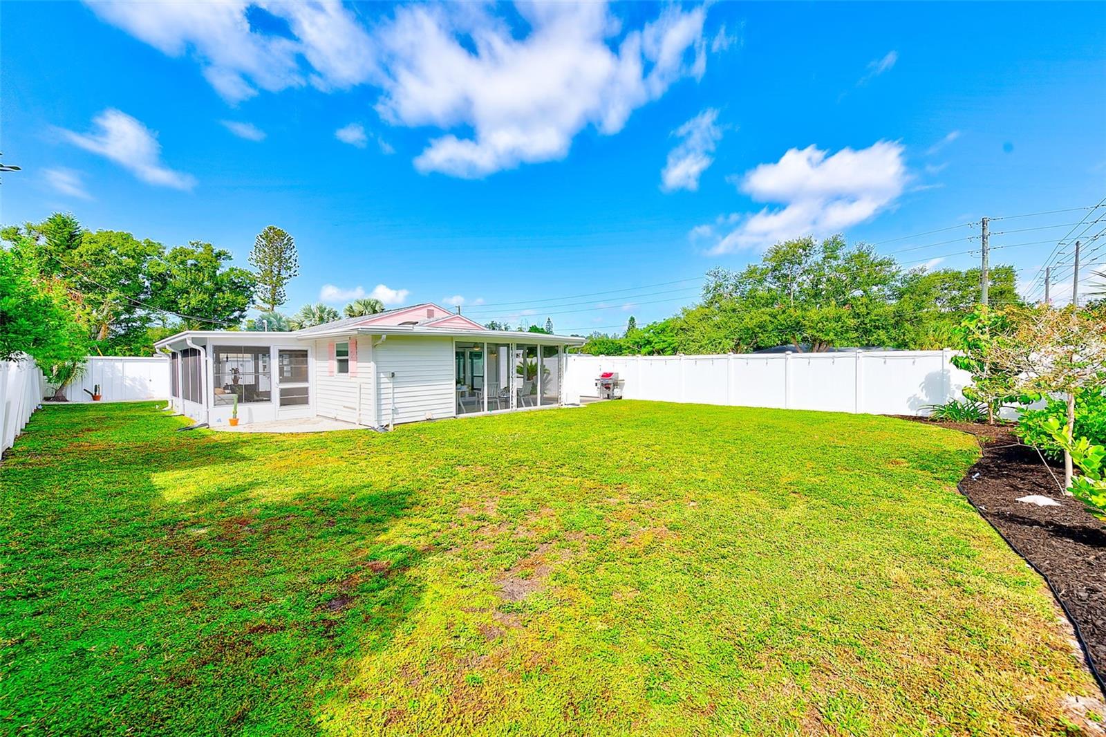 Welcome to an impeccably remodeled 2-bedroom, 3-bath home on a handsome corner lot with room to add a pool — in a full no-flood zone, less than 10 minutes from the beaches of Treasure Island, Madeira Beach and St. Pete Beach, and only 10-15 minutes to vibrant downtown St. Petersburg. Inside, the style feels entirely custom-designed: luxury vinyl plank flooring throughout, three beautifully finished bathrooms with distinctive tile work, and abundant attention to detail. The third full bath (recently constructed with future pool plans in mind) is sleek and modern; the second bath is a statement room with oversized polished porcelain tile (60×120), a freestanding tub set against a deep blue vertical tile accent wall and a floating wood vanity with brushed-gold fixtures; the primary bath exudes spa-like elegance with marble-look wall tile, hexagonal floor tile and a slatted wood-vanity design. The kitchen is full of personality and charm: butcher-block countertops paired with light-blue upper and white lower cabinets, stainless-steel appliances, an island cooktop and a bay window at the sink. In the adjacent dining area, custom window bench seating complements a matching butcher-block table, and skylights overhead flood the space with bright, cheerful natural light. Major systems and structural upgrades have been completed 2023-2024: new HVAC with ductwork, full 200-amp electrical service and panel, hurricane-impact sliders & windows, fresh exterior paint (2024), new vinyl privacy fence and gating for vehicle/boat/RV storage, programmable outdoor lighting, well-pump irrigation system, and two large aluminum storage sheds (16×8 & 7×6) for generous storage without rust. Mature Peruvian Apple cacti anchor the landscaping, together with recently planted palms, avocado and orange trees — a lush backdrop that complements the clean modern interiors. This home is truly move-in ready, thoughtfully updated from top to bottom, offering designer styling, peace of mind, and a prime location.