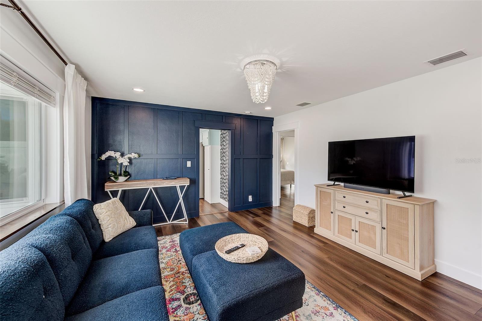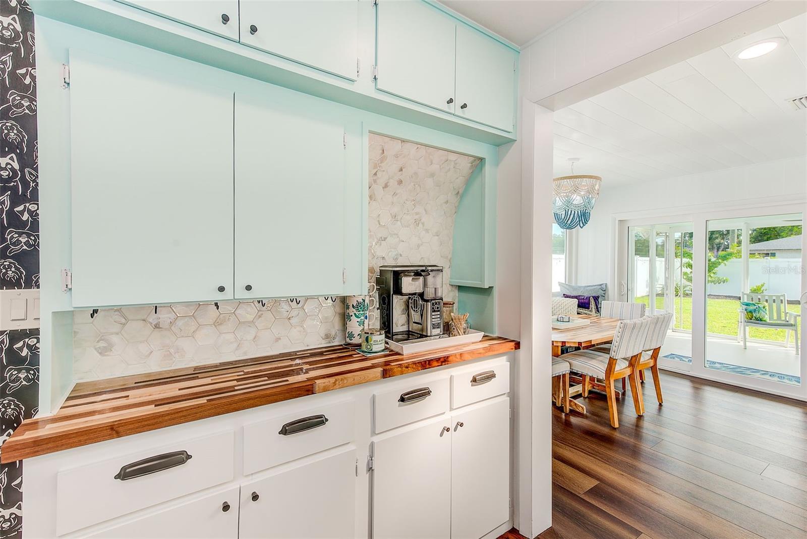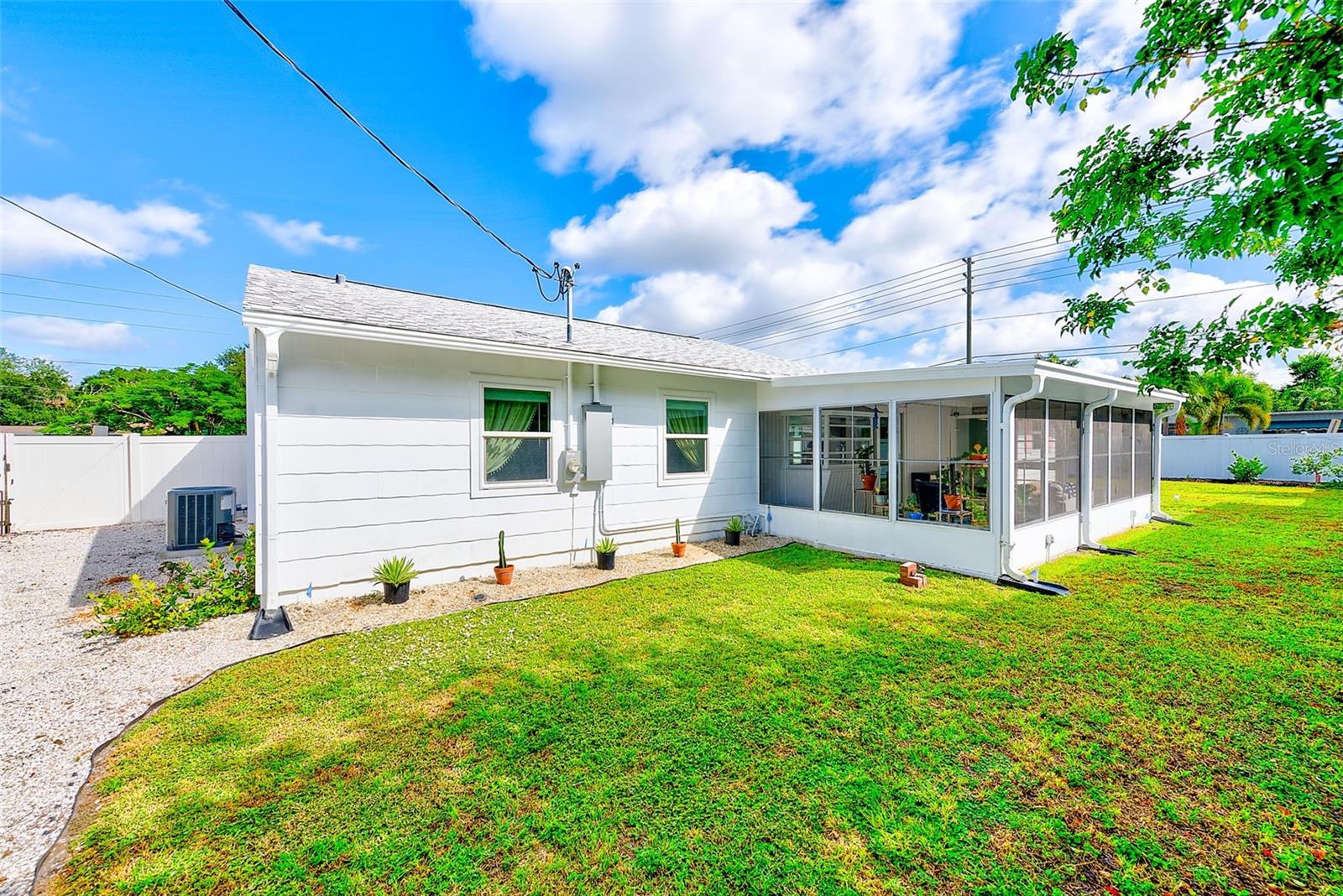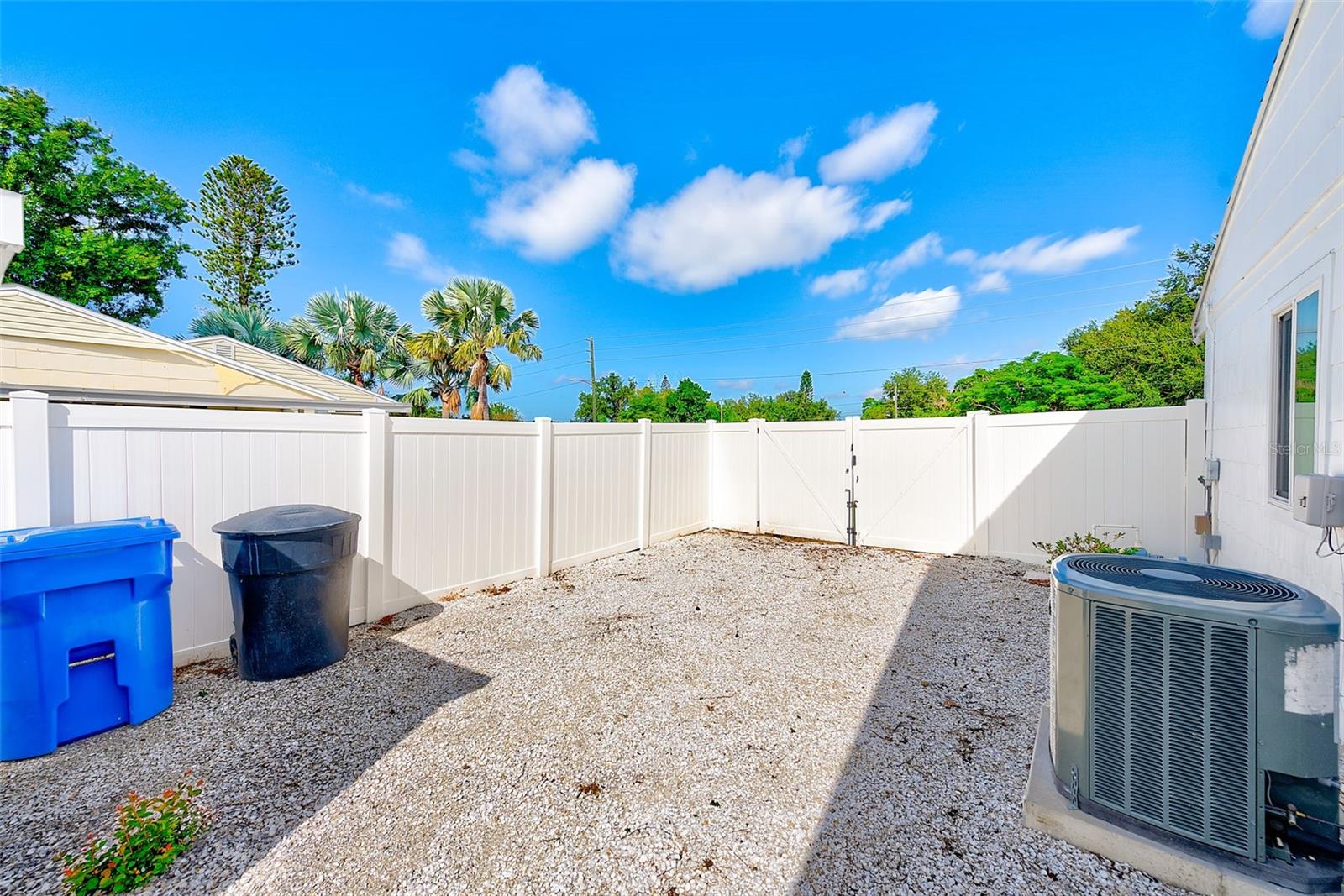 Welcome to an impeccably remodeled 2-bedroom, 3-bath home on a handsome corner lot with room to add a pool — in a full no-flood zone, less than 10 minutes from the beaches of Treasure Island, Madeira Beach and St. Pete Beach, and only 10-15 minutes to vibrant downtown St. Petersburg. Inside, the style feels entirely custom-designed: luxury vinyl plank flooring throughout, three beautifully finished bathrooms with distinctive tile work, and abundant attention to detail. The third full bath (recently constructed with future pool plans in mind) is sleek and modern; the second bath is a statement room with oversized polished porcelain tile (60×120), a freestanding tub set against a deep blue vertical tile accent wall and a floating wood vanity with brushed-gold fixtures; the primary bath exudes spa-like elegance with marble-look wall tile, hexagonal floor tile and a slatted wood-vanity design. The kitchen is full of personality and charm: butcher-block countertops paired with light-blue upper and white lower cabinets, stainless-steel appliances, an island cooktop and a bay window at the sink. In the adjacent dining area, custom window bench seating complements a matching butcher-block table, and skylights overhead flood the space with bright, cheerful natural light. Major systems and structural upgrades have been completed 2023-2024: new HVAC with ductwork, full 200-amp electrical service and panel, hurricane-impact sliders & windows, fresh exterior paint (2024), new vinyl privacy fence and gating for vehicle/boat/RV storage, programmable outdoor lighting, well-pump irrigation system, and two large aluminum storage sheds (16×8 & 7×6) for generous storage without rust. Mature Peruvian Apple cacti anchor the landscaping, together with recently planted palms, avocado and orange trees — a lush backdrop that complements the clean modern interiors. This home is truly move-in ready, thoughtfully updated from top to bottom, offering designer styling, peace of mind, and a prime location.