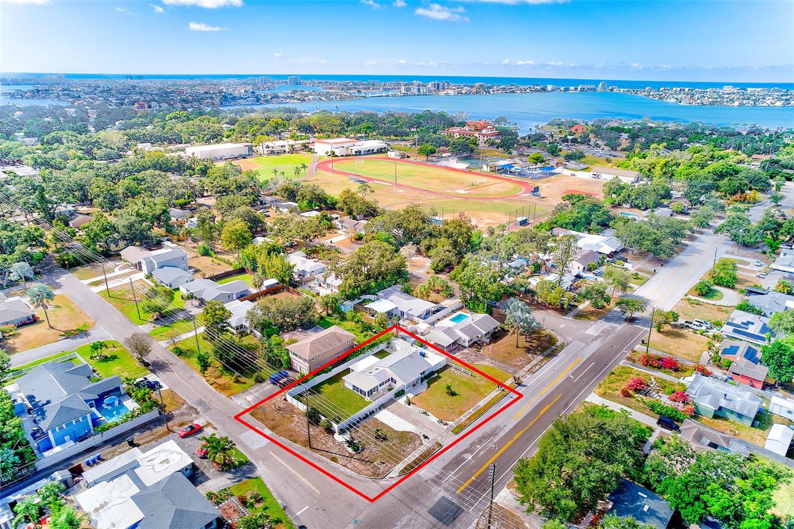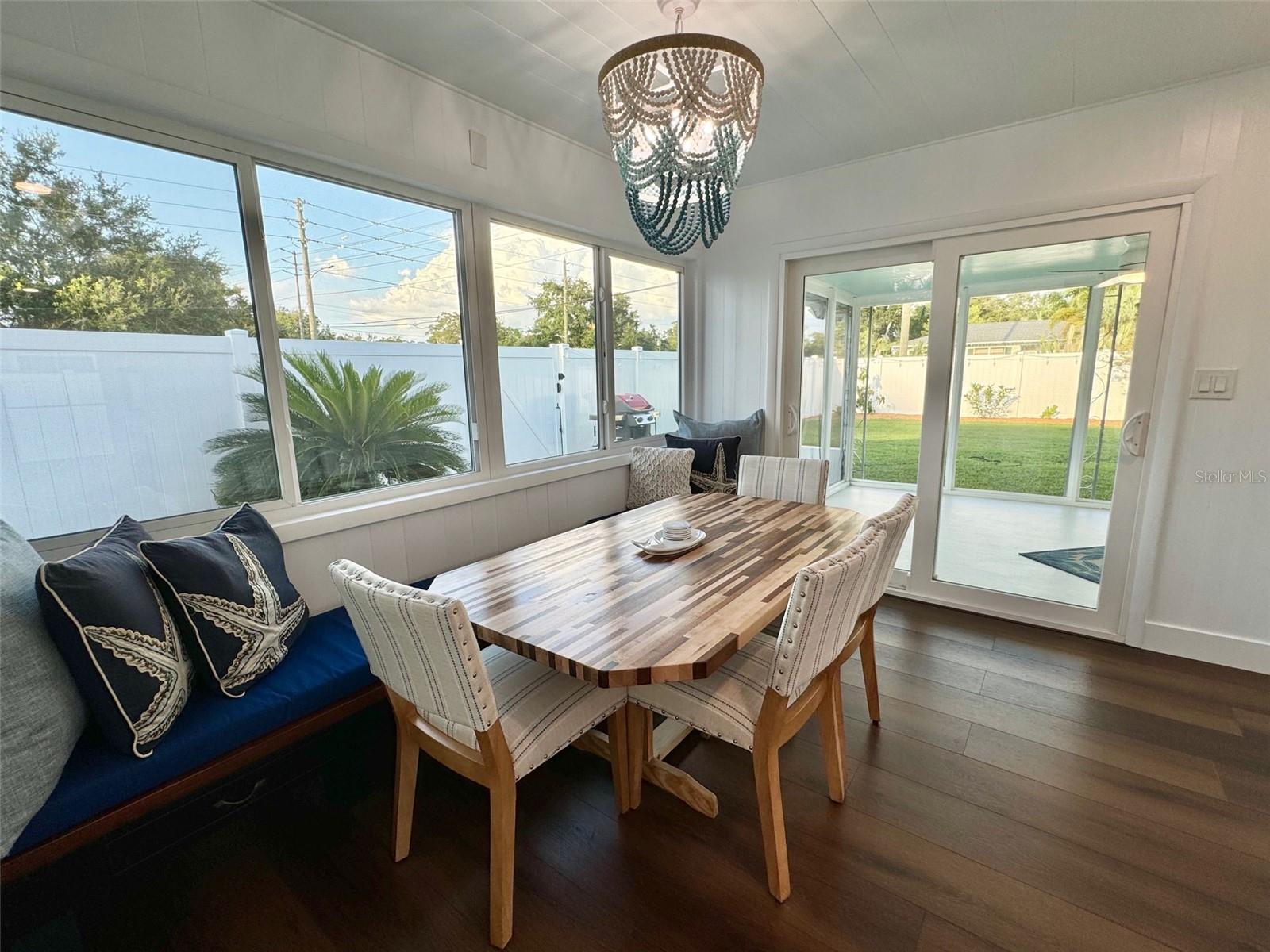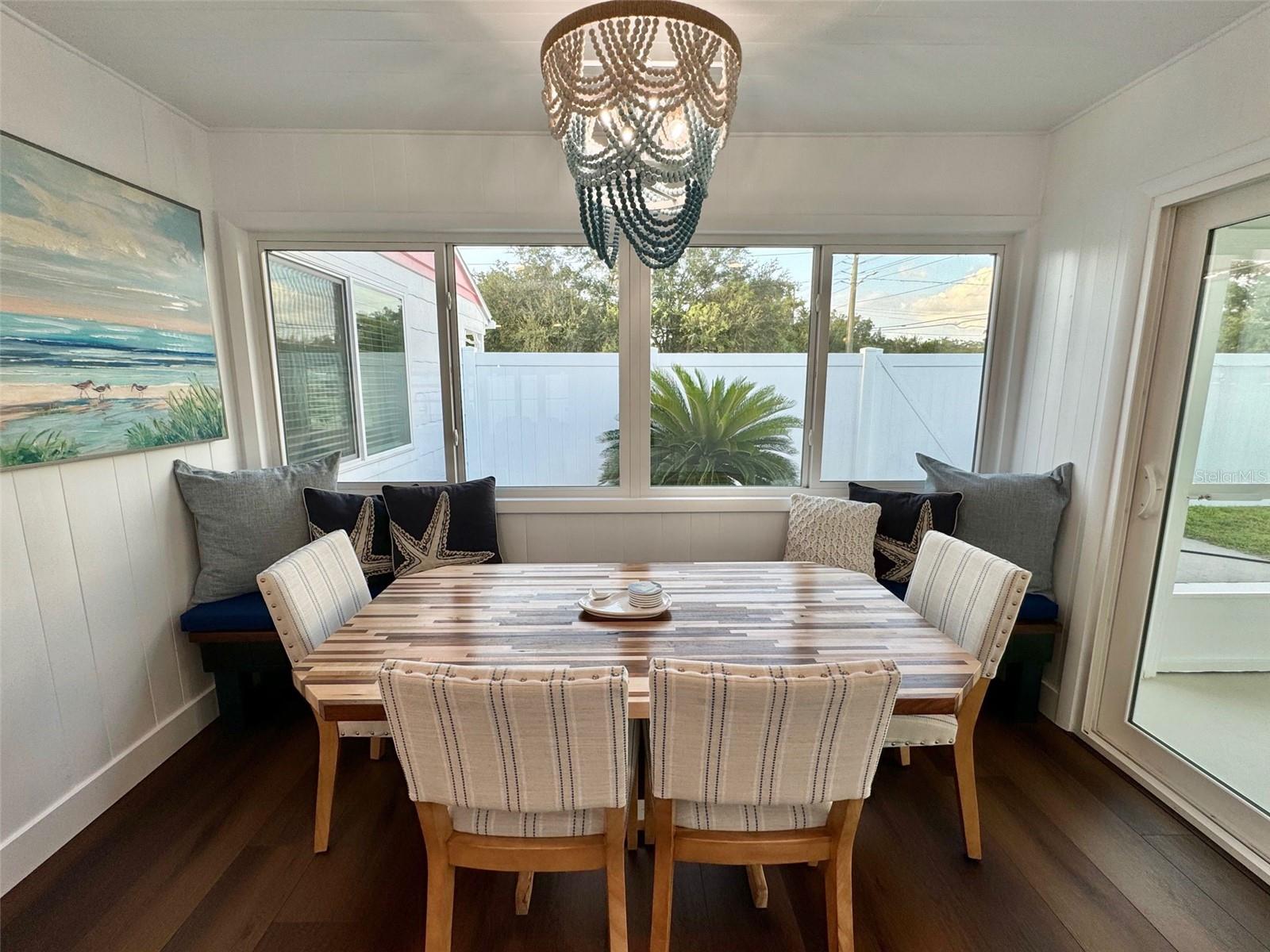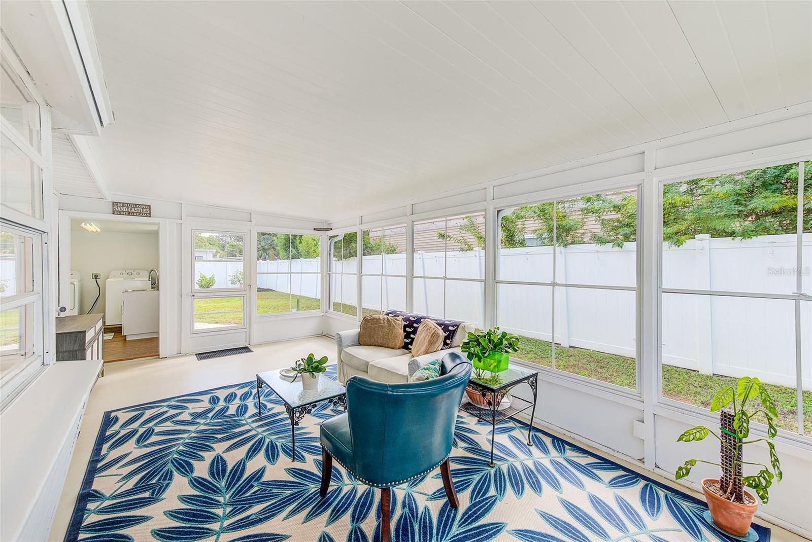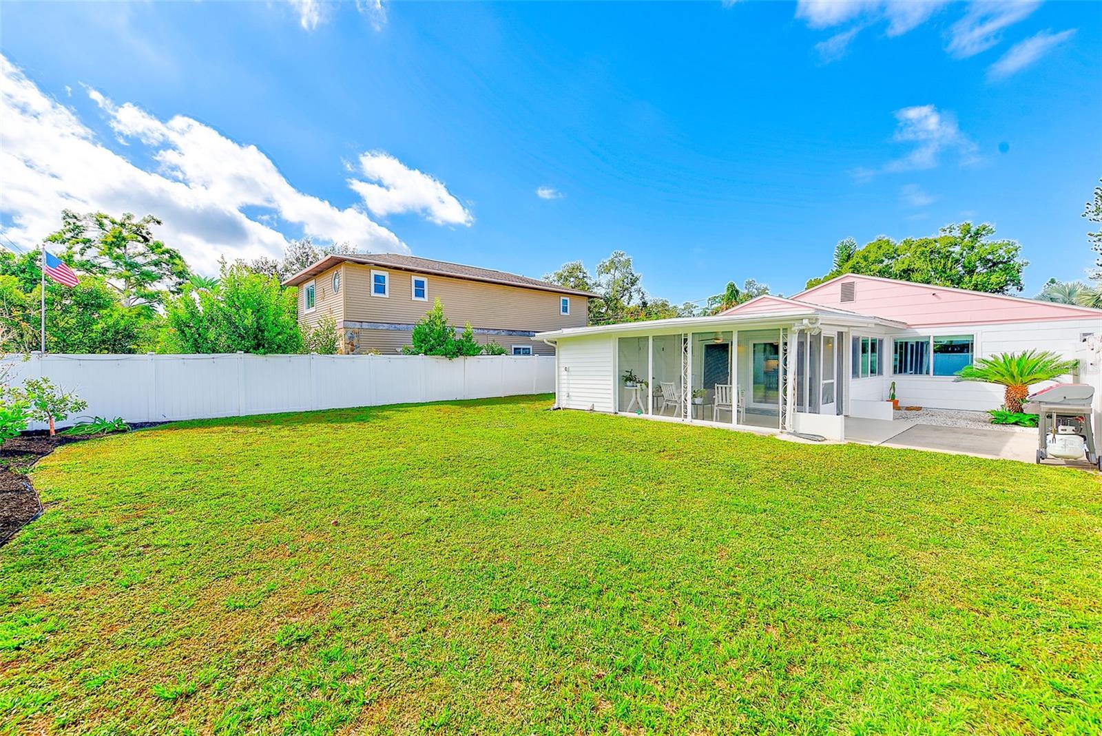 Welcome to an impeccably remodeled 2-bedroom, 3-bath home on a handsome corner lot with room to add a pool — in a full no-flood zone, less than 10 minutes from the beaches of Treasure Island, Madeira Beach and St. Pete Beach, and only 10-15 minutes to vibrant downtown St. Petersburg. Inside, the style feels entirely custom-designed: luxury vinyl plank flooring throughout, three beautifully finished bathrooms with distinctive tile work, and abundant attention to detail. The third full bath (recently constructed with future pool plans in mind) is sleek and modern; the second bath is a statement room with oversized polished porcelain tile (60×120), a freestanding tub set against a deep blue vertical tile accent wall and a floating wood vanity with brushed-gold fixtures; the primary bath exudes spa-like elegance with marble-look wall tile, hexagonal floor tile and a slatted wood-vanity design. The kitchen is full of personality and charm: butcher-block countertops paired with light-blue upper and white lower cabinets, stainless-steel appliances, an island cooktop and a bay window at the sink. In the adjacent dining area, custom window bench seating complements a matching butcher-block table, and skylights overhead flood the space with bright, cheerful natural light. Major systems and structural upgrades have been completed 2023-2024: new HVAC with ductwork, full 200-amp electrical service and panel, hurricane-impact sliders & windows, fresh exterior paint (2024), new vinyl privacy fence and gating for vehicle/boat/RV storage, programmable outdoor lighting, well-pump irrigation system, and two large aluminum storage sheds (16×8 & 7×6) for generous storage without rust. Mature Peruvian Apple cacti anchor the landscaping, together with recently planted palms, avocado and orange trees — a lush backdrop that complements the clean modern interiors. This home is truly move-in ready, thoughtfully updated from top to bottom, offering designer styling, peace of mind, and a prime location.