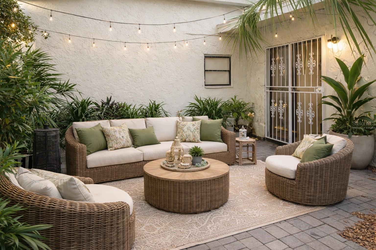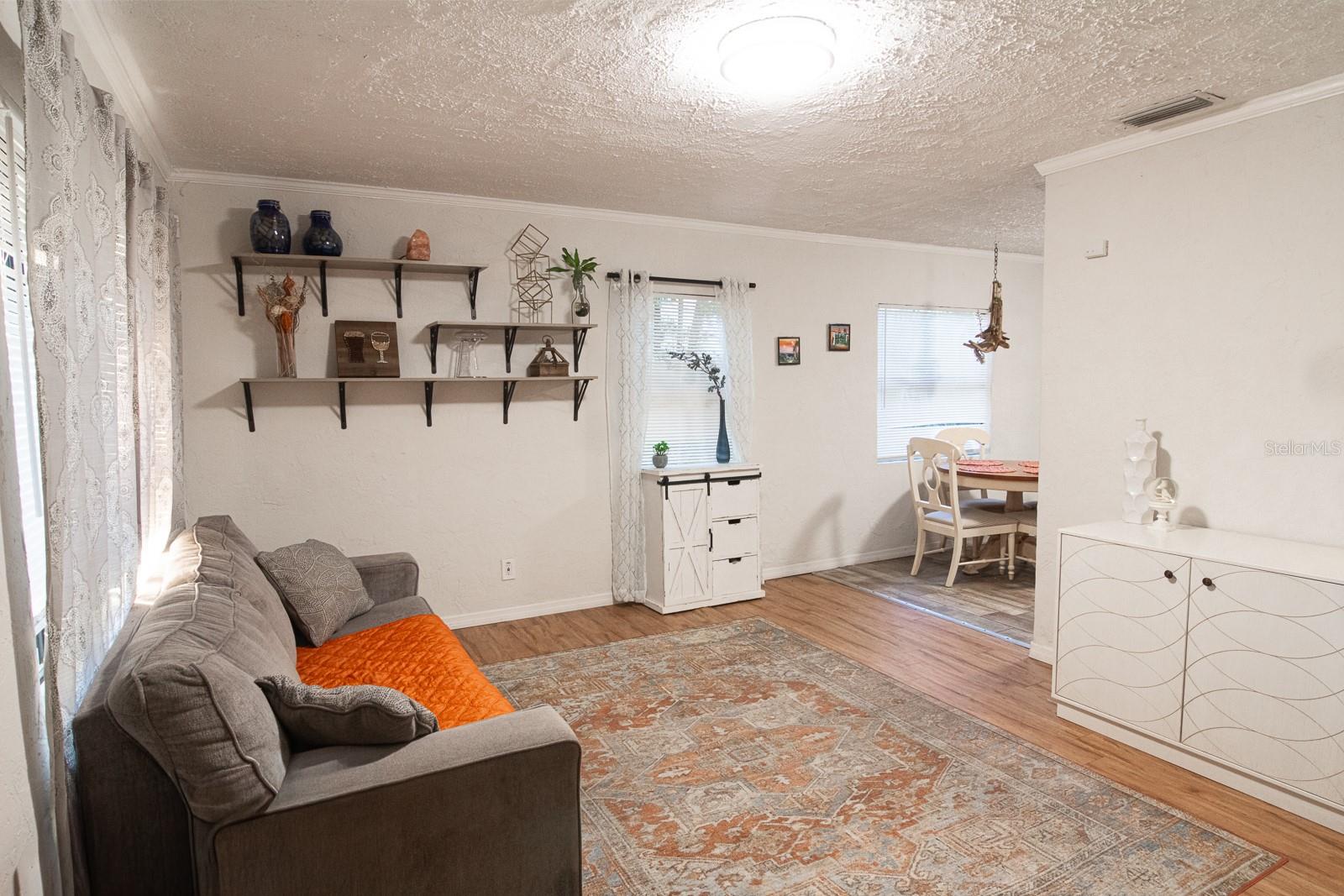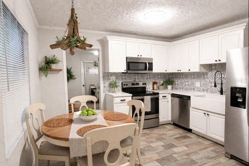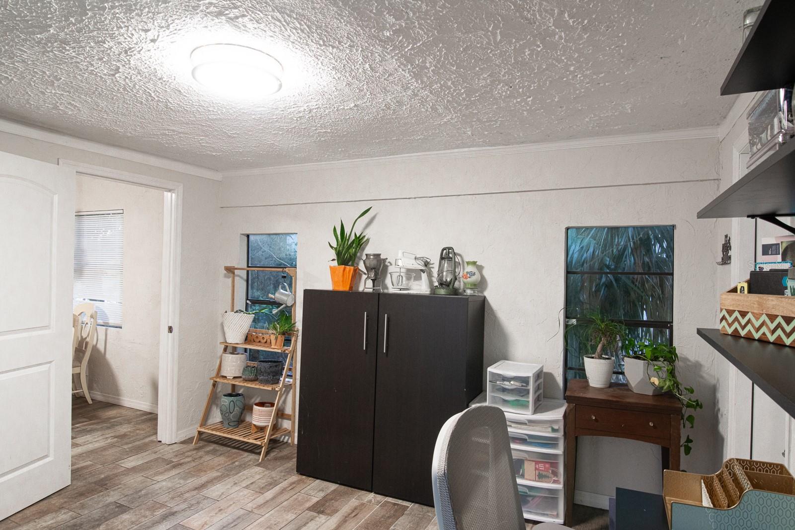 One or more photo(s) has been virtually staged. This charming St. Pete bungalow offers 2 bedrooms, 1 bathroom, plus a versatile flex space and a one car garage. The versatile space could be used as a den, office or converted into a 3rd bedroom. This bungalow was thoughtfully updated in 2021 including solid surface countertops, crisp white cabinetry, gorgeous tile backsplash, a farm sink. The kitchen includes stainless-steel appliances replaced in 2021 and the refrigerator was replaced in 2023. Ceramic tile flooring enhances the kitchen and flex space, while luxury vinyl plank flooring flows through the living room and bedrooms. The arched doorways and crown molding add endearing character to the space. For added peace of mind the HVAC and water heater were replaced in 2021, and the roof was replaced in 2017. The plumbing in the entire house was replaced in 2025 and comes with a lifetime warranty. The washing machine and dryer convey with the property. Enjoy outdoor living with a paver patio and walkway added in 2022 perfect for relaxing or entertaining. Additional highlights include a one-car garage and inviting curb appeal, located within minutes of downtown St. Petersburg and the beaches. This home qualifies for 100% financing with no PMI, no income restrictions and no down payment through our Preferred Lender. Please contact me for more details. This home has everything you need to become a first-time home buyer. Please call today for your private showing and more information about the special loan program.