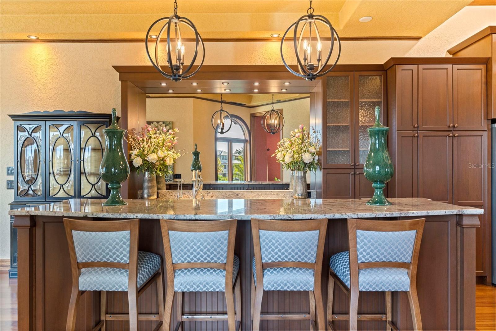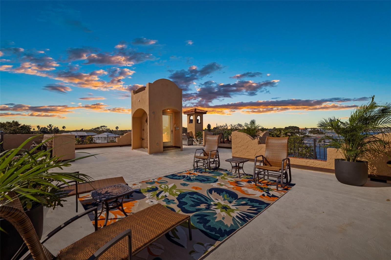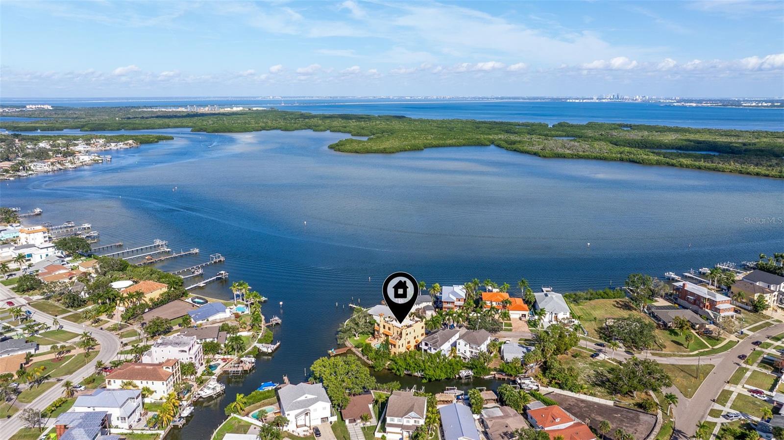 Commanding a premier position at the point of Bayou Grande, this Mediterranean-inspired waterfront residence offers architectural presence, expansive water views, and exceptional construction. Built with solid block from ground floor to rooftop, the home delivers 4,456 square feet of heated living space and 7,155 total square feet, designed across multiple levels to maximize light, views, and functionality. A dramatic arched entry, custom carved wood doors, and a grand staircase with intricate iron detailing introduce the craftsmanship found throughout. Brazilian cherry floors, custom imported mahogany crown moldings, detailed trim, and soaring ceilings on the main living level and upper floors create an expansive and refined atmosphere. The main living areas showcase the setting with walls of high-end Pella hurricane windows and doors framing uninterrupted water views and filling the home with natural light, anchored by a marble gas fireplace. Multiple gathering spaces flow seamlessly, ideal for entertaining and everyday living. The kitchen is anchored by natural gas service and designed for both function and style, featuring extensive cabinetry, stone countertops, a large center island, Wolf appliances, a wine refrigerator, and separate refrigerator and freezer drawers. A mirrored bar area with built-in wine storage adds an additional layer of sophistication while remaining visually connected to the living areas and water views. Outdoor living is exceptional, featuring a resort-style pool alongside a brand new composite dock with electrical for a future boat lift and a thoughtfully designed seawall cutout that creates a natural ramp directly into the water for launching kayaks and paddleboards. A rear-facing garage allows effortless access, making it easy to carry water toys straight from the garage into the bay. The point lot provides wide open Tampa Bay views, calm protected water frontage, and enhanced privacy. The upper levels offer a well planned bedroom layout with excellent separation. The primary suite captures panoramic water views and features a large custom walk-in closet and a spa-like bathroom with custom cabinetry, a separate Jacuzzi tub, and a spacious glass-enclosed steam shower. Guest suites are generously sized and well appointed, including high-end finishes such as heated bathroom floors. A private elevator provides seamless access from the ground level garages to the expansive rooftop terrace. Plumbed for an outdoor kitchen with gas, the rooftop offers sweeping views across Tampa Bay and surrounding waterways, creating an ideal setting for entertaining or quiet evenings. Additional features include a 6+ car garage with space for vehicles, water toys, and golf carts. A separate tiled and finished portion of the garage offers flexible use as a poolside retreat, gym, recreation space, or overflow entertaining area. Abundant storage, a 2020 roof, solid block construction, a two-zone HVAC system, and a natural gas water heater complete the home. Located in one of NE St Pete's true waterfront neighborhoods directly on Tampa Bay, residents enjoy easy access to Islander Market, A-rated Shore Acres Elementary, waterfront parks, and local dining and shopping. The location allows travel by bike, golf cart, or boat to downtown St. Pete. With no bridges to the Gulf of Mexico, this is an exceptional boating location offering world-class fishing and water access. This home delivers refined design and a true Tampa Bay lifestyle.