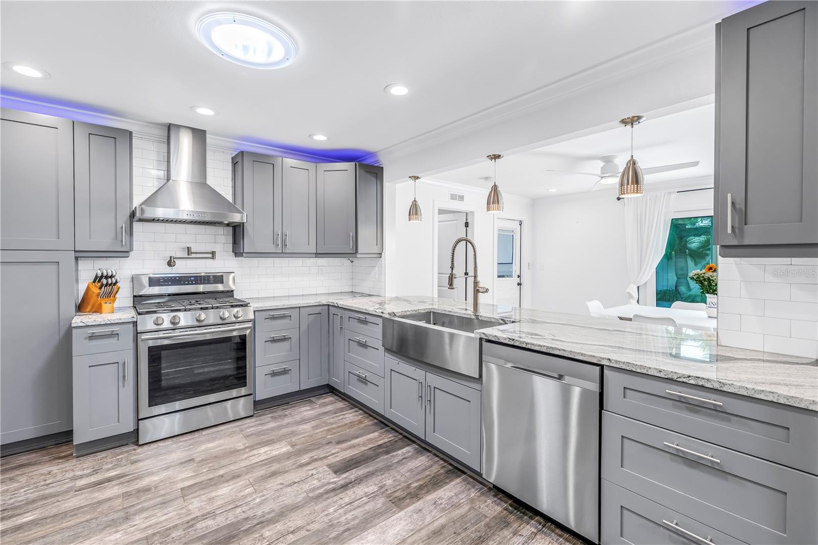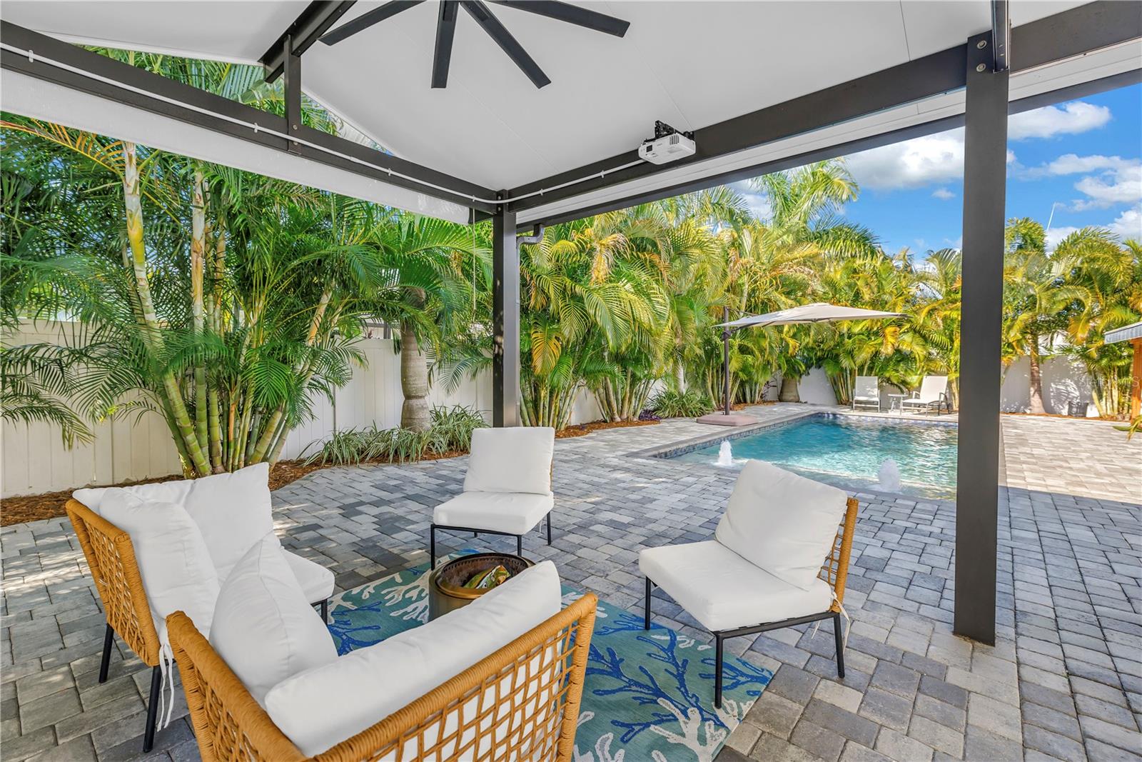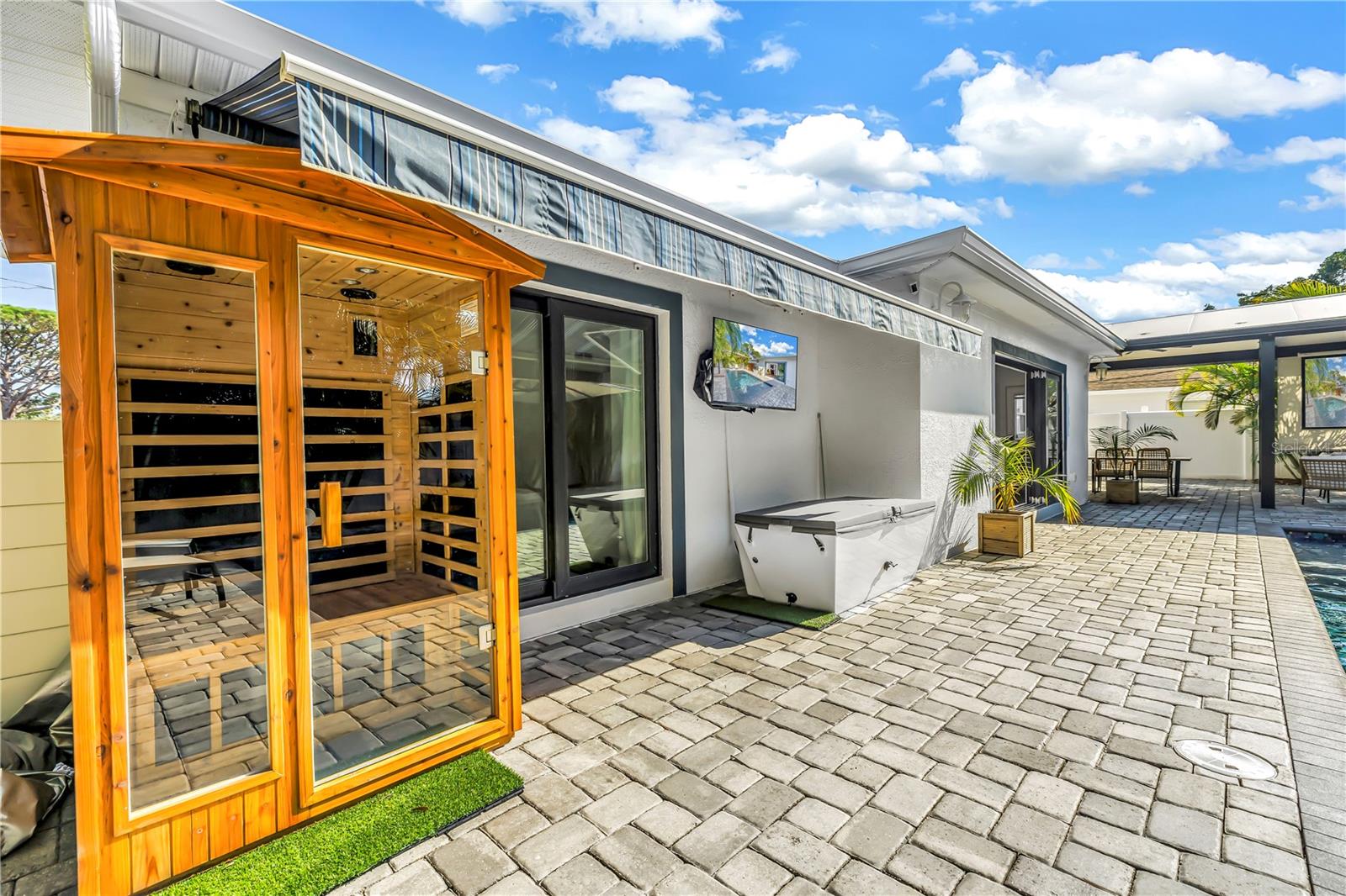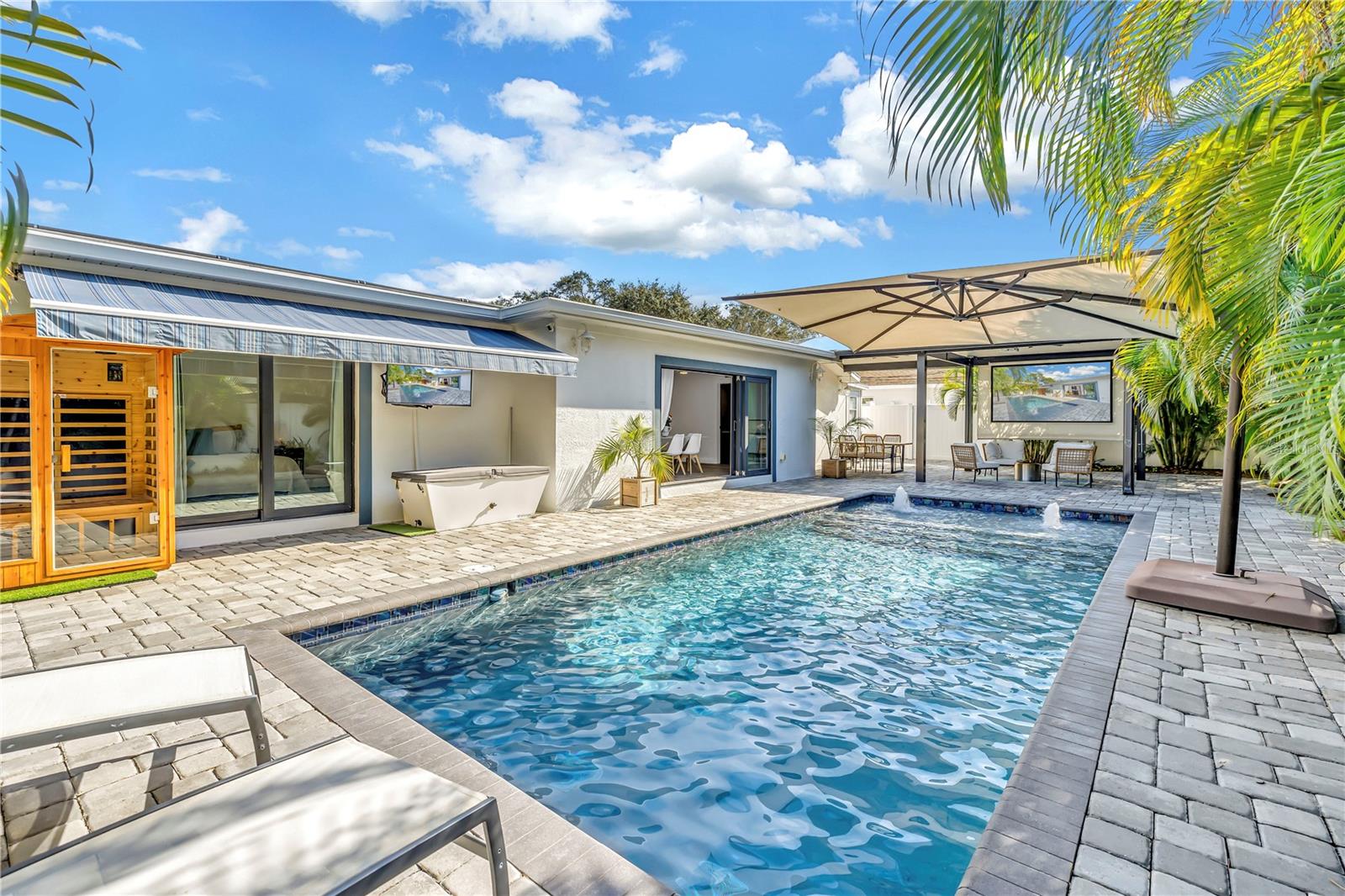 This home is truly resort living! Located just minutes from vibrant downtown St. Petersburg, this beautifully renovated home has so much to offer! Situated in desirable Flood Zone X, the property was fully renovated between 2019–2020 and is truly move-in ready. The open, split-bedroom floor plan is perfect for entertaining and easy living. The stunning kitchen features Samsung stainless steel appliances, granite countertops, skylights, and a seamless flow into the living and dining areas. A custom dry bar with wine refrigerator adds the perfect touch for hosting. The family/dining room features a sleek electric fireplace and opens through sliding doors to the expansive outdoor patio. Both bathrooms have been thoughtfully updated and include Bluetooth speaker/light features. All four bedrooms are generously sized. This home is packed with high-value upgrades, including a new roof (2019), hurricane-impact windows and doors, a hurricane-rated garage door, natural gas connection, NEST thermostat, solar panels (paid in full) for low electric bills, a workshop, and a well pump for irrigation. The two-car garage includes two EV charging plugs and a freshly painted floor. Step outside to your fully fenced, private backyard oasis with large palm trees that offer full privacy, pavers, and turf ideal for a dog run. The show-stopping solar-heated pool features a sun shelf, deep-water bench, iridescent tile accents, and two water features. Outdoor amenities continue with a pergola equipped with a projector and screen, a retractable awning, and a dedicated sauna and cold plunge, making this the place for perfect for year round entertaining and enjoyment. With its unbeatable location, extensive upgrades, and resort-style amenities, this exceptional home offers the best of Florida living—just unpack and enjoy.