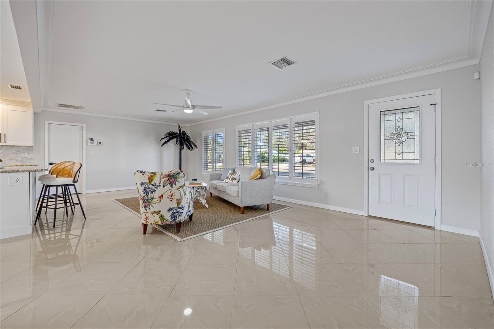 Renovated, refreshed, and ready for you—this stunning 3/2 in Northeast St. Pete is the definition of move-in ready! Set on a quiet, tree-lined street in Northeast St. Pete—with the best kind of neighborhood perks: walk right out of your driveway to a kayak launch, and left to a charming wooden bridge over the water leading to a beautiful park! From the moment you arrive, the circular drive, tropical landscaping, and charming cupola set the tone- then step inside to a bright open layout designed for easy Florida leaving! The open-concept living room featuring crown molding, sun filled picture windows with custom plantation shutters, and an inviting flow into the eat-in kitchen with top-of-the-line appliances are perfect for everyday living and entertaining. You'll love the gorgeous ceramic tile floors throughout the main areas, with luxury vinyl in the bedrooms for comfort and durability. Tucked behind a pocket door entry, the bedroom wing offers privacy and smart function, featuring a spacious primary suite with a walk-in closet and an en-suite bath with decorative tile in the master shower and a charming vanity with standout character. Two additional generously sized bedrooms include great closet space and share a perfectly appointed second bathroom, plus a hall closet for extra storage. Out back, enjoy the best of indoor/outdoor living—triple sliding glass doors open to a covered patio with pavers, already equipped with gas for your grill and ready to become your dream outdoor kitchen. The fully fenced yard adds privacy for pets, play, or entertaining, and the home also includes a 1-car garage with laundry area and cabinets, for added convenience. The location is hard to beat—convenient to the beautiful Gulf beaches, minutes to the Howard Frankland Bridge and Tampa International Airport, and just a quick drive to vibrant Downtown St. Pete. This home has been pre-inspected and is truly turnkey—just move in and start enjoying the lifestyle. Schedule your private showing today
