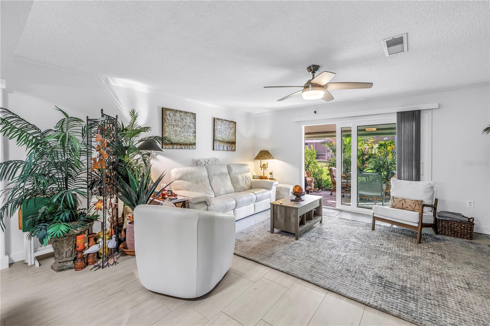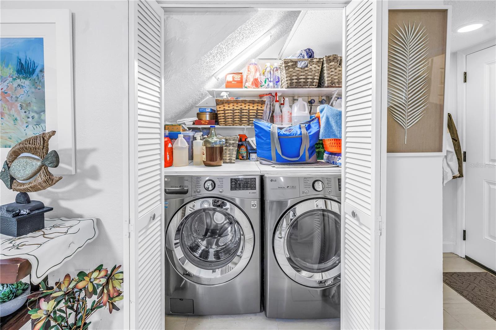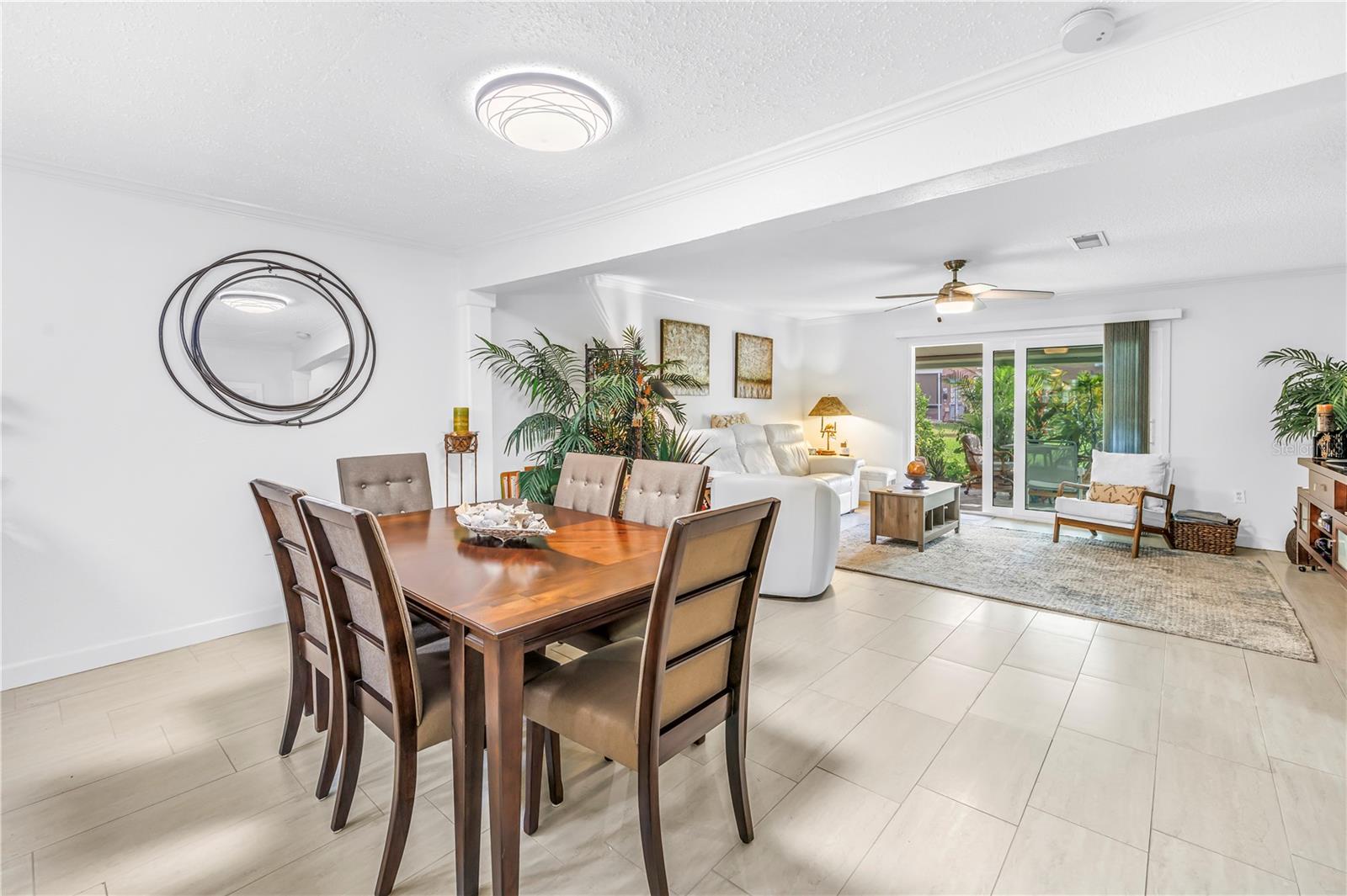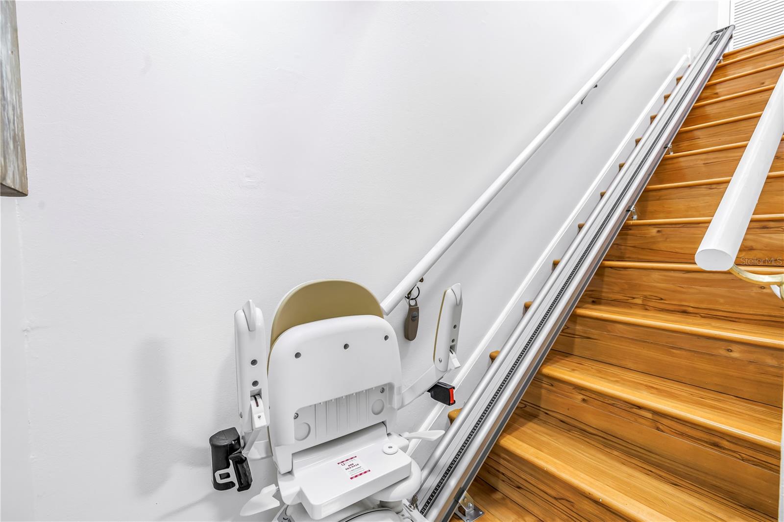 When you step inside this rarely available Patriot Square townhome, you’re immediately welcomed by an updated kitchen that opens seamlessly to the dining and living areas, creating an inviting and open floor plan ideal for both everyday living and entertaining. The remodeled kitchen features granite countertops, custom cabinetry, tiled backsplash, and stainless-steel appliances, while attractive tile flooring flows throughout the entire first level. The dining and living rooms are accented with crown molding, tall baseboards, and impact sliding glass doors that lead to a charming covered and screened lanai. This peaceful outdoor space overlooks tasteful landscaping and a quaint courtyard, the perfect spot to enjoy your morning coffee or unwind at the end of the day. A convenient half bath is located on the main floor for guests, and the washer and dryer have been thoughtfully relocated to a closet under the stairs for added functionality. Upstairs, you’ll find two spacious bedrooms and two full bathrooms. The primary suite features deep closet, and an updated en-suite with dual sinks, granite counters, and a large walk-in shower. The guest bedroom is generously sized with a walk-in closet and access to an updated guest bath, providing comfort and privacy for visitors. Additional features include hurricane impact windows and doors throughout and a chairlift for easy access to the second floor. Located in the heart of the Skyway Marina District is the gated 55+ community of Patriot Square, residents enjoy two pools, tennis, shuffleboard, and a recreation building all just minutes from Gulf beaches, Downtown St. Pete, shopping, dining, the Pinellas Trail, and I-275. Flood Insurance included in HOA fee. This exceptional townhome truly offers the best of comfort, style, and location.