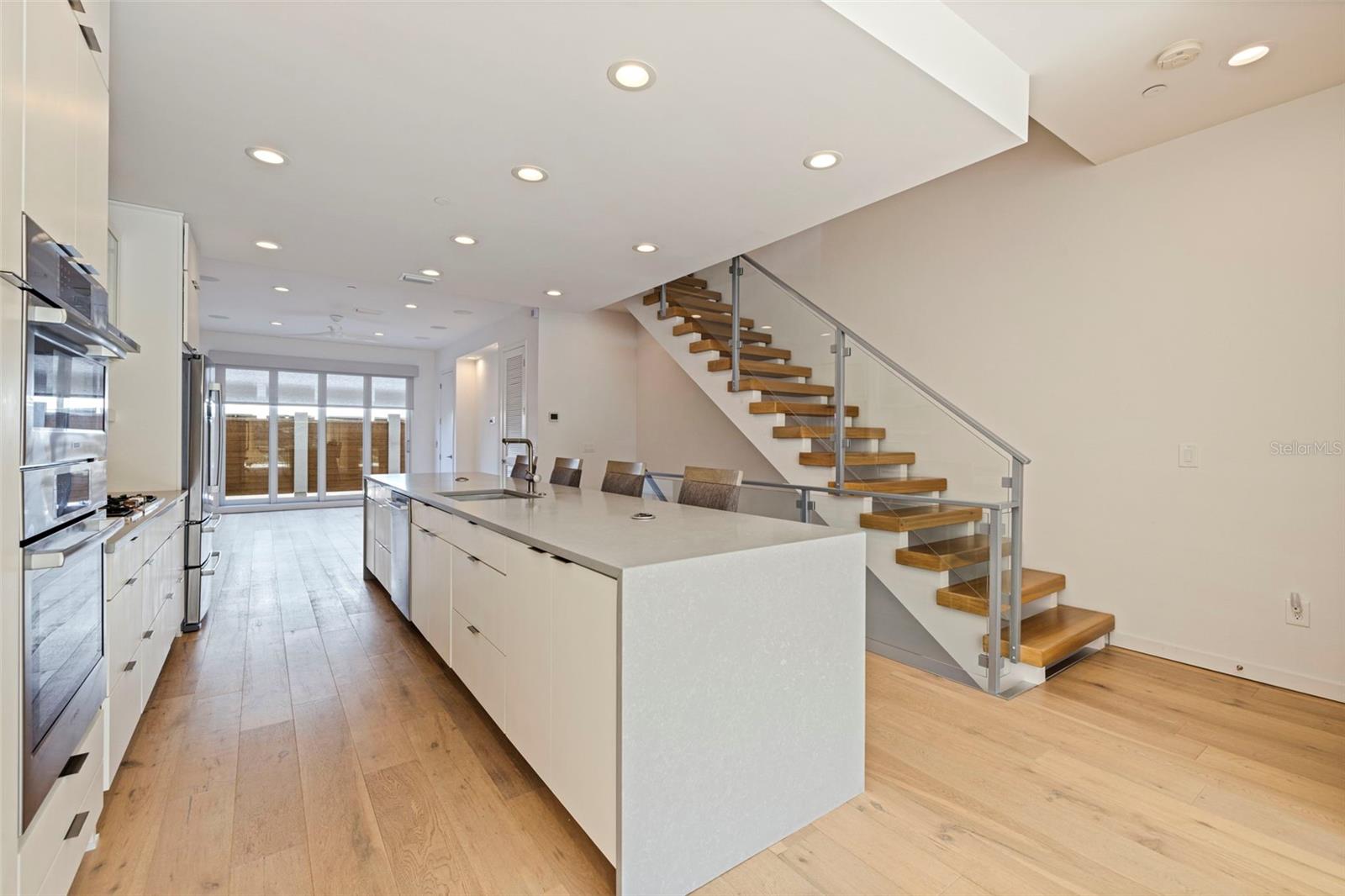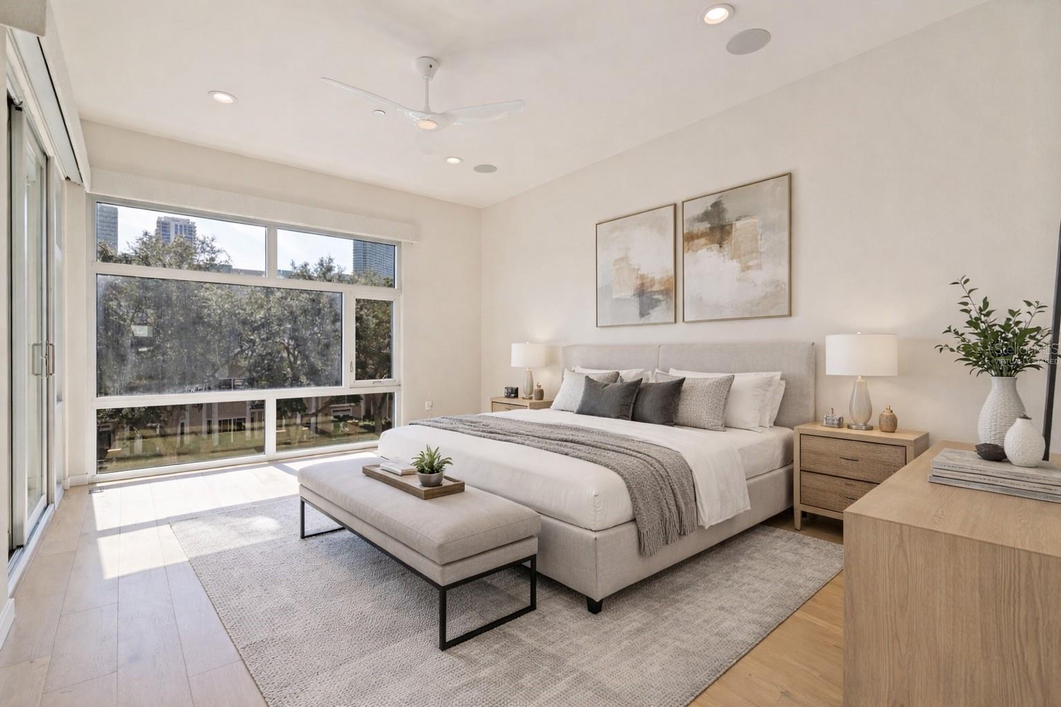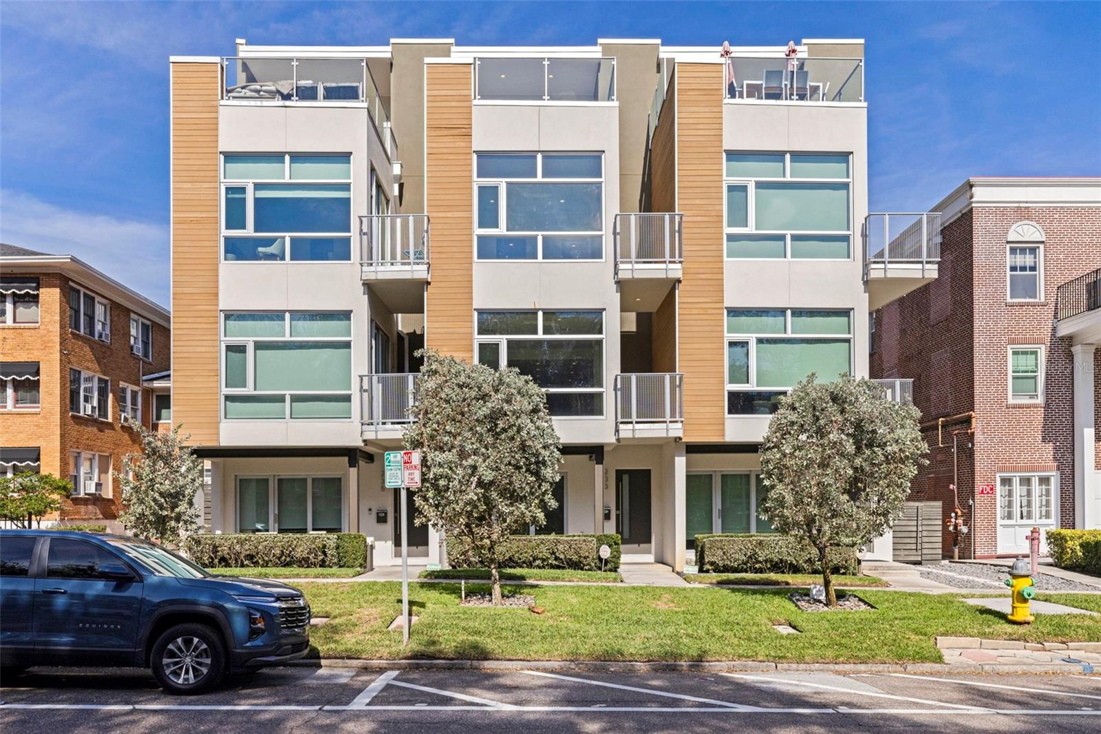 One or more photo(s) has been virtually staged. LIV233 is an exclusive boutique enclave of three luxury townhomes ideally located near Beach Drive, The Vinoy, and the heart of Downtown St. Pete. These four-story, three-bedroom, 4.5-bath plus den contemporary residences feature private elevators, full home automation, surround sound on every level, custom open staircases with glass railings, floor-to-ceiling windows, three balconies, and a private rooftop terrace with views. The chef’s kitchen offers a 14-foot island, waterfall-edge quartz countertops, floor-to-ceiling wood cabinetry, gas range, wine cooler, and Bosch appliances. French white oak and ceramic tile flooring flow throughout. The primary suite includes a private balcony, dual walk-in closets, soaking tub, walk-in shower, and double-sink vanity. Masonry construction with contemporary cypress accents, expansive private outdoor space, one garage space, one covered exterior space, and private storage complete this exceptional offering.