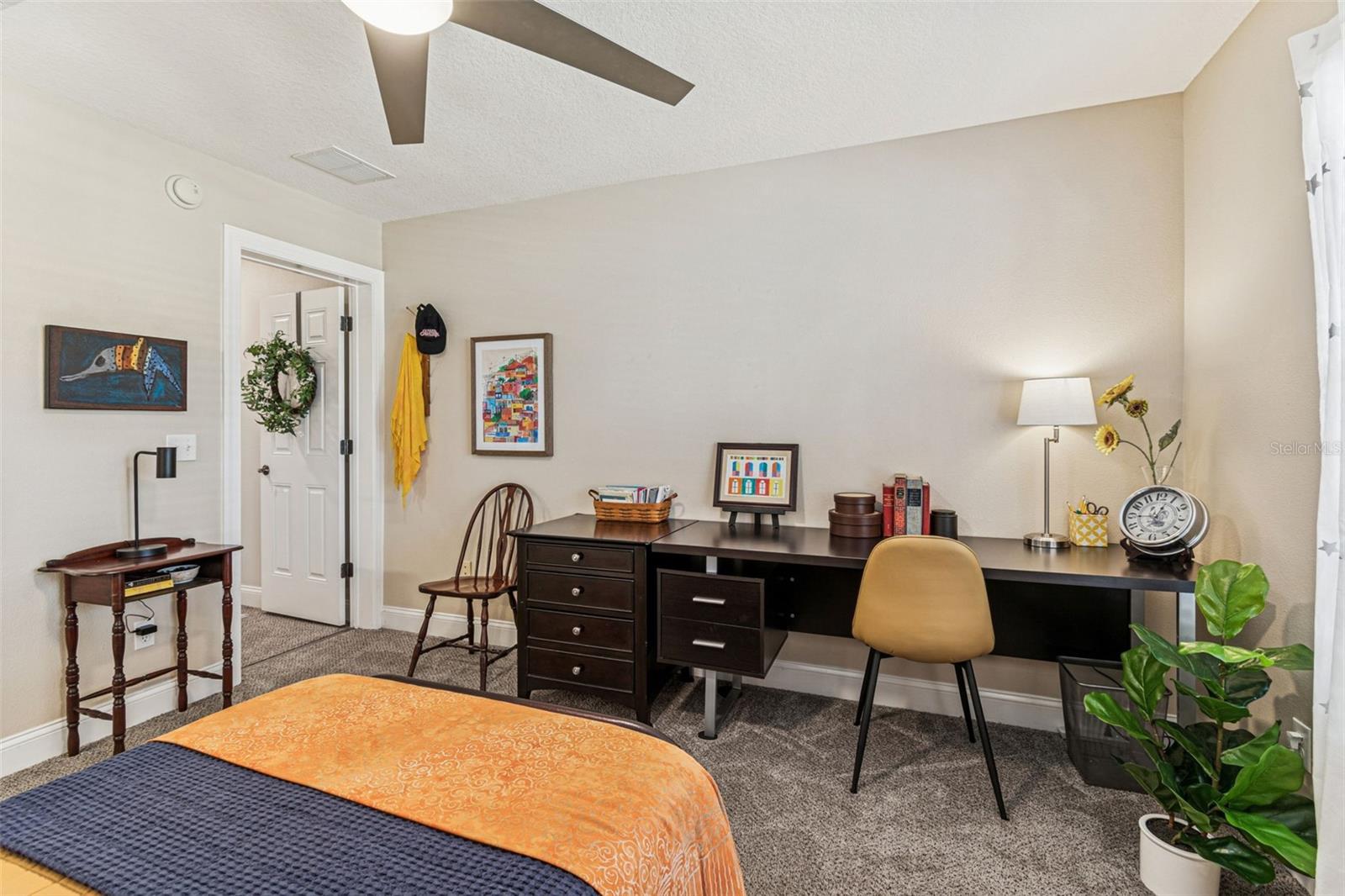 $10,000 credit is offered by seller at closing and may be used towards an interest rate buy-down, closing costs, fees or other buyer preferences. This home offers a beautifully updated residence designed for modern living, entertaining and working from home. The recently remodeled kitchen is both elegant and highly functional, featuring custom quartz countertops with striking gold and gray veining, open shelving, a large pantry and a built-in quartz desk with file storage and cabinetry—Ideal For a Home Office. A stunning oversized quartz island provides seating for four and includes additional cabinetry, a built-in pet feeding station, and dedicated space for books and a printer. The first floor also offers two distinct living areas currently used as a reading space and an entertainment area with a three-door glass built-in console, Motorized Custom Shades and a fully remodeled and stylish powder room. French Doors on the main level lead to a newly screened porch with low-maintenance Trex Flooring that overlooks a Pond with Fountain. Upstairs, the spacious primary suite features open shelving, French Doors leading to a recently sealed balcony deck and a motorized hurricane shutter. The primary bath includes a custom shower and tub area and a generous walk-in closet accented by a beautiful chandelier. Two additional bedrooms offer flexibility for sleeping, working, or both, each with walk-in closets. The second-floor laundry room is equipped with a newer programmable full size Samsung stackable washer dryer, plus a folding area with cabinetry. A two-car garage with two workbenches completes this home. HOA fee includes a heated pool and clubhouse, flood insurance, sewer, water and trash, exterior building maintenance and landscape. Conveniently located close to two major airports, walking and biking trails, Publix, Top Golf, beaches, downtown St. Pete and Tampa. No flooding history. Select furnishings are available for purchase.
