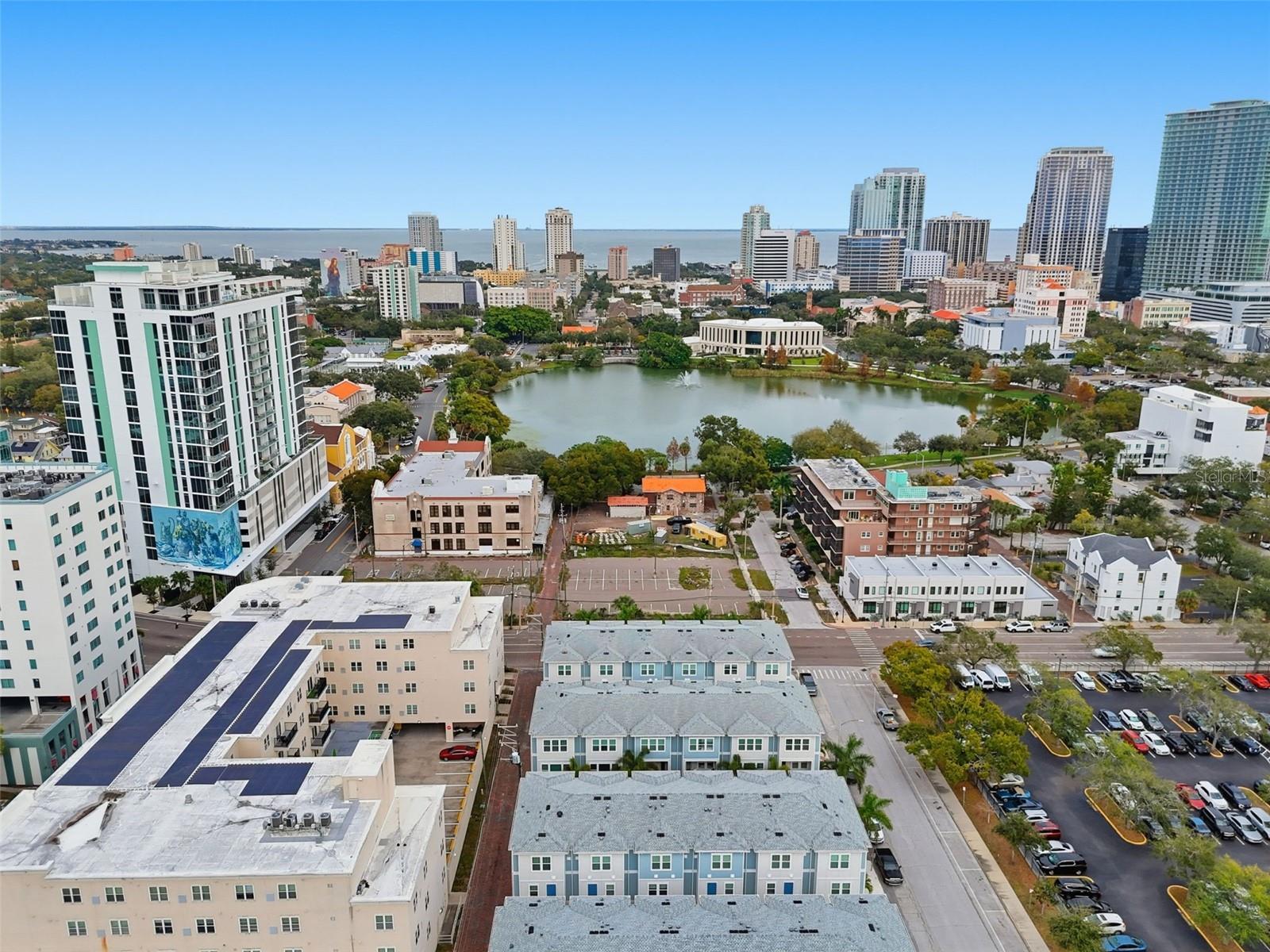 Step into modern downtown living with this impeccably maintained 2019-built townhouse in the boutique Burlington Townhomes community—where style, privacy, walkability, and city views come together effortlessly. Unlike interior-facing units, this residence fronts 8th Street, offering open downtown vistas instead of your neighbors (yes, you’ll actually want to look outside). A charming, gated entry courtyard welcomes you home—perfect for potted plants, morning coffee, or firing up the grill before a night on the town. Inside, 1,941 square feet includes three bedroom suites and thoughtfully designed space spanning three levels. The first floor features a private bedroom suite including a walk-in shower and a walk-in closet—ideal for guests, a home office, or multigenerational living. The second level is the heart of the home, showcasing an open concept living, dining, and kitchen area with downtown views from the living room. The chef-inspired kitchen impresses with a gas range, quartz countertops, bar seating, white shaker cabinetry, a stunning glass-tiled backsplash, stainless steel appliances, and a walk-in pantry—equal parts elegant and inviting. Retreat to the third floor, where the primary master bedroom suite truly shines. The spacious bedroom is framed by three large windows overlooking 8th Street, filling the space with natural light and city views. The spa-like ensuite bath features a dual sink vanity, an oversized walk-in shower with a rainfall showerhead plus a secondary wall-mounted shower system, along with a generous walk-in closet. An additional bedroom suite with full bath completes this level. Add in a two-car garage, low HOA fees, no flood zone concerns, and a home that shows like a model, and you have a rare downtown opportunity that checks every box. The location truly elevates the St Pete city lifestyle. Just a block away is Mirror Lake—home to a walking path and resident ducks with and Spring's fluffy baby chicks. Plus, here you will enjoy quick access to downtown St. Petersburg’s many other parks, the waterfront, the iconic St Pete Pier, world-class dining, coffee shops, boutiques, and vibrant nightlife - all are an easy, enjoyable stroll away. Leave the car parked and embrace a walk-friendly, urban lifestyle that puts the best of the city right at your doorstep. Homes like this don’t linger—schedule your private showing today and experience downtown St. Petersburg living at its finest.