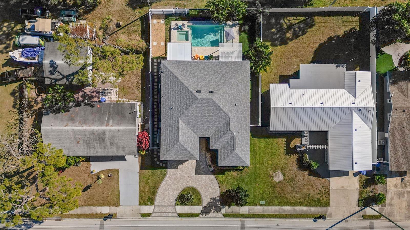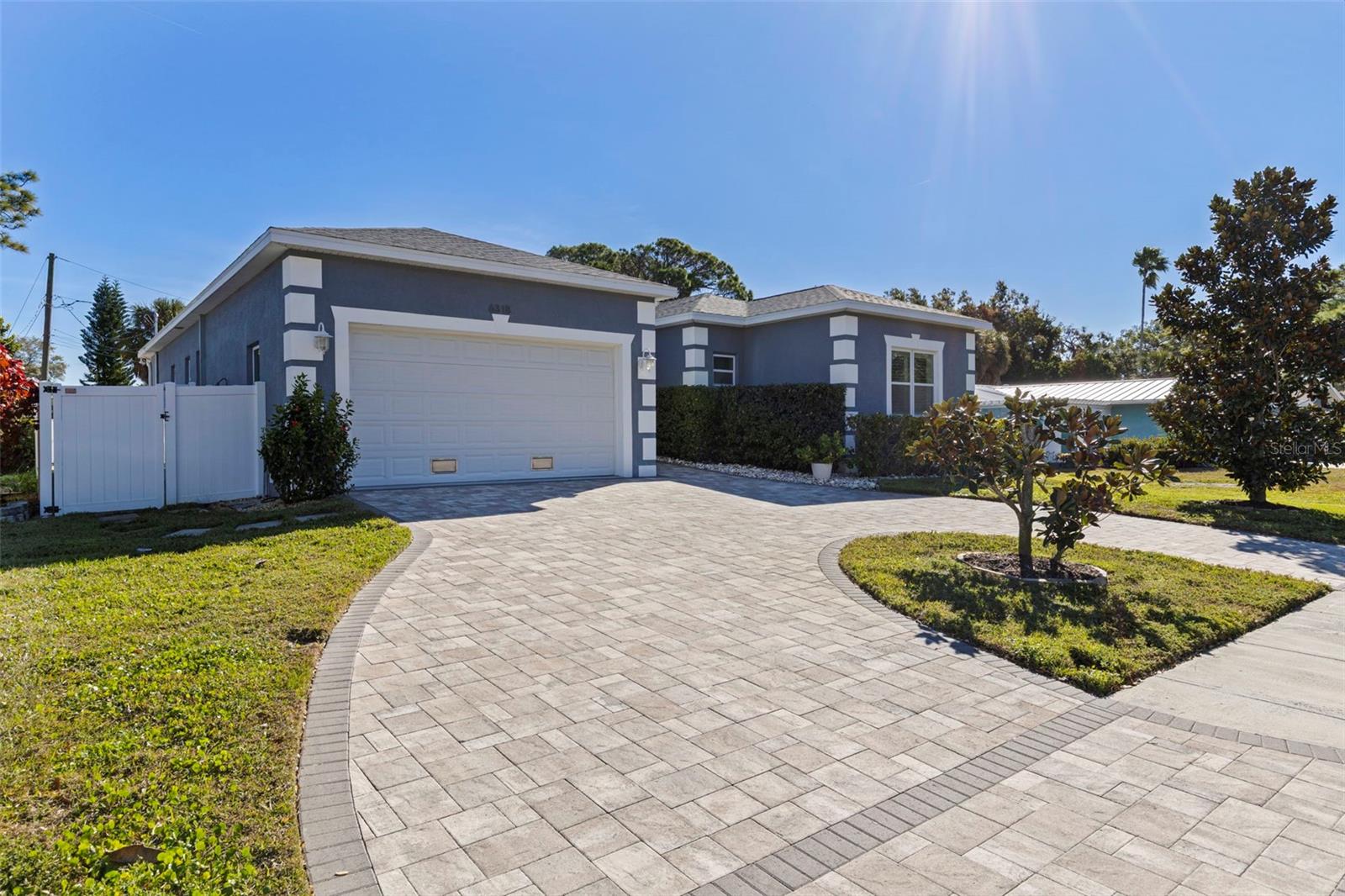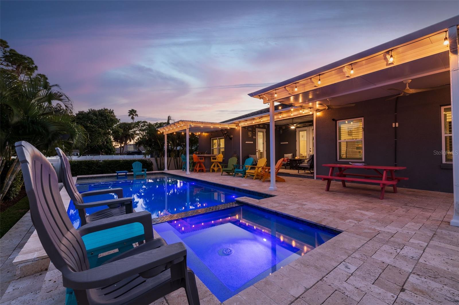 Beautifully Upgraded Elevated Home in Pinellas Point just blocks from Maximo Park. The “Sunshine House” is a 2020 custom home with 4 beds and 2.5 baths. Built to hurricane standards, impact windows and elevated to 13 feet, this home offers peace of mind along with exceptional indoor/outdoor lifestyle. The private primary suite is thoughtfully positioned on one side of the home with a spa bath, freestanding soaking tub, water closet, walk-in shower, and an impressive 12’ x 8’ walk-in closet with a security system panic button. The opposite wing offers three generously sized bedrooms. Spacious guest bath with double vanity. The great room, family room, and primary bedroom showcase tray ceilings with crown molding, while the remaining areas feature 9’4” ceilings, creating an open and airy feel throughout. Eight-foot French glass doors open to a covered rear porch overlooking a backyard with an oasis of greenery and an alleyway for added privacy. Interior features include impact-rated windows and doors. Guest half bath features pocket door as well as several other well placed pocket doors throughout the home. The kitchen features granite countertops, a large center island, walk in pantry, under cabinet lighting, stainless-steel farm-sink, garbage disposal, microwave, LG appliance package including stainless flat-top range/oven, and fridge with ice and water dispenser. Significant owner upgrades elevate this home well beyond new construction. Luxury CALI High Tide vinyl plank flooring, along with whole-house plantation shutters, upgraded USB charging outlets, and a state-of-the-art 2024 Daikin high-efficiency HVAC system, 4 ton, 18 Seer, advanced air purification using ultraviolet technology to reduce mold, viruses, and bacteria. Spacious indoor laundry. The backyard has been transformed into a private resort-style retreat, custom designed concrete salt water pool and spa with tile and pebble-tech finish, fountain, seating shelf areas, electric heat pump, travertine paver deck, and Wi-Fi-controlled Pentair system. Smart app available to instantly control pool heater before you dip in! A retractable screened back porch to shade you and keep bugs away, covered patio and pergola, and a fully equipped outdoor bar with sink, refrigerator, water service, string lights dimmable with Alexa, and fans make this space ideal for entertaining year-round. Additional exterior enhancements include a 6-foot vinyl privacy fence with oversized rolling gate and dual side gates, professional landscaping with sod, fox tail palms, areca palms, private wells for irrigation, solar-powered security cameras, outdoor hose reels, pool storage Suncast shed mounted on a hurricane pad, and thoughtful stepping stones. Outdoor shower with privacy. For recreational flexibility, the property includes dedicated RV, boat or Jet Ski parking with concrete tire pads, a 30-amp RV outlet, and additional exterior electrical and USB outlets. Water Leak defense system installed with auto shut off. A two-car finished garage with opener, storage shelving, painted floor and a brick paver circular driveway. This meticulously maintained home combines modern construction, extensive custom upgrades, smart technology, and exceptional outdoor living in one of St. Petersburg’s most sought-after neighborhoods. Take a short stroll to O’Neills Marina, Loggerhead Marina, Sunshine Skyway Bridge and Maximo Park that provides 7 boat ramps, playground, disc golf course, trails, and shoreline fishing.
