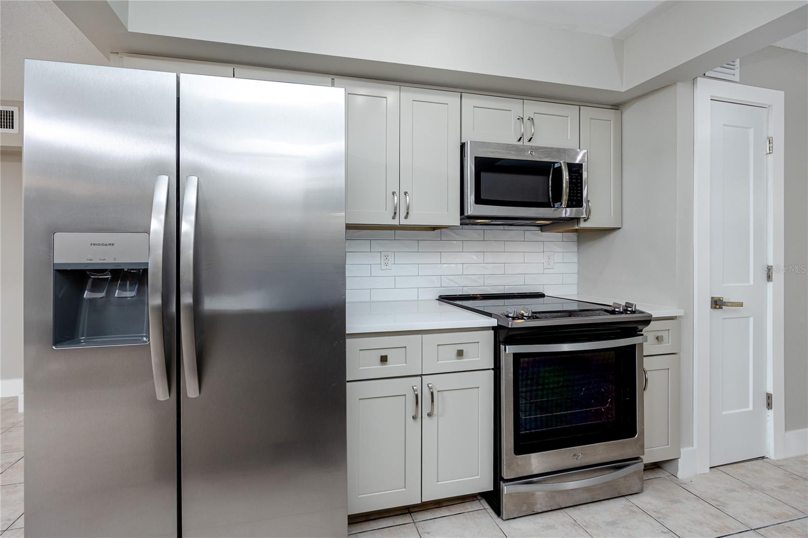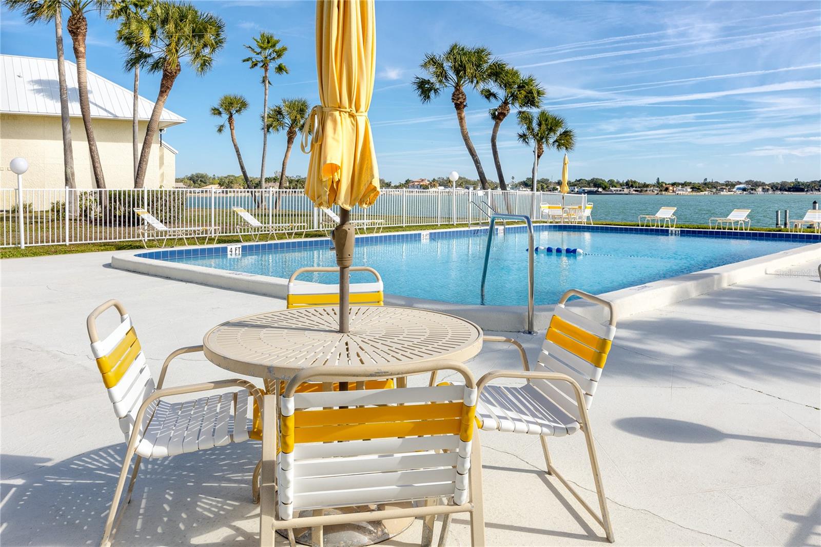One or more photo(s) has been virtually staged. Enjoy true waterfront living in this beautifully renovated, ground-floor corner condo located in the highly desirable Hidden Bay Villas community along Tampa Bay, where direct, wide-open water views stretch toward the Gulf of Mexico. This rare first-floor residence offers the ultimate no-stairs convenience paired with a fully updated interior designed for effortless, low-maintenance coastal living. The open living and dining areas are bright and airy, enhanced by updated lighting, neutral finishes, and expansive water views that flow seamlessly onto a private waterfront lanai, just steps from the heated bayfront pool, fishing pier, dock, and scenic walking paths surrounded by lush tropical landscaping. The kitchen has been completely upgraded with quartz countertops, shaker-style cabinetry, a tiled backsplash, new stainless steel appliances, a deep 18-gauge stainless steel sink with modern faucet, additional pantry storage, and a flexible breakfast or workspace area, making it both functional and stylish. The spacious primary suite features a walk-in closet with built-ins, a dressing area with abundant storage, and a beautifully updated en suite bath. The guest bedroom is generously sized, while the second full bath offers a spa-like feel with ceramic tile and modern fixtures, providing comfort for visitors or flexible use as a home office or den. Additional improvements include woodgrain luxury vinyl plank flooring in the bedrooms, ceramic tile throughout the main living areas, kitchen, and baths, new hurricane-impact windows and doors, a new energy-efficient 2-ton HVAC system, a smart Nest thermostat, ceiling fans in every room, a new water heater, and a dedicated laundry room with a full-size washer and dryer. Hidden Bay Villas is a meticulously maintained, all-ages waterfront community featuring a long-lasting metal roof and an HOA that truly delivers lock-and-leave living by covering exterior maintenance, grounds care, seawall, dock, roof, master flood insurance, cable, high-speed internet, and all utilities except electric. Monthly rentals are permitted with a one-month minimum, offering flexibility for personal use or extended-stay investment, and the community welcomes up to two small pets under 25 pounds. Ideally positioned near the Skyway Marina District, Sky Beach Resort, Maximo Park, and Boca Ciega Bay’s nature trails, disc golf, and public boat launch, this location also provides quick access to I-275, downtown St. Petersburg, the Pinellas Trail, Fort De Soto Park, and the Gulf beaches. Combining a prime waterfront setting, full renovation, ground-floor accessibility, and exceptional community upkeep, this Hidden Bay Villas condo represents a rare opportunity for buyers seeking a move-in-ready waterfront home in one of St. Petersburg’s most connected and scenic coastal locations.