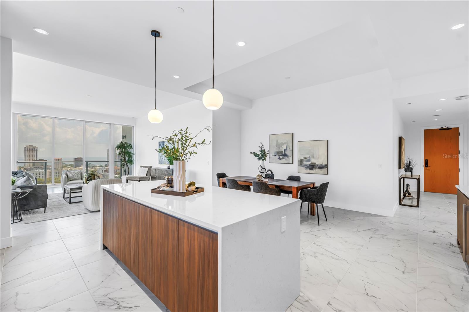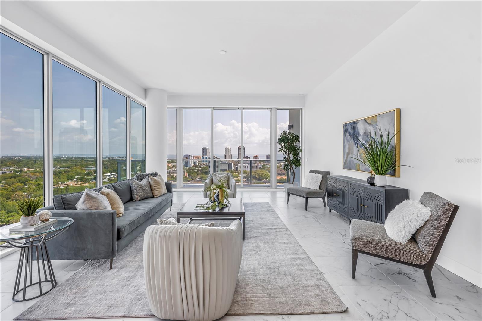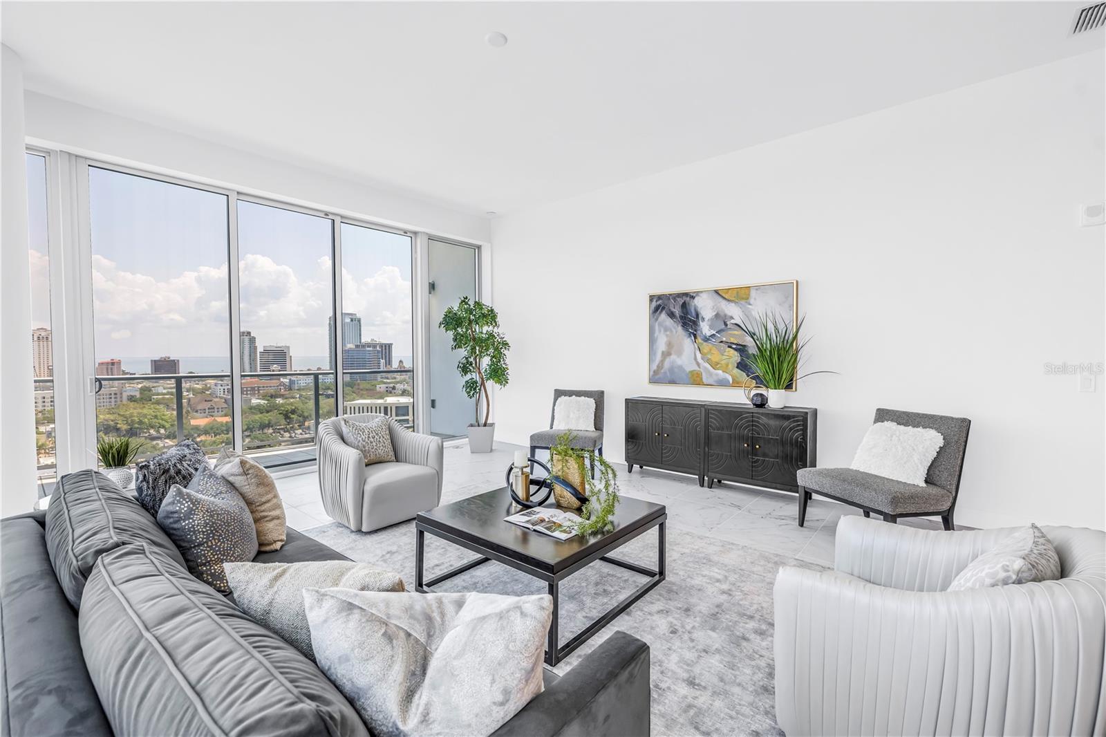 REFLECTION St Pete offers a refined vision of urban living, where walkability, culture, and design converge in the heart of downtown St. Petersburg. Just steps from Mirror Lake and Central Avenue, residents enjoy effortless access to acclaimed dining, boutiques, and the city’s celebrated museums and galleries. Located on the coveted northeast corner of the tower, the Citrine Penthouse is one of just 88 luxury residences and features floor-to-ceiling glass throughout the expansive great room, filling the space with natural light and sweeping views. The living area extends to a generous private terrace with stunning vistas of the city skyline, Mirror Lake, and Tampa Bay. Inside, the home showcases porcelain tile flooring and soaring 11-foot ceilings throughout the main living areas and bedrooms. The chef’s kitchen is thoughtfully designed with quartz countertops, an oversized island with double waterfall edges, upgraded cabinetry, panel-ready Bosch stainless steel appliances, and a built out dry bar with wine fridge. A north-facing kitchen window over the sink further enhances the sense of openness and captures tranquil St. Pete views. The primary suite offers a serene retreat with a European-style wet room, upgraded plumbing fixtures, and a spacious walk-in closet. This two-bedroom residence includes two side-by-side parking spaces, included in the purchase price. Residents enjoy exclusive access to a 12,000-square-foot rooftop amenity level featuring a glass-wrapped fitness center and social club, heated saltwater pool and spa, dry sauna, fire pit, outdoor kitchen and wet bar, and breathtaking panoramic views. The building also features state-of-the-art electronic air filtration in each residence and a full-building water softening system. Developer incentives are still available—schedule your private showing today and experience elevated downtown living at REFLECTION St. Pete.