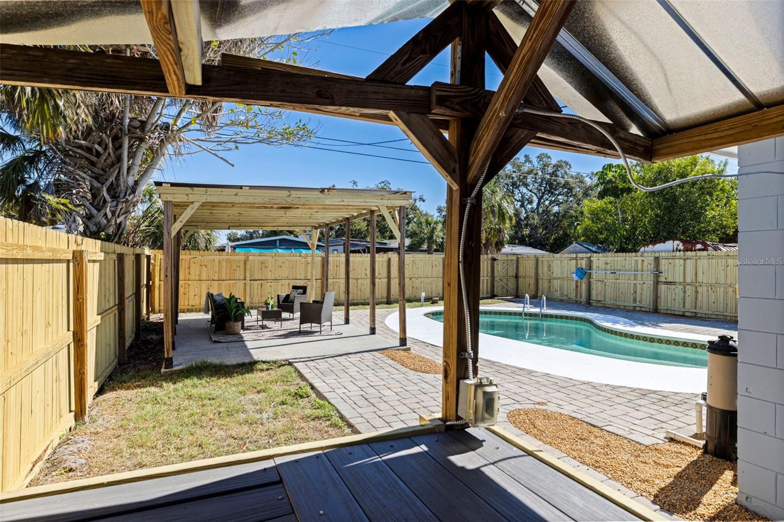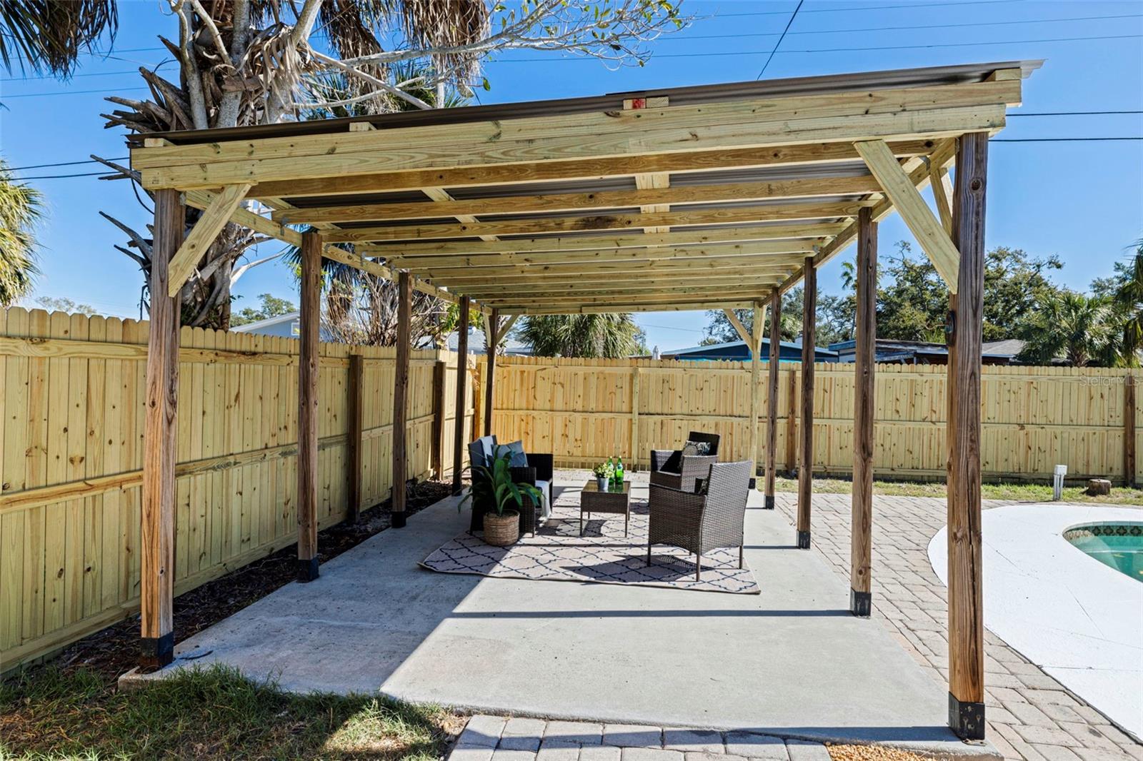 Welcome to this well-maintained 3-bedroom, 2-bath home with 1,236 sq ft of living space, located in one of South St. Petersburg’s most desirable neighborhoods. While the interior is comfortable and inviting, the true star of this home is the resort-style backyard built for year-round Florida living. Step outside to your private outdoor oasis, featuring an inground swimming pool, expansive brick patios, and multiple spaces designed for relaxing and entertaining. A tiki hut with bar seating and a covered pergola make this backyard perfect for hosting friends, weekend gatherings, or unwinding after a day at the beach. Inside, the home offers a bright and open living area with tile and laminate flooring throughout, a functional kitchen with ample cabinet space, and a split-bedroom floor plan that provides privacy for family and guests. Both bathrooms are conveniently located, making indoor-outdoor living easy and seamless. Located just minutes from beaches, dining, shopping, and downtown St. Petersburg, this home delivers the perfect combination of location, lifestyle, and an unforgettable backyard.