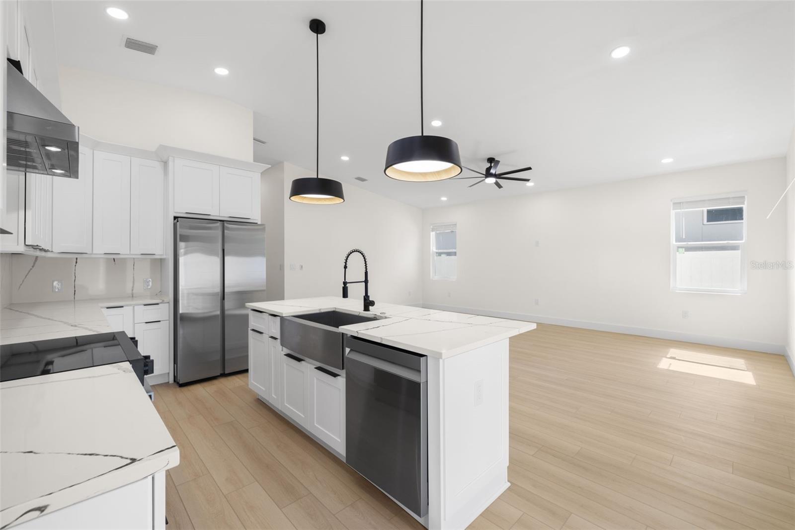 Welcome to this brand-new modern home, thoughtfully designed for comfort, style, and convenience. Ideally located just 10 minutes from Downtown St. Pete and 5 minutes from Downtown Gulfport, this home offers easy access to dining, entertainment, and world class beaches. This stunning 3-bedroom, 2-bath residence includes a dedicated home office, perfect for remote work or a quiet creative space. The open-concept layout is highlighted by tall vaulted ceilings in the living room, creating an airy, light-filled atmosphere that feels both spacious and inviting. Enjoy luxury vinyl plank flooring throughout, combining durability with a sleek, modern aesthetic. The kitchen is equipped with a Samsung appliance package, ideal for everyday cooking and entertaining alike. The private primary suite provides a relaxing retreat, with two walk-in closets, and an en-suite bathroom that features a soaking tub and oversized shower. Additional features include hurricane impact windows throughout, an epoxy-coated 2-car garage for a clean, finished look, and a fully fenced backyard - perfect for pets, outdoor gatherings, or added privacy. With modern construction, high-end finishes, and a prime location close to everything St. Pete has to offer, this move-in-ready home truly checks all the boxes.