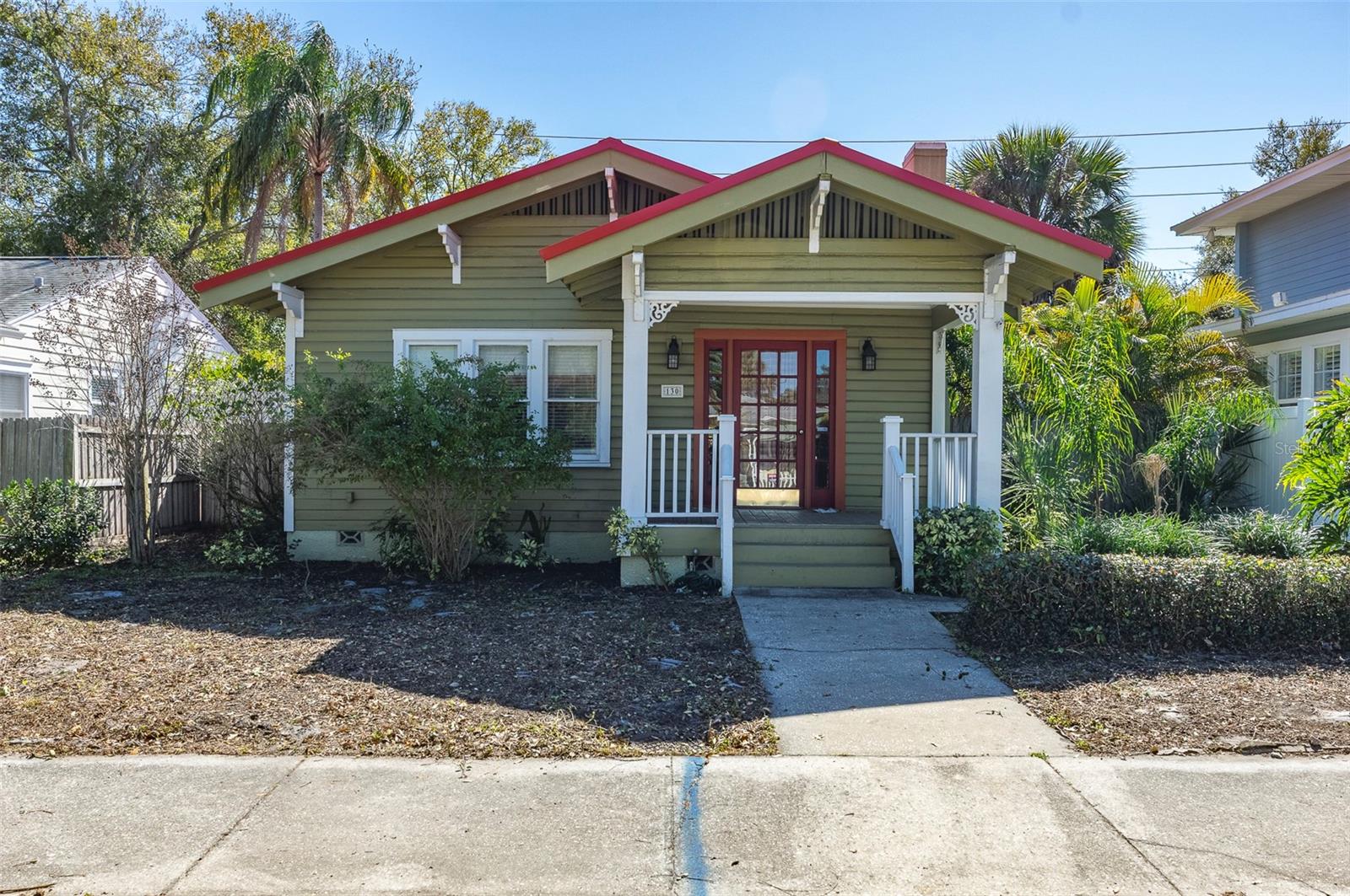 Located in the heart of Historic Old Northeast, one of the most sought-after neighborhoods in St Petersburg. This charming 1920s bungalow blends timeless character with thoughtful updates. Featuring 2 spacious bedrooms and 1.5 baths, this home welcomes you with a classic front porch, perfect for enjoying your morning coffee and connecting with the neighborhood’s historic charm. Inside, you’ll find a spacious living room anchored by a fireplace, enhanced by recessed lighting, and abundant natural light that highlights the home’s architectural character. Original hardwood floors flow throughout, adding warmth and authenticity. The bright, functional kitchen showcases crisp white cabinetry, granite countertops, and stainless-steel appliances. Designed for everyday living, it offers ample storage, a convenient layout, and natural light from adjacent glass French doors. Neutral tile flooring complements the clean design, while bold accent walls add personality. The spacious dining area is filled with natural light and easily accommodates large dinner parties and gatherings. The primary bedroom is a comfortable, private retreat featuring a generous size for flexible furniture arrangements or additional lounging area, and neutral finishes. The full bath includes a tub/shower combination, classic hex tile flooring, pedestal sink, and bold green walls for a clean yet character-filled look. The second bedroom offers neutral walls, bright natural light, and louvered closet doors for ample storage, making it a versatile guest room, office, or flex space. The charming powder bath features classic black-and-cream toile wallpaper, creating a distinctive French vintage feel. Just off the kitchen, you’ll find access to the backyard and a separate laundry room with plentiful storage. The large deck overlooks a low-maintenance, well-manicured yard—perfect for outdoor entertaining or sunbathing. Additional features include a detached garage ideal for storage and alley parking for up to three vehicles. A new red metal roof beautifully complements the olive green exterior and crisp white trim. Enjoy an unbeatable location less than a 10-minute walk to Coffeepot Bayou and just a 10-minute drive to downtown St. Petersburg, Vinoy Park, and the vibrant 4th Street Corridor.