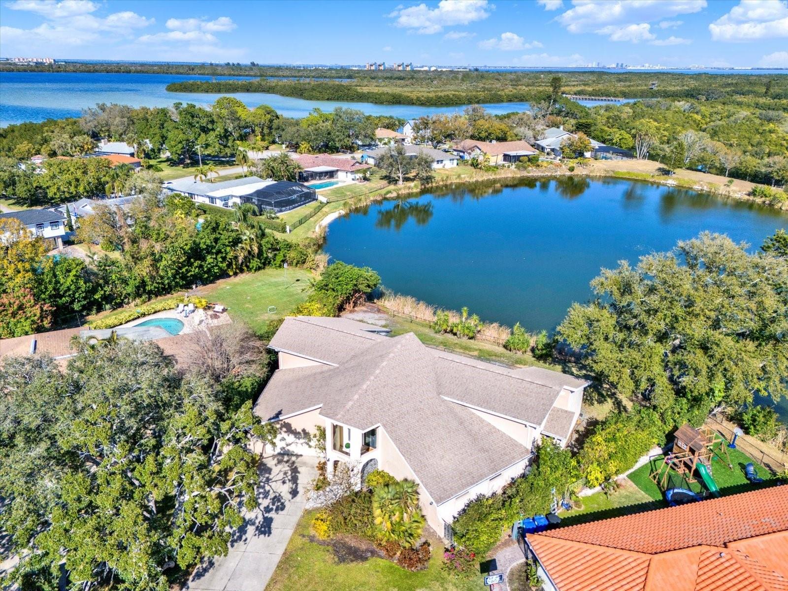 Tucked away on a cul de sac in Harbor Isle, this expansive lakefront residence offers a sense of privacy at the front of the home and open views in the backyard overlooking the lake. This home sat high and dry during the 2024 hurricanes and did not experience any water intrusion. With 5 bedrooms, 4 bathrooms, and more than 4,400 square feet, this home has plenty of space for a growing family or multigenerational living. When you step inside, you are greeted by an updated entry anchored by a modern staircase. At the center of the home, the renovated kitchen features white cabinetry, matching stainless steel appliances, double ovens, a vent hood, a walk-in pantry, and a convenient pass through window that connects the kitchen to the outdoor entertaining space. Imagine hosting friends and family by the pool for barbecues or holidays while meals and conversation flow effortlessly between indoors and out. The floor plan flows naturally around the kitchen and pool, creating two distinct living areas. On one side, a formal living room and dining room offer a traditional space for entertaining. On the other, the family room and additional dining area create a relaxed, everyday gathering space. Just off the family room, an additional bonus room provides a flexible extension that can serve as a gym, game room, lounge, or hobby space. The downstairs in law or guest suite is ideal for multigenerational living. A pool bath, large laundry room, and an oversized storage room round out the main level. But do not worry about hauling your dirty laundry downstairs. The laundry chute from the second floor drops directly into the downstairs laundry room. Upstairs, the primary suite is a true retreat, featuring a spacious walk-in closet and an en suite bath with a soaking tub and a separate shower. An attached secondary bedroom or office offers an ideal flex space for a private workspace, nursery, studio, or sitting room. The primary suite and each of the upstairs secondary bedrooms open to a large balcony overlooking the lake. Two additional upstairs bedrooms are positioned down the hall and share a full bathroom, and there is yet another storage room upstairs. Convenient to downtown St. Petersburg and commuter routes via I 275, the location also keeps you close to everyday essentials, including Trader Joe's and Whole Foods Market. If you have been looking for a large lakefront pool home near downtown St. Pete, this one is worth seeing in person.