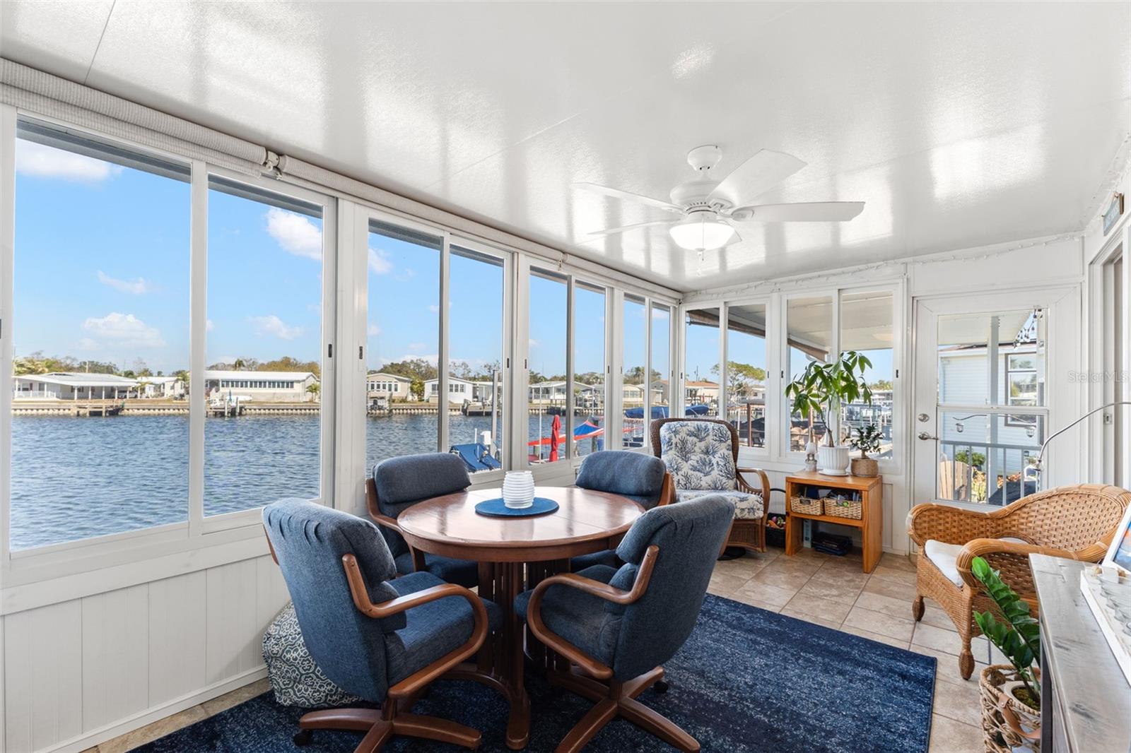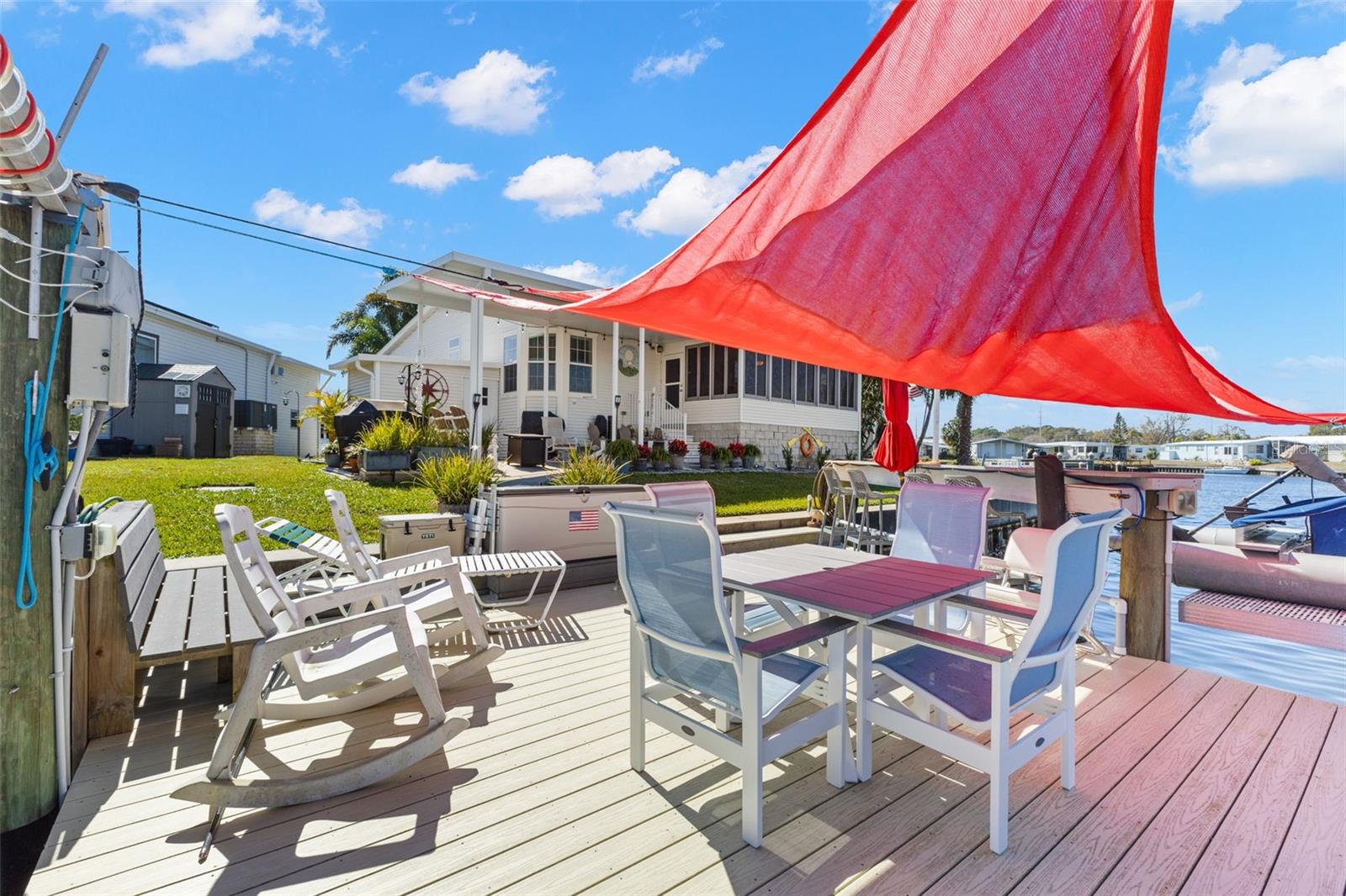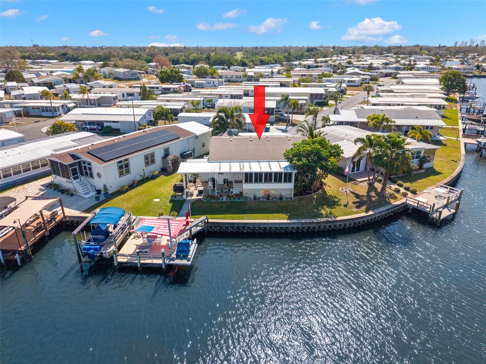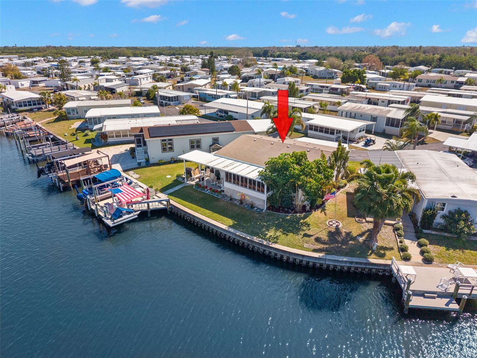 LOCATION! LOCATION! LOCATION! Built in 2013, High & Dry, this lovely home had no damage from the 2024 storms. This paradise includes approximately 99 ft of waterfront, overlooking a large basin of water with views of the marina, diving pelicans, manatees and dolphins as they swim by. With 1956 sq ft this 3 bedroom/2 bath home offers many upgrades throughout. The large kitchen is well appointed with granite countertops, a large walk in pantry, a 5 X 8 Island, lots of solid wood cabinets with pull-out drawer organizers, and newer stainless steel appliances, offering both functionality and efficiency. The Living Room and Dining Room are open concept and the cathedral ceilings and transom windows enhance the size of the room and the natural sunlight and openness of the home. The primary suite provides a walk in closet, ensuite bath with dual vanities, a walk in shower, a separate garden tub, and additional cabinets for storage. There are 2 additional bedrooms, one currently works well as an office/den. The guest bath has tub/shower, vanity and linen cabinets. All fixtures in bath and kitchen have been updated. The enclosed lanai has been updated with drywall, insulation, a mini split AC (2020), and (10) 36 X 60 hard vinyl windows to enjoy the spectacular views. Inside laundry room large enough for a small freezer, and shed with workbench and shelving. Outdoor living is the lifestyle here with an extended covered patio providing shade/shielding from rain or sun. Great firepit area. The dock was updated in 2020 with Timber Tech composite decking and 16' Bar. Great place to entertain before or after you board to or from your boat where you will enjoy the breeze sitting under the shade sail. HVAC (2024). This home has it all and it is located in the popular Americana Cove, a 55+ gated waterfront community. Located 10 minutes from downtown St Peterburg, 20 minutes from 2 airports, 25 minutes to local beaches. 2 pets allowed. Low $380 HOA, includes water, sewer, trash, lawn mowing, 24 hr manned gate, heated pool, fitness room, shuffleboard, bocce, and many clubs and activities. This is waterfront living at it's finest!