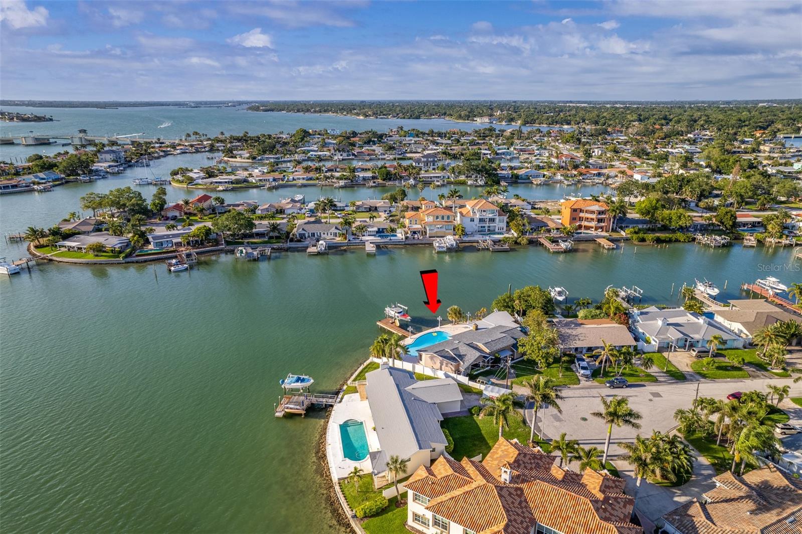 LOCATION LOCATION LOCATION Unique opportunity to own a beautiful waterfront oasis on a spectacular "point" lot with 160 Ft of seawall. The location at the end of a cul-de-sac with stunning sunsets and wide open-water views of the Boca Ciega Bay.Make this an incredible one-of-a-kind opportunity to restore this home or build a brand new home. if you enjoy the water/beach life. Large, oversized back patio with lots of room for entertaining family and friends complete with a large pool .This home was affected by Hurricane Helene and has been remediated. All new seawall and dock plus 16,000 lbs boatlift and deep water access. Watch as the dolphins and manatees and other wildlife play right off your dock and enjoy the boats cruising by on the intracoastal waterway. Fantastic location, within one mile to the sandy white beaches, lots of unique shops in coveted Treasure Island and countless restaurants etc. Quick access to I-275 and just 15 minutes to downtown St. Petersburg with all the fun and entertainment possibilities that it has to offer. Make your appointment today before it's gone. Restore the home to pre hurricane conditions: Outdoor kitchen area and direct convenient access to the pool bath w/shower without entering the house. Large one-story home with 3 bedrooms and 4 full baths.You will be mesmerized by the stunning water views as you enter and walk through the family room/ great room with a stunning stone wood burning fireplace. This tropical waterfront home features a split floor plan with each bedroom having an en-suite bath. Wake up to sweeping pool and water views from your master suite complete with sliding glass doors leading you to the pool area. Indoor laundry room.
