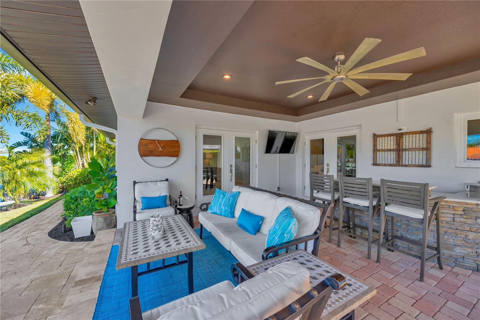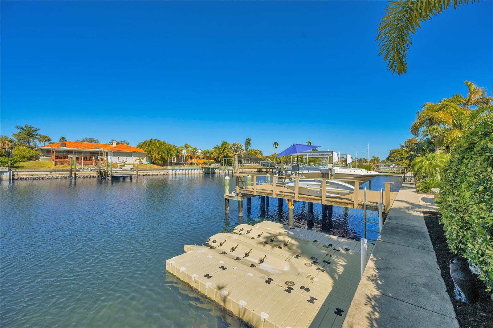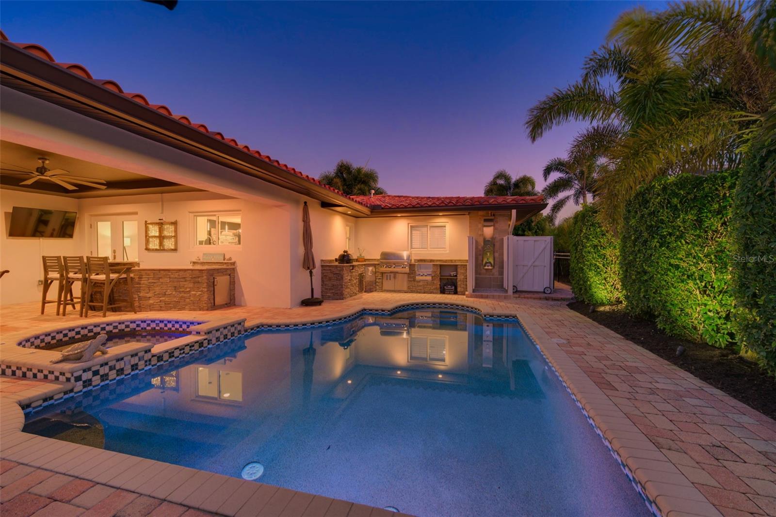 DID NOT FLOOD! Welcome to an exceptional waterfront residence in Venetian Isles, ideally positioned on Michigan Avenue—one of the highest streets in the community. Situated on an elevated, built-up and sloped lot, this property offers a rare advantage in Venetian Isles, and this home remained unflooded during recent hurricanes. Enjoy refined coastal design, thoughtful upgrades, and a true boating lifestyle along deep-water canals with access to Tampa Bay and the Gulf. This home offers new flooring, a freshly repainted interior, and an inviting, light-filled layout designed for both elegant entertaining and relaxed everyday living. A rare offering for the area, the property features two private suites, each with its own dedicated bathroom. The expansive rear primary suite serves as a private retreat, complete with a custom redesigned walk-in closet and spa-style bath, while the second suite—featuring both interior access and a separate exterior entrance—offers exceptional flexibility for guests, a private office, or in-law suite. One of the home’s most coveted features is its seamless direct walk-out access from the main living area to the dock, allowing you to step outside, pass the natural gas firepit, and head straight to the water without navigating around the pool. This highly desirable layout enhances daily convenience and creates a natural connection between indoor living, outdoor entertaining, and boating. The pool and spa are thoughtfully positioned to the side, preserving open sightlines and effortless flow throughout the backyard. Designed for resort-style enjoyment, the outdoor living space features a heated Hayward saltwater pool with attached waterfall spa, multi-color LED lighting, and an efficient variable-speed pump. The fully equipped raised outdoor kitchen includes granite counters, stone base, overhead lighting, electrical, and piped-in natural gas—complete with a Firemagic 48” Echelon grill with rotisserie, Firemagic power burner, Primo ceramic grill, sink, and stainless storage. A spacious two-level outdoor bar with beverage refrigerator, mounted TV, ambient lighting, and ceiling fan creates the perfect setting for sunset gatherings and waterfront entertaining. A premium outdoor shower and a 6’ piped-in natural gas firepit further elevate the private backyard retreat. Boating enthusiasts will appreciate the exceptional waterfront setup, featuring a 12’ x 24’ Trex dock with lighting, fish station, dual water connections, and a lower dock for easy entry, a 13,000 lb boat lift with updated electrical and cradle options, and an EZDock floating dock for personal watercraft. A newer seawall with corrugated panels and a wide concrete cap provides long-term durability and peace of mind. Additional improvements include two HVAC systems (new within the past four years), a natural gas whole-house tankless water heater, whole-house Pelican water softener, generator connections with breaker interlock, four-zone Rain Bird irrigation, soffit electrical for holiday lighting, climate-controlled storage, and timed exterior lighting with dawn/dusk sensors. This turnkey Venetian Isles residence delivers an exceptional blend of luxury, privacy, functionality, and waterfront performance—offering a refined coastal lifestyle in one of St. Petersburg’s most coveted boating communities.