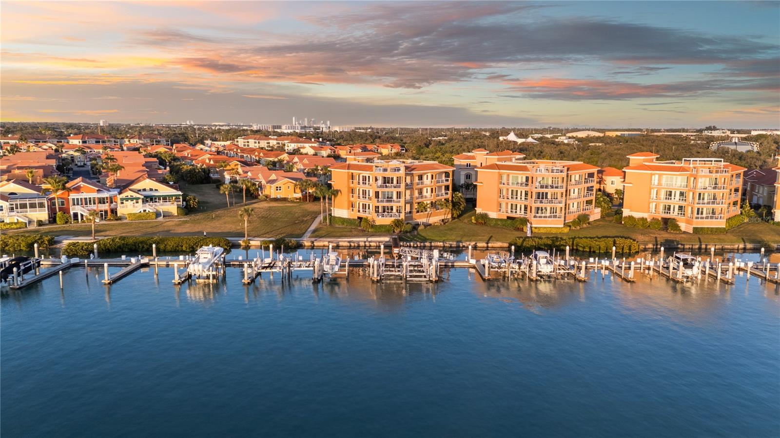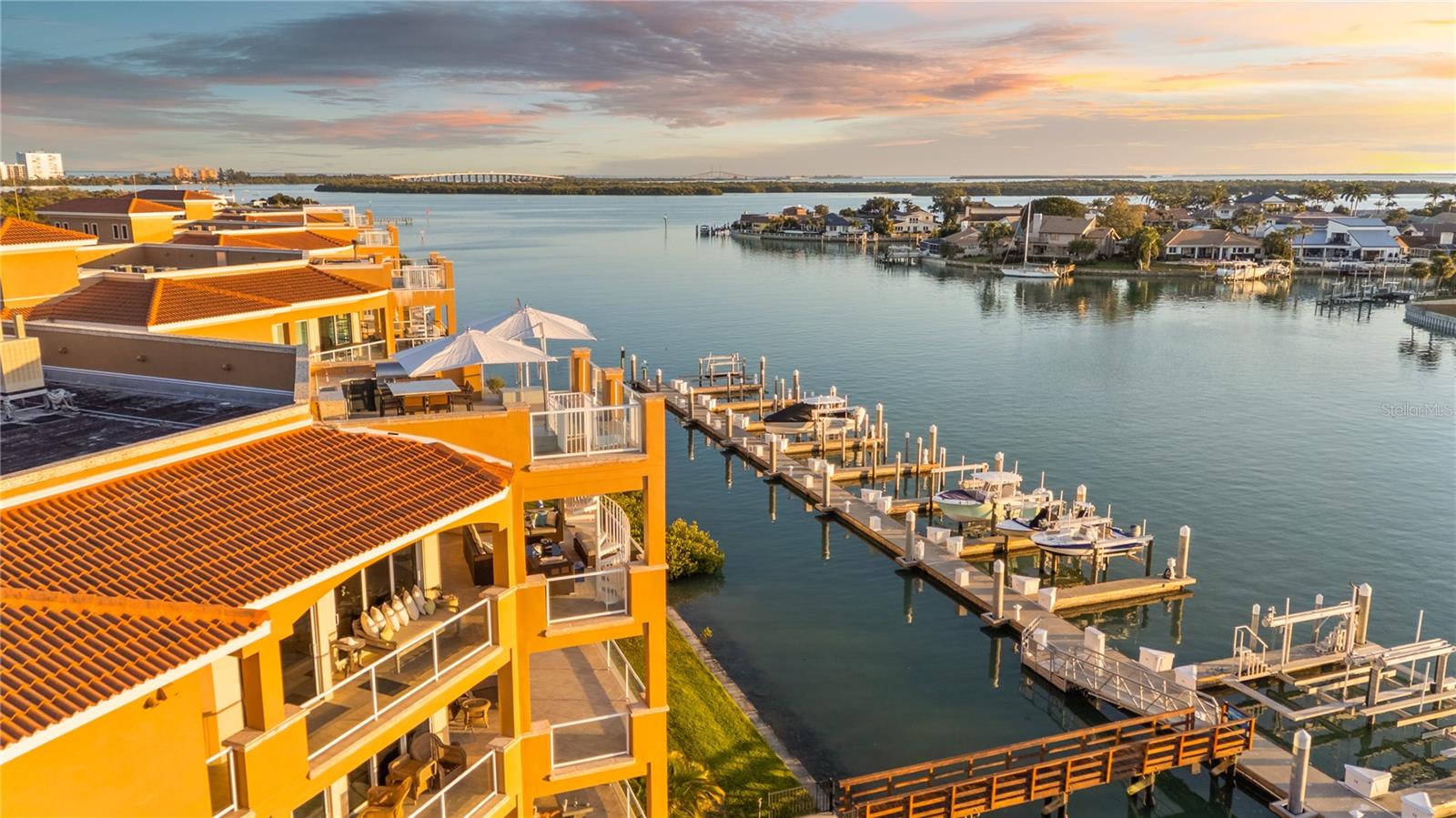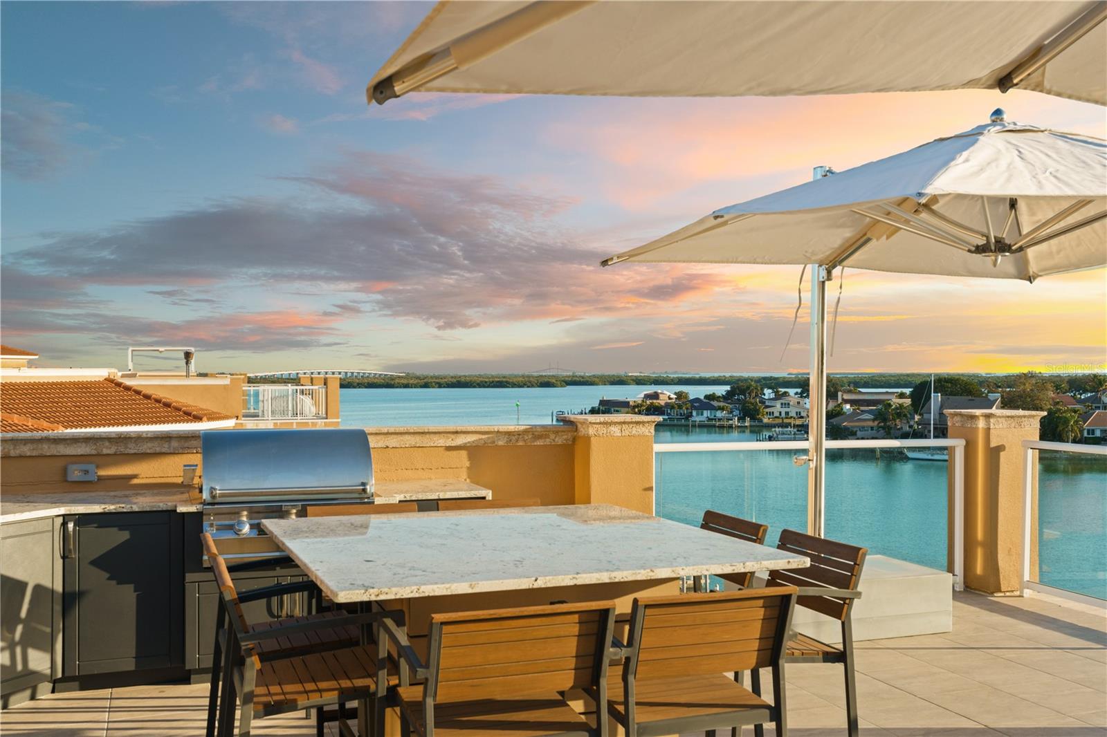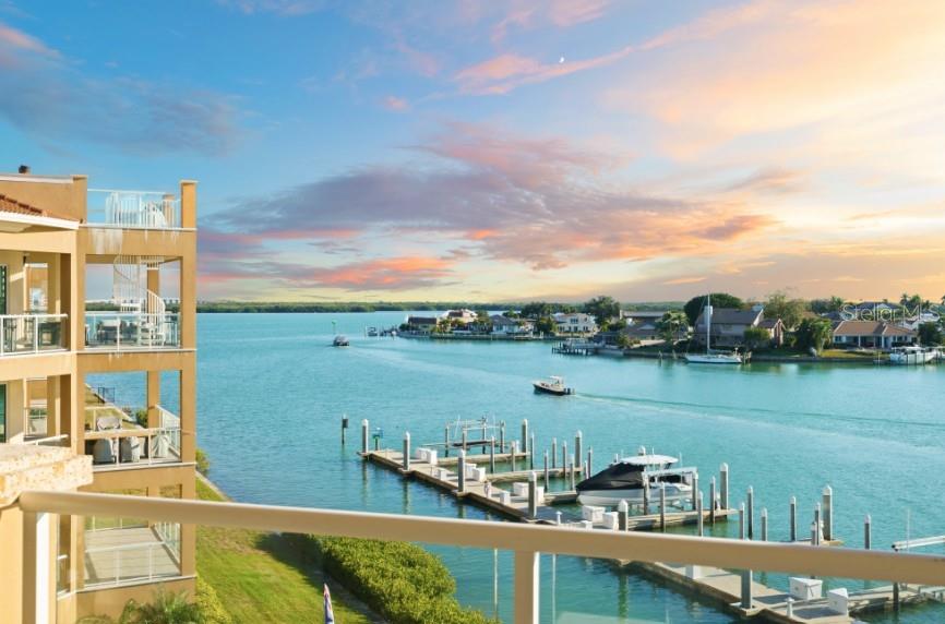 This Penthouse at Marina Pointe has a Private Rooftop Terrace and a Deeded Boat Slip! Located in the gated community of Marina Bay, The Pointe presents a collection of Boutique Condo Buildings with only three units each. This refined residence is comprised of over 3800 square feet of luxurious living area, including four bedrooms and four and a half baths. Take the elevator to your private foyer, which makes a bold statement with a ceiling to floor waterfall. Enter the open living area, surrounded by wrap around balconies, taking in southern views toward the Skyway Bridge over Tampa Bay and western views toward the horizon on the Gulf. Silk lanterns float above the formal dining area with custom mahogany built-ins to store your treasures and dramatic lighting to display your art and artifacts. The sitting room and gathering rooms are divided by a stunning three-sided gas fireplace. The kitchen is a gourmand’s sweet dream with SubZero Refrigerators, a Wolf cooktop with grill and range hood over the Center Island, double wall oven, warming drawer, ice maker and Miele barista coffee center. The breakfast bar and center island each have sinks for more prep and serving space and two dishwashers for quick clean up. Sleek custom cabinets have pull out shelves, space for spices, baking sheets and cutting boards while glass cabinets on the back of the island display barware and ceramics. A walk-in pantry is just beyond the kitchen with built-in cabinets and adjustable shelving. Of the four bedrooms, the primary suite is the showstopper. With access to the wraparound porches, enjoying sunrise and sunset views, this exquisite space is a true retreat. The primary ensuite is actually a bath and a half with two vanities, two water closets, a soaking tub and a separate steam shower. The massive walk-in closet will accommodate your entire four-season wardrobe. Two of the guest rooms have private ensuite baths, while the fourth bedroom, currently used as an office, has gorgeous etched glass doors and access to a full bath across the hall. The wine room is a sweet surprise with a glass door to gaze at your climate-controlled collection. While the interior of this home will surely impress you, the exterior will take your breath away! An entire outdoor living room awaits you and your guests as you flow from the gathering room to the great outdoors. A spiral staircase leads to your private rooftop terrace, complete with an outdoor kitchen, gas grill, built-in seating and panoramic water views! Peer down at your deeded boat slip and plan your next fishing trip or sunset cruise! This Stunning Penthouse Residence also features 11.5’ ceilings, solid wood doors, wired sound system, custom blinds and window treatments, LED lighting, impact glass windows and doors, laundry room with sink and cabinets, a large storage room, 2 mechanical closets, whole-house generator, central vacuum and a private garage large enough for three vehicles. Marina Bay amenities include a heated pool and spa, fitness center, club house and marina. Located just off of Interstate 275 and the Pinellas Bayway, the community is ideally situated between Downtown St. Petersburg and the Gulf Beaches. Just thirty minutes from international airports and professional sporting arenas.