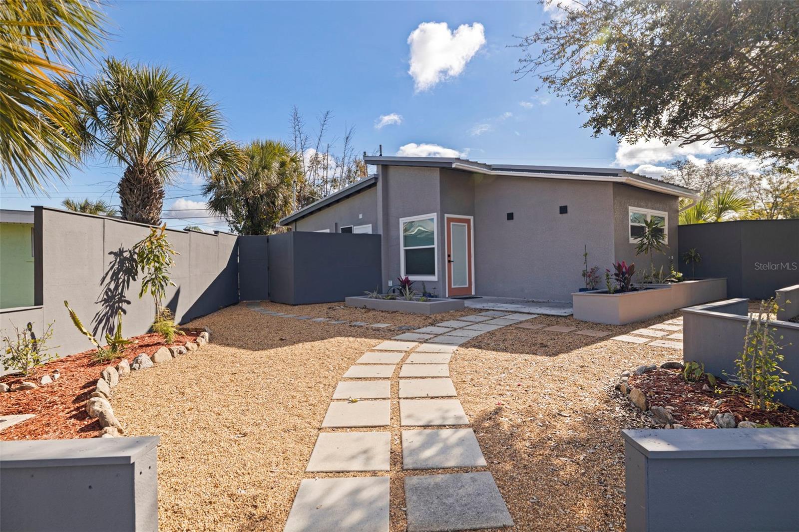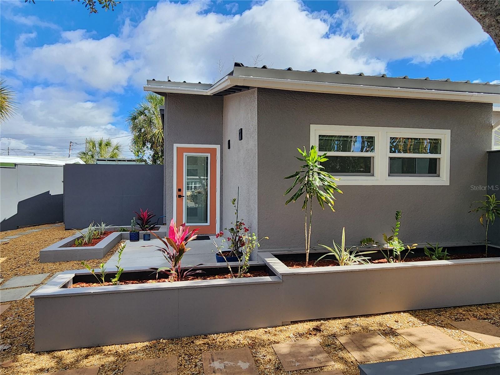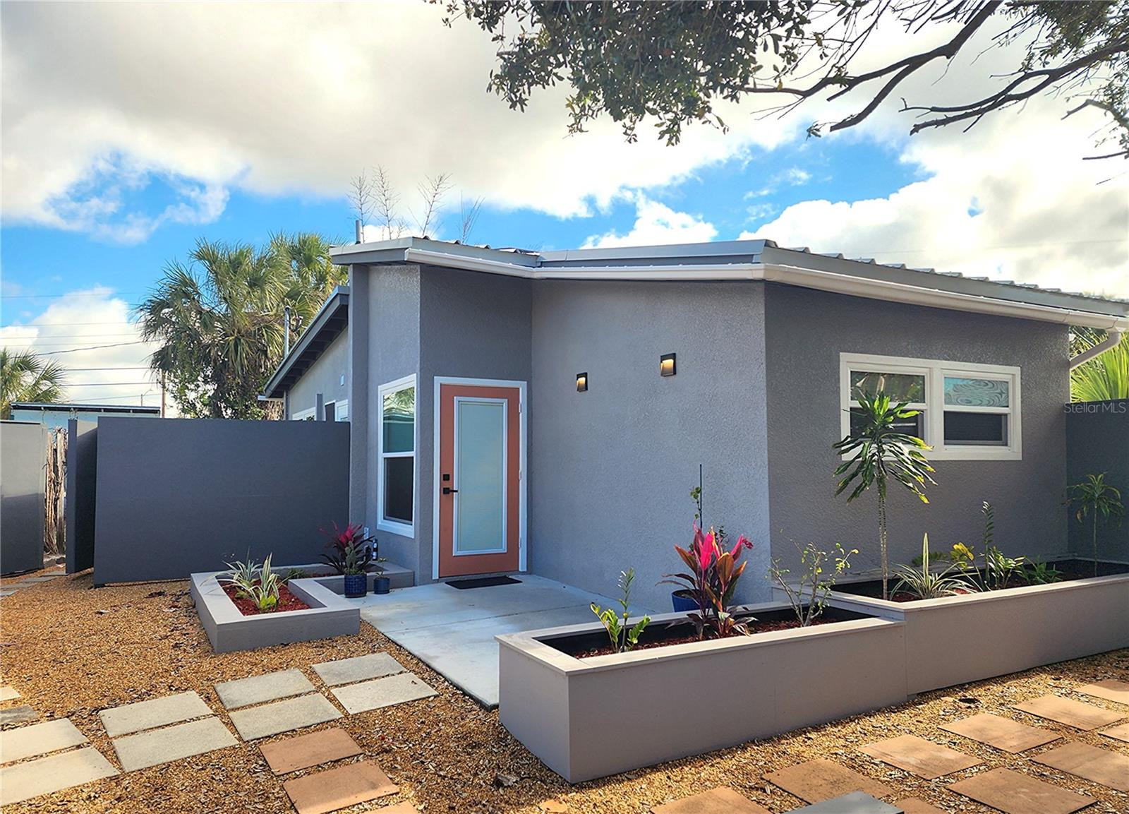 Step into this striking modern industrial home with a touch of boho-chic style — a thoughtfully curated blend of design elements that delivers a true wow factor from the moment you walk in. Soaring vaulted ceilings, an impressive open floor plan, and abundant natural light streaming through large windows, glass doors, and skylights create a bright, airy atmosphere that feels spacious without the upkeep of a larger home. The kitchen is warm, open, and inviting, featuring high-end appliances, an under-mount sink, butcher-block countertops, and exceptionally efficient storage, including innovative drawer-within-drawer organization to maximize space. A rare and delightful feature of this home is that each bedroom offers private double-door access to the backyard — perfect for stepping outside to enjoy the weather or seamlessly blending indoor and outdoor living. The beautifully updated bathroom showcases both style and function, with custom built-in storage cleverly integrated into the décor, a handcrafted dual-sink vanity, a high-efficiency low-flow toilet, and a stunning glass walk-in shower with rainfall showerhead. The living room continues the home’s open, light-filled feel, highlighted by six hurricane-rated glass doors that fully open to extend the entertaining space onto the oversized back patio. Outdoors, you’ll enjoy a generously sized fenced backyard — ideal for hosting, relaxing, or simply enjoying Florida’s beautiful weather in privacy. Recent upgrades add both value and peace of mind, including a warranted metal roof, whole-house water filtration system, hyper-efficient tankless water heater, eco-friendly gravel driveway designed to support natural aquifer recharge, newer Samsung appliances (washer, dryer, refrigerator/freezer, and dishwasher), high-efficiency LED lighting, and refreshed landscaping. Conveniently located just over three miles from powdery sands of both Treasure Island Beach and St. Pete Beach, a short drive to award-winning Downtown St. Petersburg, approximately 1.5 miles from Stetson Law School, and minutes from shopping, dining, banking, and everyday essentials — this home offers exceptional access to everything the area has to offer. If you’re ready for something refreshingly different from the ordinary, this distinctive, thoughtfully updated, and inviting home delivers both character and location — perfectly positioned between vibrant downtown living and world-class beaches.