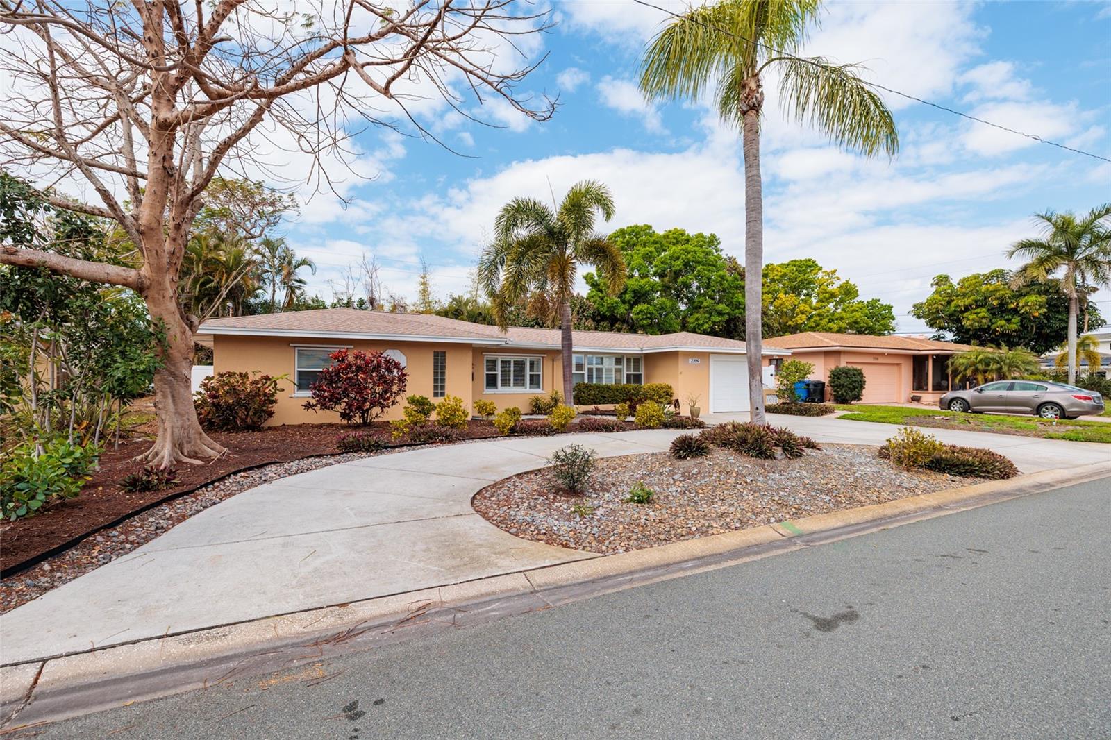 Private Tropical Living in the Heart of Tropical Shores. Welcome to this beautifully updated 3-bedroom, 2-bath residence in the sought-after Tropical Shores neighborhood, just moments from the waterfront at Lassing Park. Thoughtfully designed living space, this home blends warmth, character, and modern comfort in one of St. Petersburg’s most charming coastal communities. Inside, bright open spaces create an inviting flow ideal for both everyday living and entertaining. Architectural details such as graceful archways and French doors add character, while plantation shutters and updated luxury vinyl flooring provide a clean, cohesive look throughout. The living room has been enhanced with custom built-in cabinetry, floating shelves, and a stylish electric fireplace feature wall, creating a natural gathering place at the heart of the home. The kitchen is both functional and elegant, featuring flat-panel wood cabinetry with buffet storage, granite countertops, a glass mosaic backsplash, under-cabinet lighting, and Bosch appliances including a built-in convection oven and cooktop with range hood. The adjacent dining and living areas connect seamlessly, making the space feel open yet intimate. Both bathrooms have been tastefully remodeled, and the primary suite offers comfort and privacy. A versatile fitness/sunroom overlooks the backyard and provides the perfect flex space for workouts, a home office, or a quiet retreat. Step outside and discover the true highlight of the property — a private tropical oasis designed for relaxation and entertaining. The saltwater pool is surrounded by pavered decking, a meandering stone wall, and pebble path accents that enhance the lush landscaping. A gas fire pit seating area and outdoor shower add to the resort-style ambiance, while white vinyl fencing ensures privacy. The screened porch offers shaded comfort on warmer Florida days. Additional features include a circular driveway in addition to the attached one-car garage, reclaimed-water irrigation, and French drains. Located just a short stroll to Lassing Park’s waterfront walking paths and paddleboarding, and minutes from vibrant downtown St. Petersburg, this home offers the perfect balance of privacy, style, and coastal lifestyle.