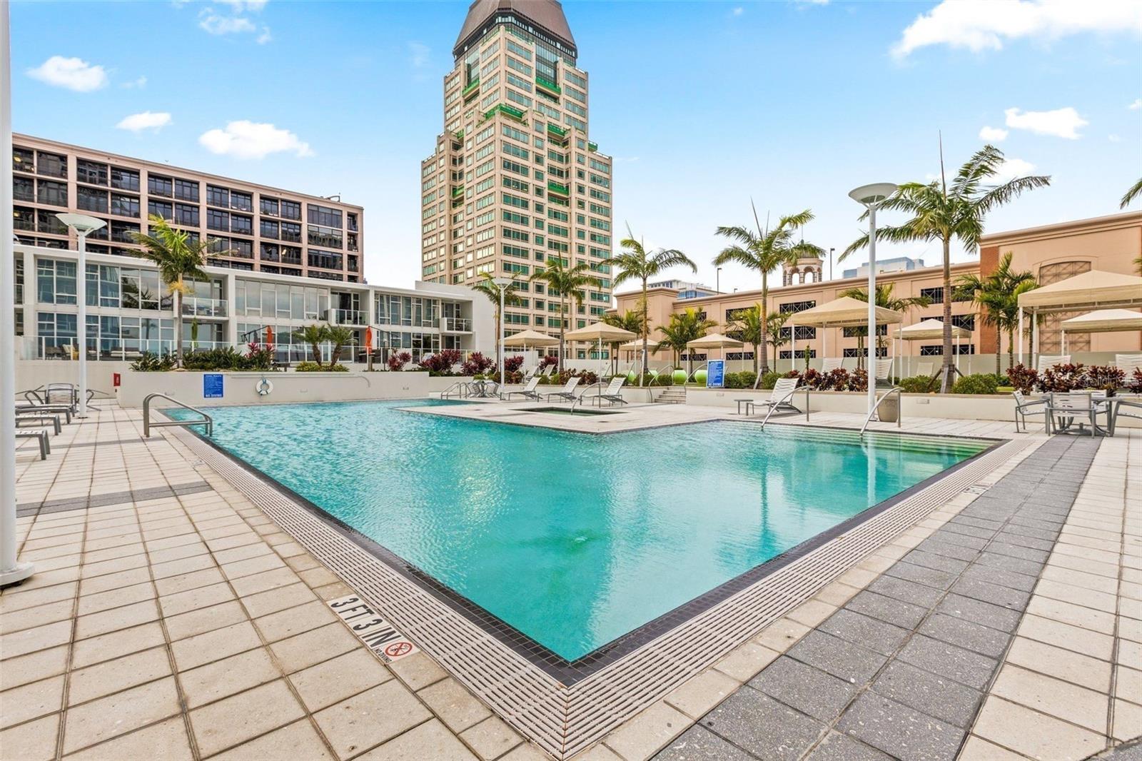 One or more photo(s) has been virtually staged. Located in the iconic Signature Place in the heart of Downtown St. Petersburg, this beautifully designed residence offers a seamless blend of modern luxury and breathtaking city and Tampa Bay views from every space in the home. With a desirable southeastern exposure, natural light pours through dramatic floor-to-ceiling impact glass, highlighting the open and airy 1-bedroom, 1.5-bathroom floor plan with high ceilings and refined finishes throughout. The living space flows effortlessly onto an expansive private balcony spanning the entire width of the residence, creating a stunning outdoor extension where you can enjoy sweeping views of the downtown skyline and sparkling waters of Tampa Bay. The upgraded kitchen is both stylish and functional, featuring a stainless steel appliance suite, sleek quartz countertops, and generous cabinetry, while automated shades throughout the residence provide comfort and convenience. The spacious primary suite captures the same captivating views and includes a large ensuite bath and walk-in closet, while a guest powder room offers added privacy for visitors. Additional highlights include an interior laundry closet, ample storage, one assigned parking space, and a climate-controlled storage unit. Residents of Signature Place—one of Downtown St. Pete’s most recognizable architectural landmarks—enjoy an impressive collection of resort-style amenities, including 24-hour concierge service, a grand lobby, club rooms, a state-of-the-art fitness center, infinity-edge pool and spa, outdoor grilling areas, and a putting green. Just outside your door, the very best of downtown awaits, with Beach Drive, the St. Pete Pier, waterfront parks, museums, dining, galleries, and vibrant nightlife all within easy walking distance, offering a lifestyle where luxury, culture, and waterfront living come together in one of Tampa Bay’s most dynamic cityscapes.