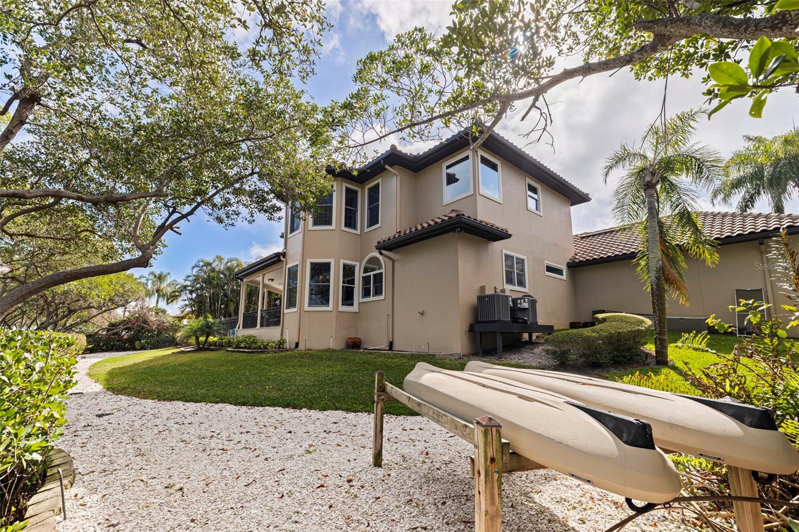 EXPANSIVE WATERFRONT HOME IN GUARD-GATED CAYA COSTA WITH 199 FT OF WATERFRONTAGE, 4 BEDROOMS + OFFICE + MEDIA ROOM + GYM, SALTWATER POOL, BOAT SLIP WITH 16,000 LB LIFT, AND 3-CAR GARAGE. Located in the guard-gated waterfront community of Caya Costa in Northeast St. Petersburg, this executive residence offers 4,384 sq ft of living space on a .34-acre lot with 199 ft of protected waterfront and wide open-water views along Weedon Island Preserve. Designed for both everyday living and entertaining, the home combines boating access, privacy, and a flexible floor plan rarely found in this location. The home includes 4 bedrooms, 3.5 bathrooms, private office, media room, gym, butler’s pantry, 3-car garage, and an extra-wide driveway for additional parking. Interior features include 10-ft ceilings, 8-ft doors, a dramatic two-story foyer, wood-burning fireplace, engineered wood flooring throughout (2024), and a wet bar with wine refrigerator for entertaining. The chef’s kitchen features Wolf, Sub-Zero, and Miele appliances, dual islands for gathering and meal preparation, abundant storage, and a butler’s pantry with prep kitchen. The private office includes custom built-in cabinetry and large windows providing natural light and a quiet workspace. The waterfront primary suite includes a sitting area overlooking the bay and direct access to the balcony. The ensuite bath features dual vanities, dual walk-in closets, soaking tub, walk-in shower, and separate water closet. Outdoor living is centered around the waterfront setting. A large open balcony accessed from the primary suite and media room overlooks the pool and backyard, providing a private vantage point for sunrise and sunset views. The covered lanai includes an outdoor kitchen with bar, dining area, TV, and lounge space overlooking the pool & water. The PebbleTec saltwater pool and spa (2021) overlooks the waterfront with updated pavers, pool equipment, and propane heater (2021). Mature tropical landscaping surrounds the backyard, creating a private outdoor setting with wide open-water views and no rear neighbors looking into the property. Gasparilla Drive NE is a quiet cul-de-sac with only 5 homes sharing a deep-water dock with 6 slips. The assigned slip includes a 16k lb boat lift (2018), water, and 30-amp shore power. Boaters enjoy calm protected water with direct access to Tampa Bay in under 10 minutes (no fixed bridges). Additional outdoor features include a kayak/paddleboard launch with storage, spray mosquito system, side yard turf (2026), and open water views with no neighbors. The home sits at 10.55 ft elevation and was not affected by the storms of 2024. Flood insurance is only $1,143/year. Recent improvements include three AC units replaced (2024-2025), tile roof (2017), flat roof under the upstairs balcony replaced (2026), and balcony decking replaced (2026). Additional features include an elevator and attic storage. Caya Costa offers a secure guard-gated entrance with a monthly HOA of $400. Conveniently located near Publix, Whole Foods, Target, Starbucks, dining, and everyday conveniences. Shorecrest Preparatory School and Canterbury School are approximately five minutes away. Downtown St. Petersburg is a 15-minute drive, and Tampa International Airport is approximately 20 minutes away. This property offers a rare combination of protected boating water, expansive waterfront views, gated privacy, and a secluded backyard setting rarely found in Tampa Bay waterfront homes.