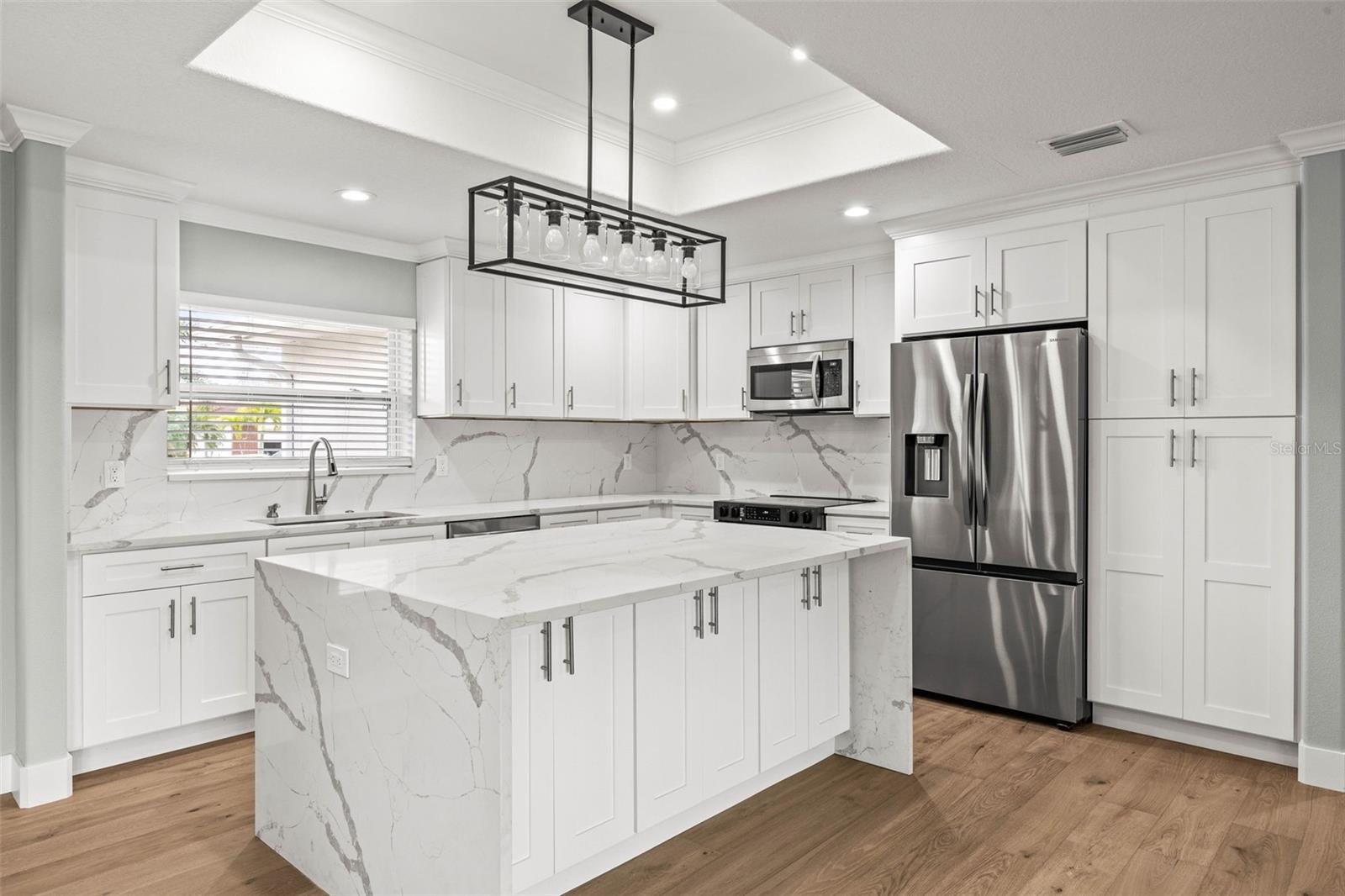 One or more photo(s) has been virtually staged. Completely updated and Move in Ready! This 4 bed 2 bath home has undergone extensive renovations in 2025. Experience the epitome of modern luxury in this meticulously updated waterfront home, that is so crisp it looks like brand new construction. Located in one of St. Petersburg's most desirable communities, this property offers an unparalleled lifestyle. The expansive open floor plan, perfect for entertaining, seamlessly flows into the oversized kitchen. Complete with quartz countertops, stainless steel appliances (2025), and a large waterfall island, the kitchen is a chef's dream. The primary suite boasts water views, a luxurious spa-like bath, and a walk-in closet. Three additional oversized bedrooms provide ample space for family or guests. Step through the sliding glass doors and enjoy your waterfront oasis with a new seawall, dock, and motorized screened-in patio. The beautiful white oak flooring adds a touch of elegance throughout the home. This waterfront dream home is turnkey, with every detail thoughtfully updated. From the contemporary finishes to the impeccable design, it's ready for you to call it home. Enjoy the Brand new Indoor Laundry Nook, Large Kitchen Pantry Cabinet, Dishwasher, Refrigerator, Range, Hot Water Heater, Washer and Dryer!. Roof, Dock and Seawall were replaced in 2020. The community itself is rich in amenities, including a boat ramp, two local parks, a bi-monthly newsletter, a local sandbar, an annual concert on the water, a Christmas Golf Cart Parade, a Christmas Eve Boat Parade, and streets adorned with American Flags for the 4th of July and Memorial weekends. Conveniently situated near downtown St. Pete, Tampa, and a short drive to Clearwater and the Gulf Beaches, this property offers not just a home but a lifestyle. Don't miss the opportunity to make this waterfront haven your own! The home was completely remediated and remodeled by a luxury General Contractor. All work was permitted by the city. This home only flooded once in its lifetime! Flood policy is assumable. Schedule a showing today.