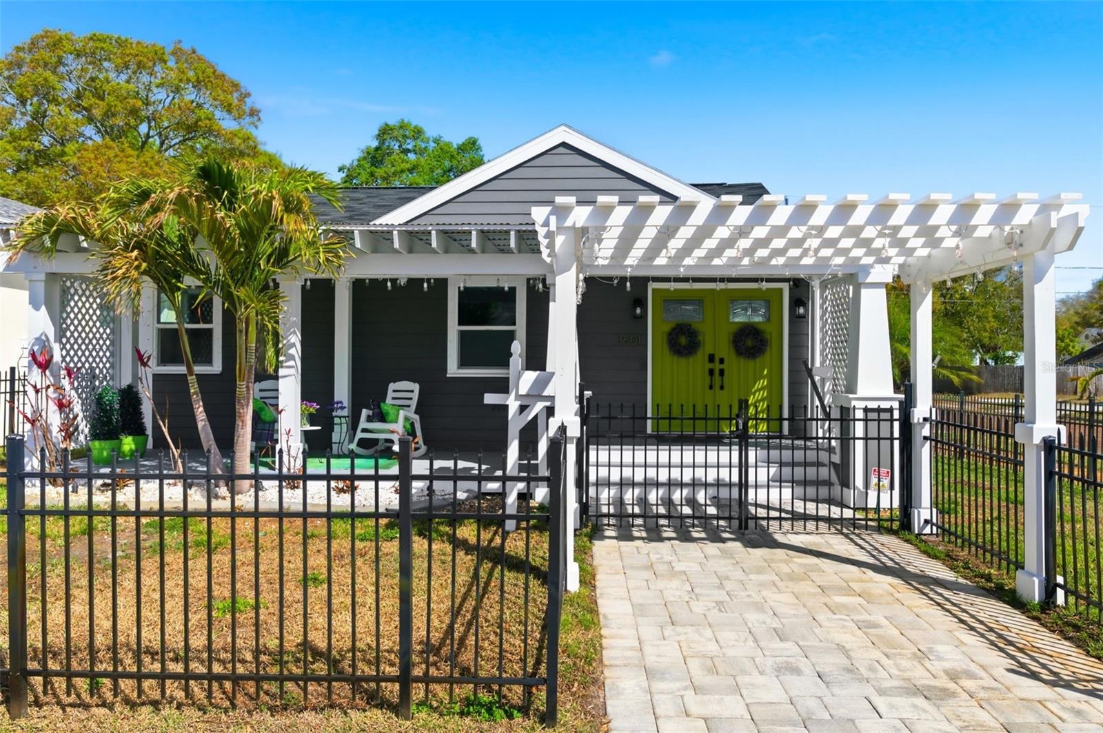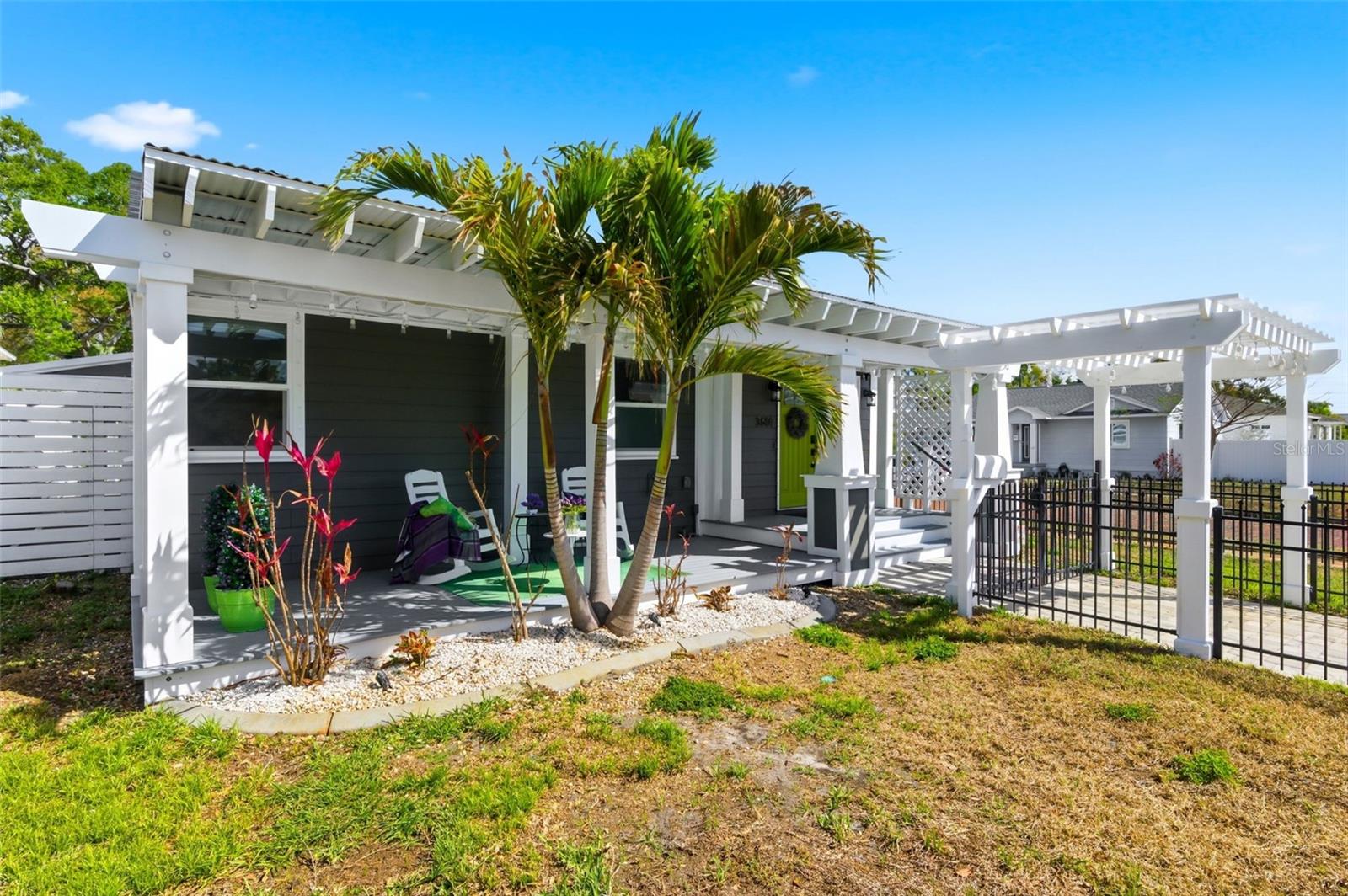 Fully remodeled historic 1947 bungalow just minutes from Downtown St. Petersburg and only 15 minutes to the Gulf beaches! Located in a non-flood X zone, this 3-bedroom, 2-bath single-family home blends timeless charm with modern upgrades in one of St. Pete’s most vibrant and desirable locations. Inside, the open-concept layout creates a bright and welcoming space ideal for entertaining and everyday living. Bamboo floors, custom woodwork, and designer light fixtures add warmth and character throughout. The gourmet kitchen features a striking designer stone accent wall, HAIER gas range/convection oven, gas cooking, and stylish finishes that elevate the heart of the home. A full dining area provides comfortable space for gatherings and dinner parties. Offering 1,341 heated sq ft (1,811 total sq ft), the home includes a brand-new bathroom, recently painted interior and exterior, and major system updates for peace of mind: new plumbing and electrical (2019), new sewer line (2021), and tented for termites (11/2025). City water supply. Enjoy the ultimate Florida lifestyle near Central Avenue’s award-winning restaurants, art galleries, murals, live music, waterfront parks, and nightlife — all just minutes from your front door. Bike downtown, stroll to local cafés, visit the pier, or head to the beach for sunset. This location offers the perfect balance of culture and coastal living. Outdoor living shines with a welcoming 256 sq ft front deck, paver front entrance, and custom fencing enclosing both the front and spacious backyard — ideal for pets, entertaining, gardening, or creating your own private retreat. The oversized backyard offers room to expand or add a pool. Sprinkler system included. Additional features include Kevlar fabric AstroGuard hurricane storm shutters, Ring camera system with interior and exterior coverage, and a one-car garage for storage and convenience. This artsy bungalow captures the spirit of St. Pete living — historic character, modern updates, walkable culture, and coastal access — all in an X flood zone location. Move-in ready and perfectly positioned to enjoy everything the city provides.