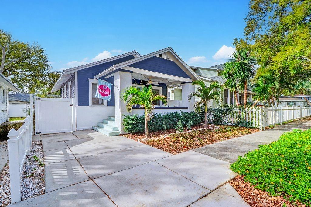 Classic 1922 Roser Park Bungalow located near downtown, USF and The Pier. This beautifully updated 2 bedroom, 1 bath home has a small footprint, yet is surprisingly spacious with a large front porch to enjoy your mornings and evenings on. As you enter, there are gorgeous wood floors that run throughout the home and a large fireplace with classic bungalow windows flanking each side of the mantel. The dining room, living room and kitchen all have elegant, chandelier style lighting, adding even more charm to this lovely home. The galley kitchen is laid out well with updated appliances and a gas range for those that love to cook. Both bedrooms are spacious and the bathroom is freshly updated as is the rest of the home. An additional laundry room is just off the kitchen and has room to add a possible 2nd bath if desired. The quaint backyard is freshly landscaped and low maintenance with a patio and newer vinyl fencing. Updates in last few years include a rebuilt foundation; double paned windows; kitchen appliances and countertops; all wood flooring restored and the entire home was painted. Both the kitchen and bathroom were updated, along with many plumbing updates as well. Conveniently located in an historic district and close to many shops, restaurants, community festivals, events, renown museums and next to the famous Greenwood Cemetery, this won't last long, so hurry and make an appointment today!