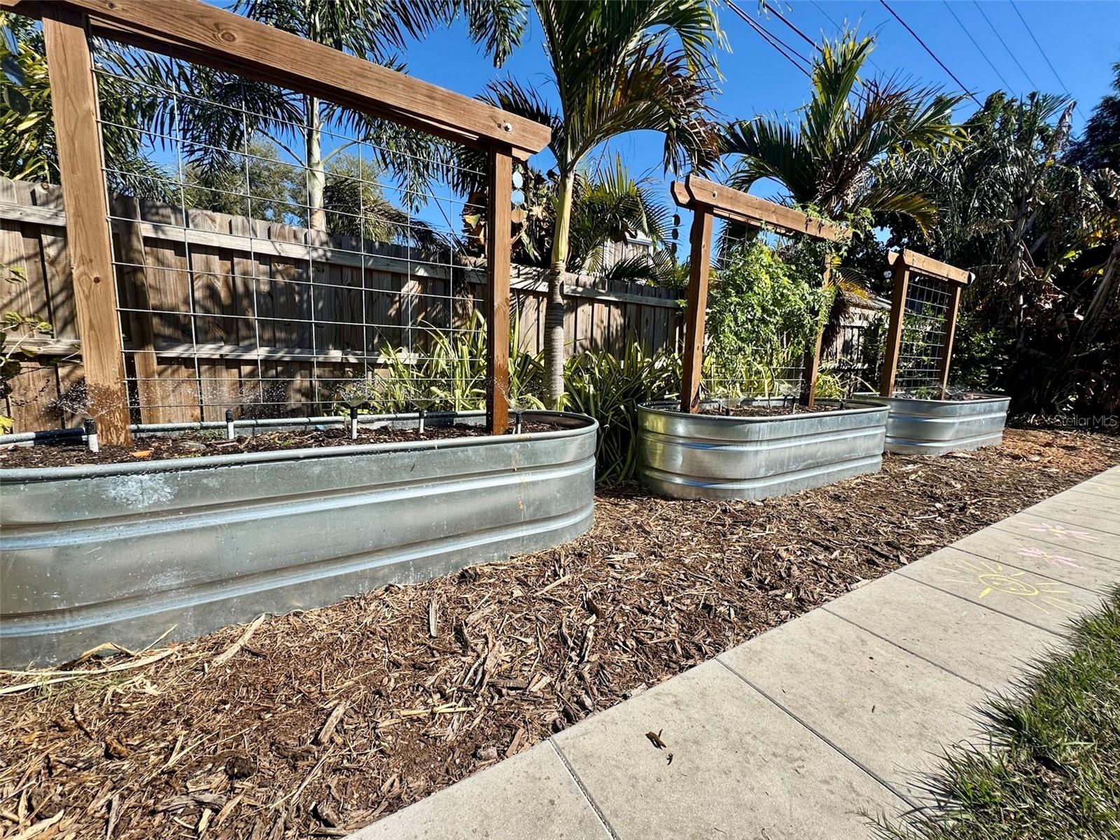 Bright and cozy Florida-style bungalow in the heart of north St. Petersburg. Located a quarter mile from I-275, 8-minute walk (2 blocks) to Kiwanis Park, 10 minute drive to Downtown St Pete, and a 20 minute drive to the gulf beaches. Roof replaced in 2017. Complete AC replacement in 2020. Original hardwood floors, lots for natural light, recessed lighting, ceiling fans in bedrooms, and an open floor plan that’s perfect for entertaining. The updated kitchen showcases marble backsplashes, quartzite countertops, full height cabinetry (with slide-out inserts), and stainless-steel appliances. The backyard includes a 6ft tall fence, sealed and stained raised deck, perimeter sidewalk, artificial turf pad for exercise or a kid’s play area, natural lawn space for sports and pets, three galvanized stock tank raised planters (includes irrigation) with garden trellises, fruiting trees (lime, banana, and jackfruit) along with established tropical trees, palms, and bamboo providing privacy and year-round shade. The complete exterior has been recently pressure washed, sealed, and painted. Front yard is an established native Florida plant palette including sabal palms, slash pines, royal palm, and a stately live oak—creating a low-maintenance landscape that minimizes mowing and maximizes resilience. Additional features that add long-term value, safety, and efficiency, include solar panels (lease) for reduced energy costs, whole-house water treatment system, and a brick paver circular driveway for added parking and curb appeal. Attached garage for vehicle and household storage. This house is not located in a flood zone. This property offers the perfect blend of charm, thoughtful upgrades, and outdoor living—all in one of St. Petersburg’s most convenient locations.
