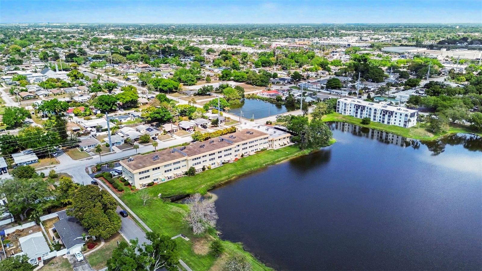 One or more photo(s) has been virtually staged. This spacious first-floor condo offers an ideal blend of convenience, comfort, and peaceful waterfront living. The community pool sits directly in front of your front door—perfect for relaxing or keeping an eye on little ones—while the back door opens to a beautiful lake view that brings a sense of calm to everyday life. Inside, the long, open layout creates a natural flow from the kitchen into a combined dining and living area, offering plenty of room to arrange your space just the way you like it. Ceramic tile flooring runs throughout the home for easy maintenance and a clean, cohesive look. The primary suite overlooks the lake and features its own private bathroom with a walk-in shower (no tub), a walk-in closet, and a red heat lamp for added comfort. The secondary bedroom sits on the pool side of the building and includes a built-in closet and great natural light. All appliances—including the washer and dryer—are included, making this home truly move-in ready. Residents enjoy a friendly, welcoming community atmosphere. One neighbor described it as “a fantastic place to live,” with quick access to Tyrone Mall, restaurants, and everyday conveniences, plus an easy drive to downtown St. Petersburg and the beaches. Whether you're looking for a primary residence, seasonal retreat, or investment opportunity, this condo delivers exceptional value in a central St. Pete location.