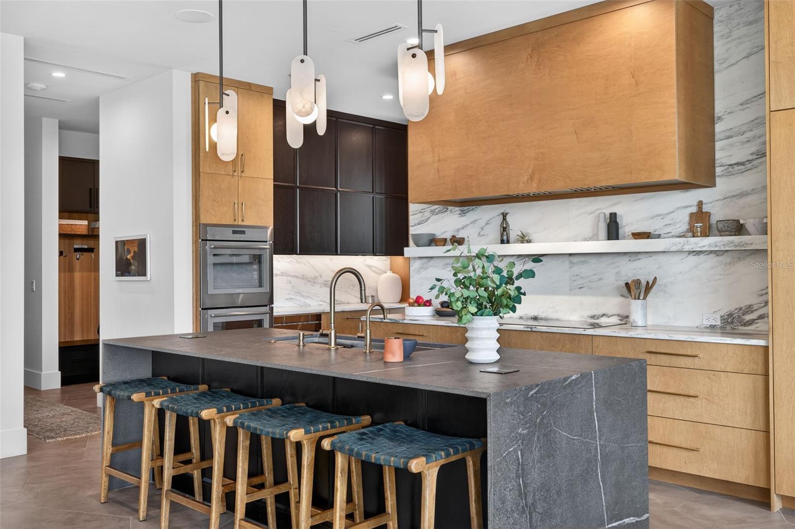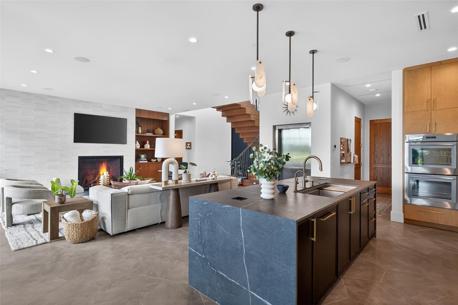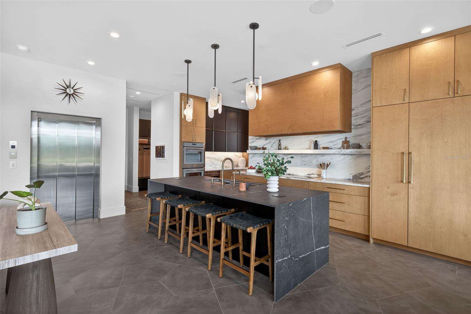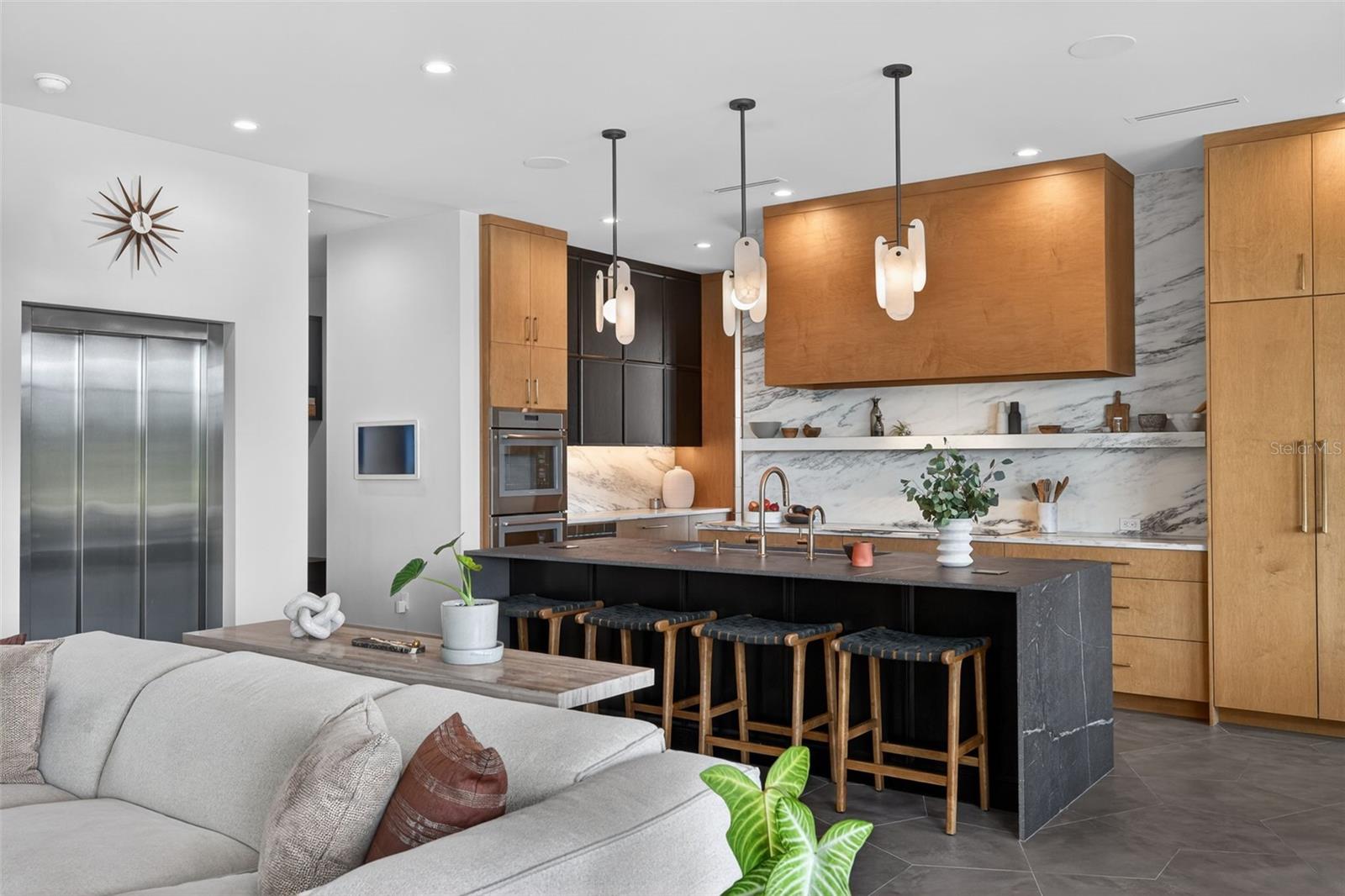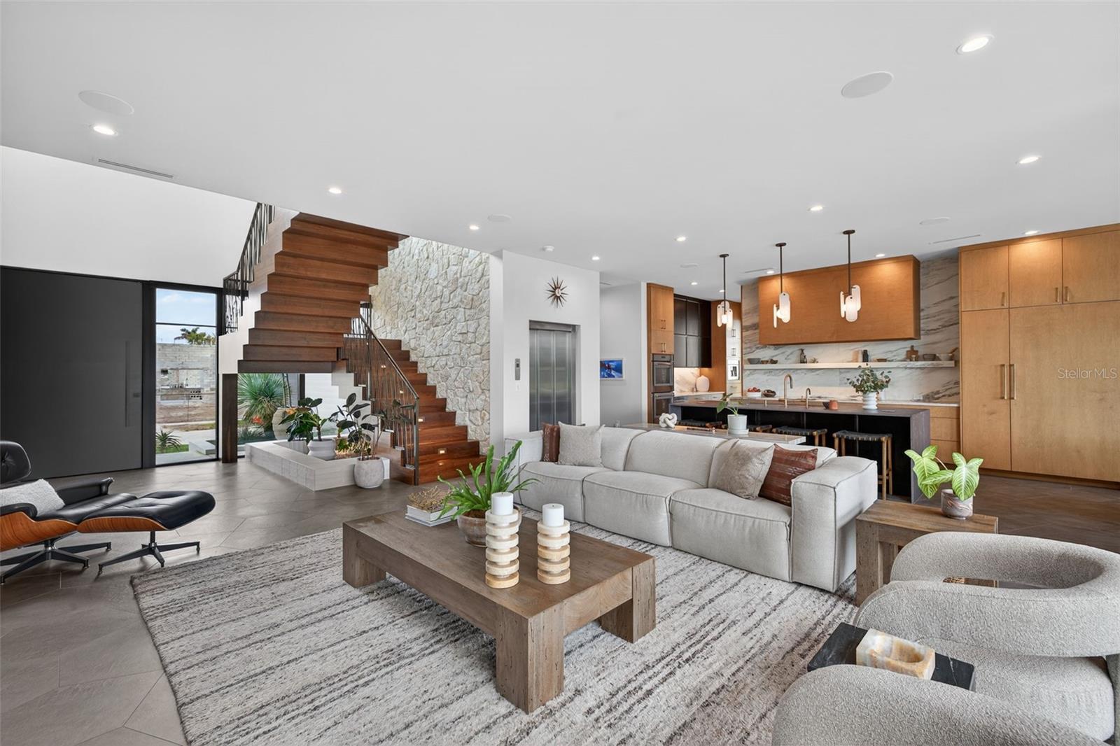 Once in a lifetime, a property like this becomes available. Truly striking Contemporary Modern residence positioned on one of the most distinctive homesites in St. Petersburg, where waterfront living meets golf-course frontage. Completed just two years ago by Bright Bay Builders, this 4,338-square-foot architectural showpiece sits on the 16th hole, a signature Island Greens, of the premier private Vinoy Golf Course, offering a rare combination of expansive fairway views and serene waterfrontage. One of only twenty-five properties with this distinctive setting. Designed with clean lines and curated finishes throughout, the home features four bedrooms, four and a half bathrooms, a private office (with a closet), and a commercial-grade elevator, seamlessly blending form and function for elevated daily living. Walls of glass frame the natural surroundings, while warm wood accents and modern textures create a refined yet inviting aesthetic that gives California cool vibes. The open-concept layout is ideal for both intimate living and large-scale entertaining. Custom porcelain laser jet tile flooring on the main level and 10' ceilings with custom light fixtures throughout. Stunning views of Downtown skyline from both levels of this residence. Solid concrete home with concrete poured walls built on a reinforced augercast pile foundation system, an elevated construction standard designed for durability and peace of mind. One-of-a-kind custom kitchen featuring a solid porcelain slab kitchen island with a waterfall edge, featuring The Galley kitchen sink. Danby Marble countertop with Thermador column wine refrigerator, full refrigerator, full freezer, and a hidden champagne/beverage trough. Kitchen cabinetry with brass pulls, and a mixture of stained Maple and black stained Oak. Just off the kitchen and the oversized 2 car garage is a custom drop zone with built-ins, so everything has a place. Massive walk-in pantry, Thermador refrigerator drawers, and a coffee station, downstairs and upstairs laundry. Pocketing sliding doors lead you to a beautiful balcony with an outdoor kitchen complete with a built-in gas grill, refrigerator, and pizza oven.  Custom Sekas pool to be installed and included in the purchase price. Sellers are currently in queue for installation. Sonos sound system throughout and shades on timers with accent lighting and shade pockets. The guest bedroom with an ensuite bathroom, as well as an office, and powder bath, is located on the main level. Up the solid walnut sawtooth staircase, you will find the residential wing of the home. A spacious loft/living area overlooking the golf course and the Downtown skyline. Split bedroom floor plan. Primary is absolutely dreamy with approximately 270 sqft of custom closet with washer/dryer, and built-in ironing station, a large en-suite bathroom with wet zone soaking tub and walk-in shower featuring GRAFF plumbing fixtures. Two additional mirror-image bedrooms with walk-in closets and en-suite bathrooms complete the second level.   perfectly positioned to capture both the water and golf course vistas. While not deep-water boating, the property offers a peaceful pond with an abundance of wildlife, expanding a waterfront lifestyle suited for kayaking and paddleboarding. This is a rare opportunity to own a new construction home with architectural significance in one of St. Petersburg’s most desirable golf and waterfront corridors.