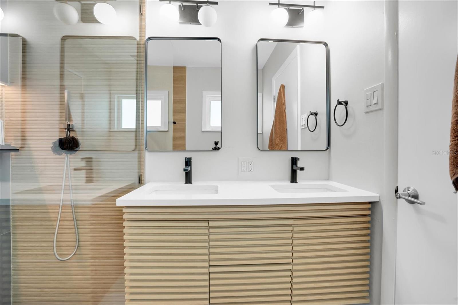 Step into timeless style with this authentic Mid-Century Modern 2-bedroom, 2-bath block home—perfectly blending classic design with today’s must-have updates. Located in a no flood zone and thoughtfully upgraded throughout, this property offers true peace of mind with a new roof (2024), impact-rated windows and sliders, a custom front door, and a 2022 AC system. Situated on a desirable corner lot, the property features a huge fenced yard (2024), mature landscaping, and plenty of space for all your lifestyle needs—including boat or RV parking. The outdoor living is a true highlight, with an expansive paver patio, covered and screened lanai, and a stunning saltwater pool with a 2023 system—perfect for relaxing or entertaining year-round. Inside, the home blends classic design with modern upgrades. The updated kitchen features quartz countertops, Whirlpool Gold Series stainless steel appliances, and generous storage. A spacious living and dining room combo is enhanced by a custom soundproof accent wall with theater lighting, creating a unique and inviting atmosphere. Tile flooring throughout adds durability and a clean, cohesive look. The oversized primary suite is a true retreat, complete with a walk-in closet featuring quartz built-ins and a beautifully updated ensuite bathroom with a double vanity and a sleek glass-enclosed rainfall shower. The second bedroom is generously sized with dual closets, and the home offers ample storage throughout. Additional features include an oversized one-car garage, paver driveway, and a new custom front door that enhances curb appeal. Ideally located just 10 minutes to Treasure Island Beach and 10 minutes to Downtown St. Petersburg, this home offers the perfect combination of character, updates, and convenience.