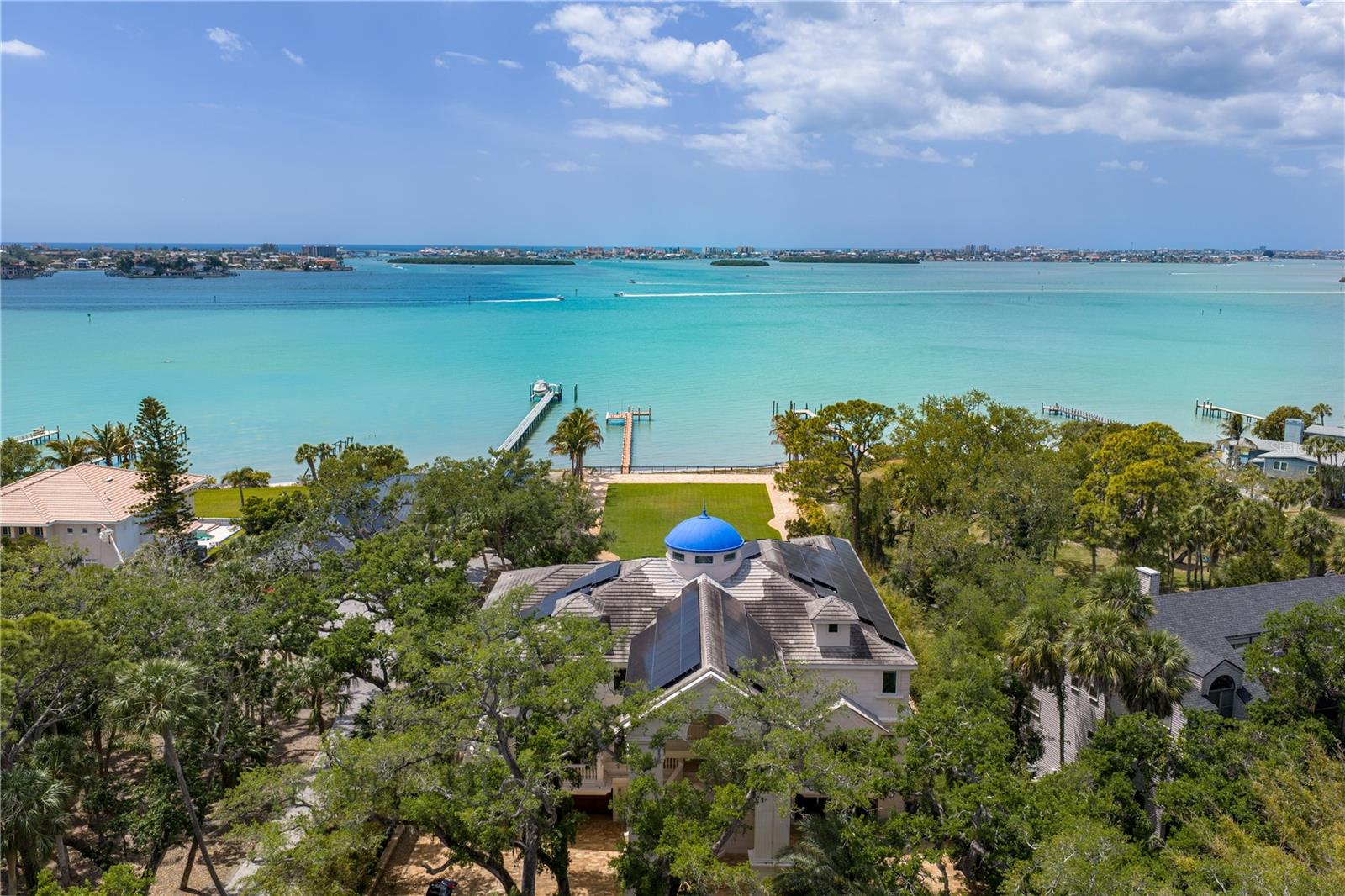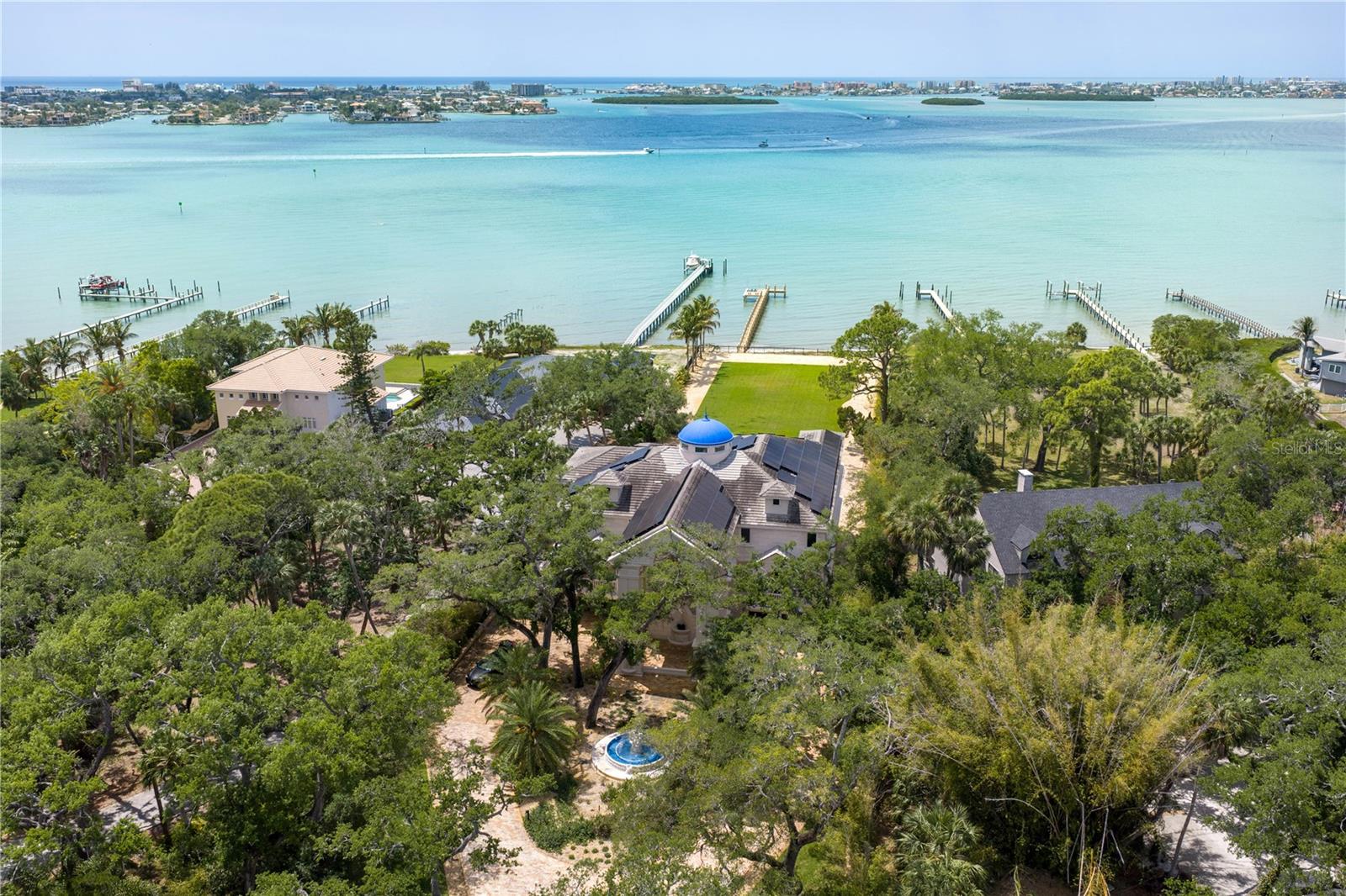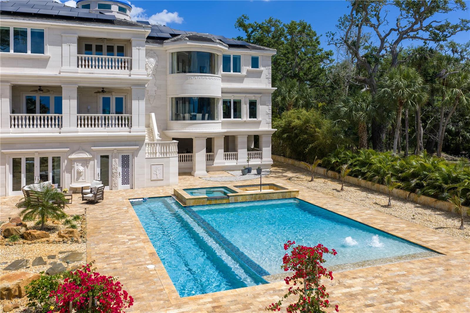 Palazzo Sul Mare is a rare waterfront estate in St. Petersburg’s coveted Jungle Prada neighborhood, offering over 19,000 square feet under roof and more than 10,000 square feet of luxurious interior living space on over 1.5 acres along the Intracoastal Waterway. Built in 2020, this residence blends modern construction with timeless European-inspired design—an offering rarely found in this market. A grand motor court and porte-cochère create a secure, estate-style arrival. The limestone exterior, curated from Portugal, along with wrought iron detailing, a distinctive blue dome, fountain, marble statuary, and mature oak trees, establishes a timeless setting surrounded by lush tropical landscaping and the neighborhood’s iconic peacocks. Inside, a dramatic domed rotunda crowned by a statement crystal chandelier anchors the home, featuring inlaid marble flooring and dual sweeping marble staircases. The layout captures water views throughout, with a gallery-style corridor ideal for art, a grand piano, or entertaining. Marble-encased archways and columns, intricate gold balustrades, and detailed ceilings create a striking architectural presence, while illuminated art niches enhance the home’s scale and design continuity. Custom millwork, fresco-style ceilings, and imported marble flooring span all three levels. The kitchen features a full suite of Thermador appliances, including a 60-inch gas range, integrated refrigeration, and built-in coffee system, along with quartzite surfaces and an illuminated onyx island. A custom Chihuly-style installation of hand-blown glass creates a dramatic, one-of-a-kind focal point above, while the curved glass dining area frames panoramic water and pool views, with expansive space to accommodate large-scale dining, multiple seating arrangements, or extended entertaining areas. The residence includes multiple bedroom suites, several exceeding 1,000 square feet. Many suites feature spa-inspired bathrooms with designer tilework, rainfall showers, expansive closets, and private lanais with water or garden views. The main-level primary suite offers a marble bath with Phylrich fixtures, sauna, soaking tub, multiple vanities, private lanais, and panoramic water views beneath a custom fresco ceiling. A private office on the main level features paneled walls, built-ins, an ornate stone fireplace, and balcony access. The upper level includes a club-style lounge with a waterfall quartzite bar and sunset views. The home spans three levels with elevator access and marble staircases. Laundry rooms on multiple levels add everyday functionality. Outdoor living includes a zero-entry pool, lap pool, hot and cold spas, expansive terraces, courtyards, fire pit, private sandy beach, citrus trees, and a wide rear lawn. The grounds offer space for a guest house or ADU, sport court, cabana, or greenhouse. The private dock includes a 10,000-lb lift, additional lifts for personal watercraft, wet slip for a yacht, and direct Gulf access. Built for longevity with pier-and-beam construction on pilings, impact-rated windows and doors, and a stone exterior. Smart home technology includes full security camera coverage. Solar power and whole-house generators enhance efficiency and reliability. Garage capacity for approximately 6 vehicles includes additional space for a workshop, recreation, or gym, plus over 5,000 square feet of lower-level flex space. A rare combination of scale, craftsmanship, and waterfront presence.