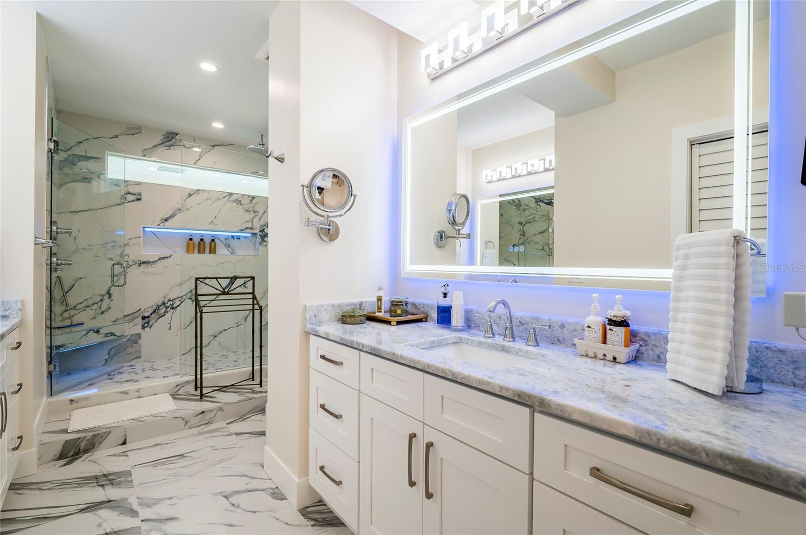 This extraordinary, one-of-a-kind smart penthouse in Brightwaters Tower offers a rare opportunity to own the entire 9th-floor top level, spanning an impressive large living space, ideally located within the Snell Isle community. Originally two large penthouses, now expertly combined into one expansive luxury residence, this home delivers an unmatched sense of scale, privacy, and exclusivity rarely found in condominium living. Fully renovated completed in 2025, the residence showcases all-new interior finishes throughout, creating a fresh, modern, move-in-ready environment. Designed for both comfort and entertaining, the home includes a chef’s kitchen with bar seating, along with a unique breakfast bar adjoining the primary suite. The layout seamlessly blends open living areas with private retreats, all framed by breathtaking panoramic views of Tampa Bay, including the iconic St. Pete Pier, stretching from the Sunshine Skyway Bridge to the skyline of Downtown Tampa. The home offers generous storage throughout, including two spacious walk-in closets in the primary suite and an additional walk-in closet in one of the guest bedrooms. Further enhancing convenience, the property includes two assigned ground-level storage units, providing ample space for seasonal items, recreational gear, and more. Outdoor living is equally impressive. The north side boasts an oversized open rooftop terrace—ideal for entertaining or relaxing under the Florida sky—while the south side features an enclosed terrace complete with a spacious wet bar and additional living area, all designed to maximize the stunning waterfront vistas. Brightwaters Tower is a solid block constructed building that has been meticulously maintained and thoughtfully updated. The building is Milestone-inspected and passed, fully funded with well-managed reserves, and features a full-time on-site property maintenance manager, ensuring top-tier management and care. Recent enhancements include a beautifully renovated lobby, an elegant grand social room, a heated pool with paver decking, and upgraded seawall and docks. Residents enjoy a range of amenities, including shuffleboard courts, a BBQ grilling area, and a sun deck perfect for taking in Florida’s natural beauty and endless water views. Nearby, Snell Isle Marina offers convenient options for boating and potential dockage. Ideally situated, this residence is just minutes from vibrant Downtown St. Petersburg, offering world-class dining, shopping, arts, and entertainment. This exceptional penthouse also includes four covered parking spaces, adding to its rarity and convenience. Schedule your private showing today and experience a truly distinctive, fully updated waterfront residence in one of St. Petersburg’s most sought-after locations.