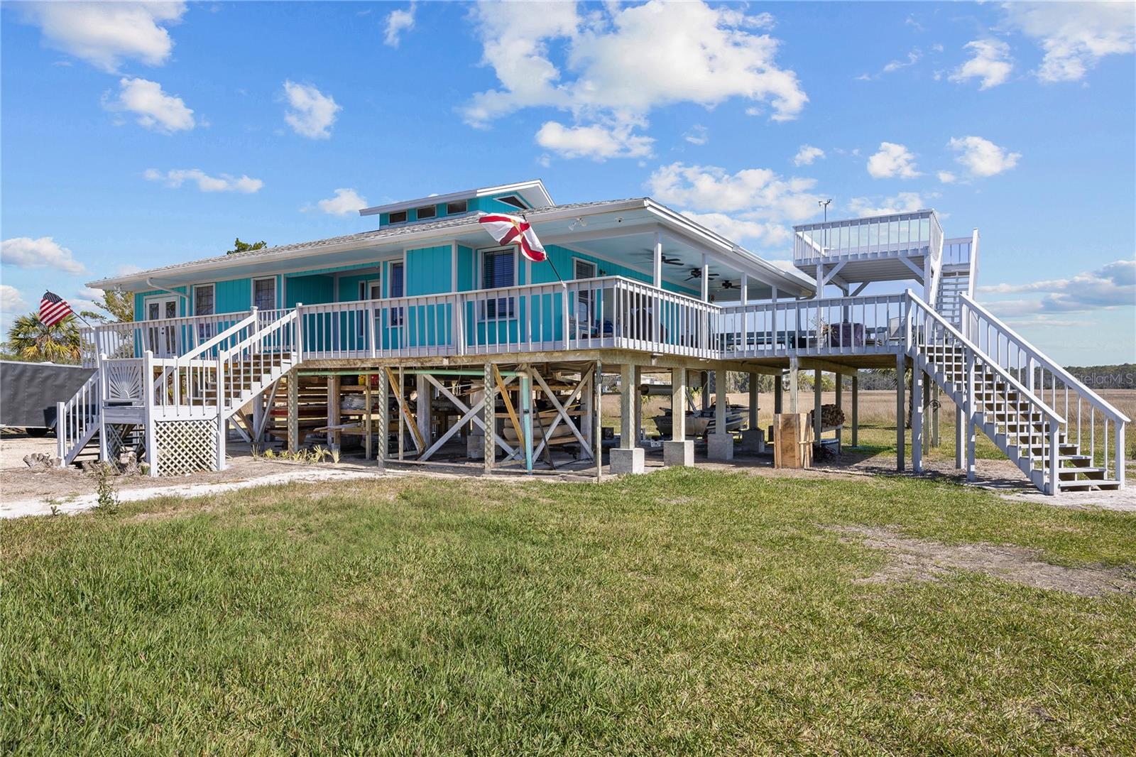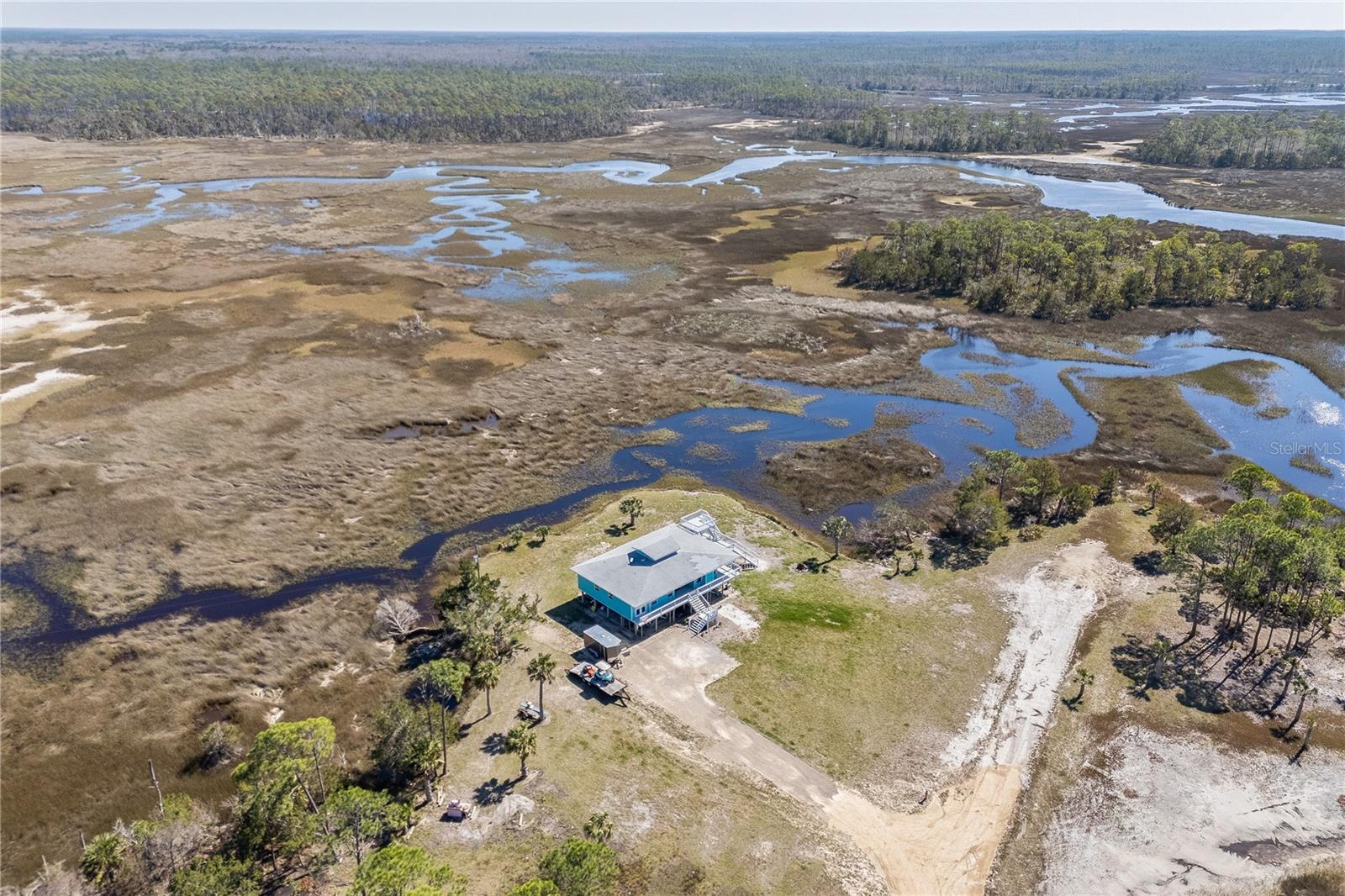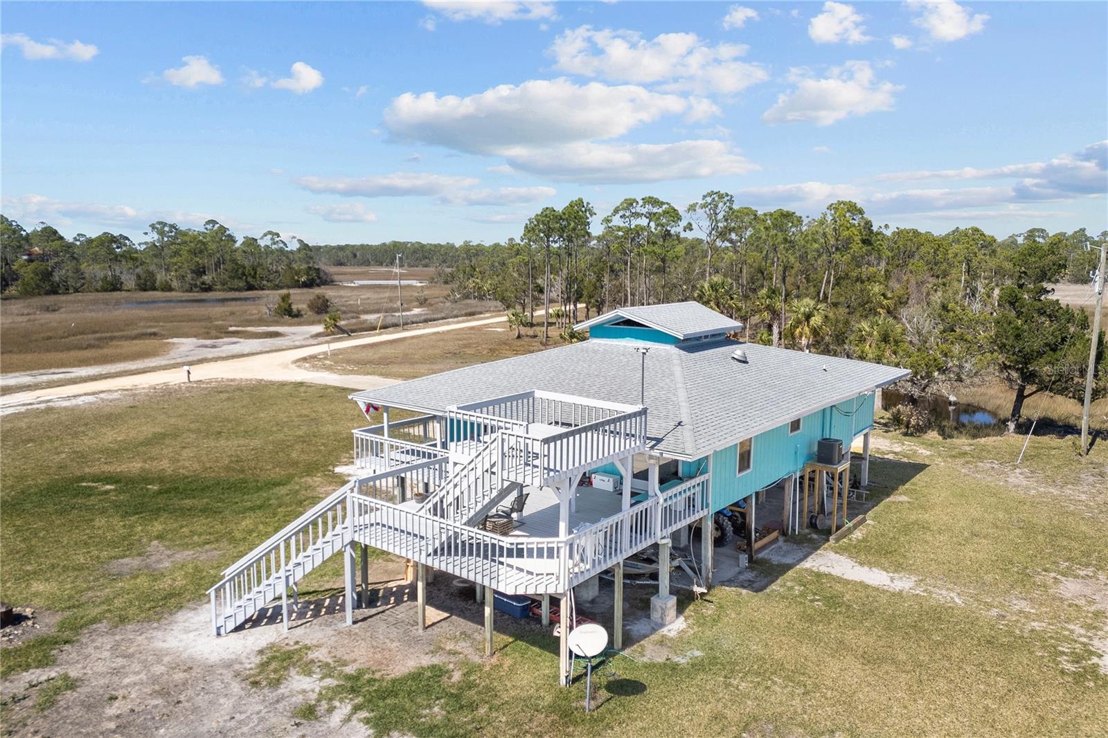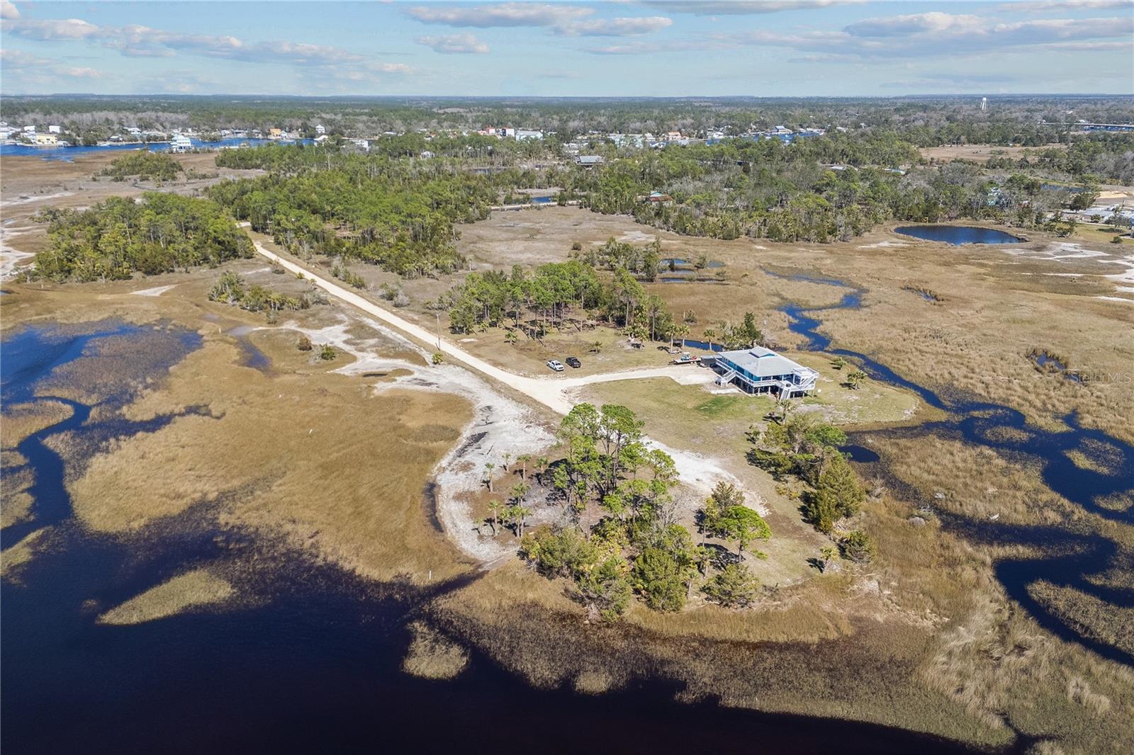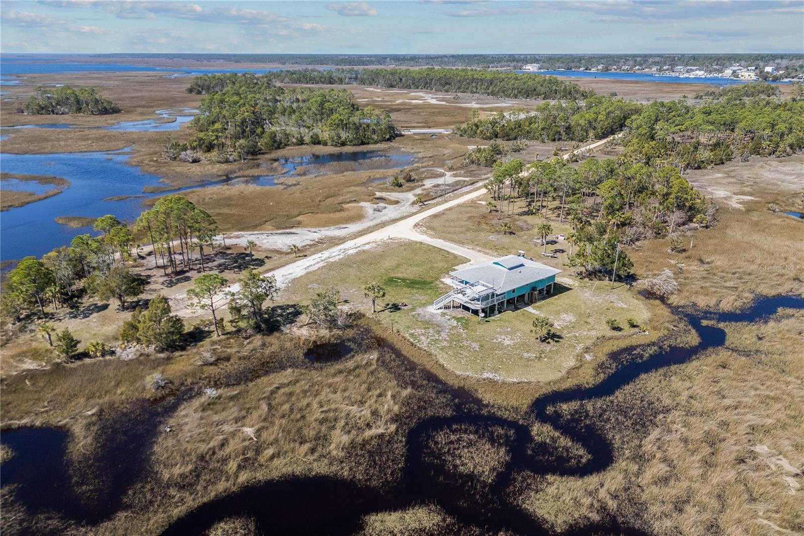 Experience paradise at the end of your private lane, where every vista showcases the beauty of the Gulf of Mexico, saltwater channels, and awe-inspiring sunsets. Nestled on 25.5 +/- acres in the thriving community of Steinhatchee, this 4-bedroom, 2-bathroom haven is a rare gem. Immerse yourself in nature as you relax on one of the decks, fish from your backyard, and marvel at the abundance of wildlife and birds. Recently refreshed with exterior painting, this home has weathered every storm with resilience, standing as a testament to its durability and strength. This home harmoniously blends with its natural surroundings, welcoming you with a charming open floor plan. The kitchen boasts custom-designed copper range hood and handcrafted cedar countertops, adding an artistic touch to the space. Glass French doors off the dining room lead to expansive three sided decks, offering breathtaking views and providing an ideal setting for entertaining friends and family. Below, ample space awaits to park your boat, toys, or create an outdoor kitchen area, offering endless possibilities for enjoyment. With state-owned land to the West and South, as well as a significant portion of the East, rest assured of unparalleled privacy and seclusion. Additionally, the property is divided into 3 separate parcels, opening avenues for future family homes or other ventures. Steinhatchee boasts top-notch amenities, including the state-of-the-art Deadman's Bay marina and the renowned Sea Hag Marina, accompanied by a variety of restaurants and shops. Known for its scalloping season and year-round fishing, this locale caters to outdoor enthusiasts. Conveniently located just an hour and a half from Gainesville, 49 minutes to Chiefland, and minutes from Florida's premier rivers and springs, this waterfront sanctuary offers the perfect blend of tranquility and accessibility. Don't miss this unparalleled opportunity to live in harmony with nature in one of Florida's most sought-after destinations.