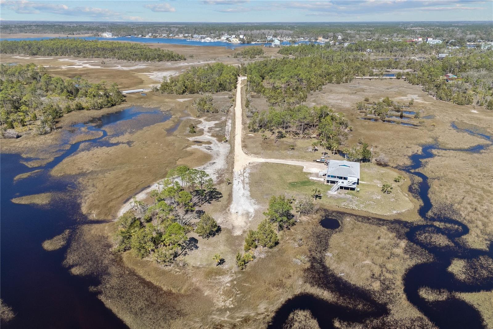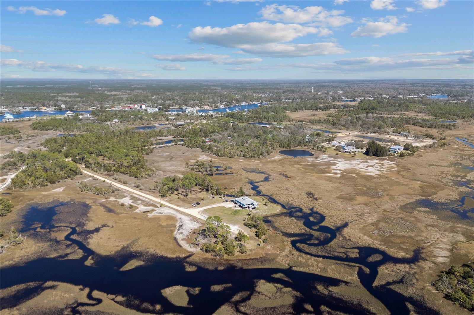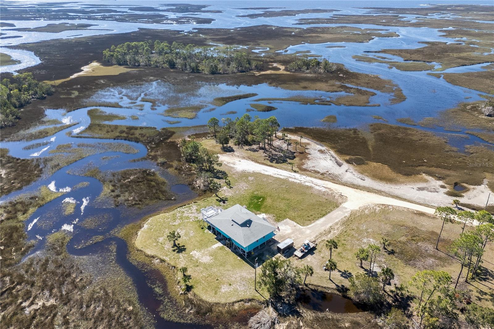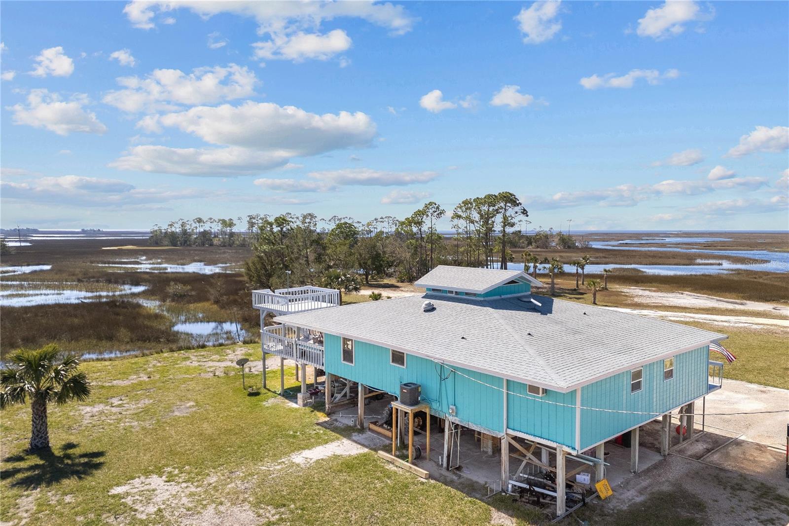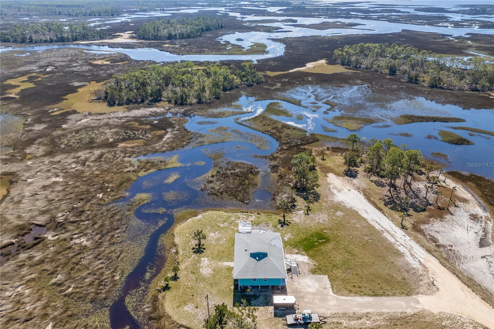 Experience paradise at the end of your private lane, where every vista showcases the beauty of the Gulf of Mexico, saltwater channels, and awe-inspiring sunsets. Nestled on 25.5 +/- acres in the thriving community of Steinhatchee, this 4-bedroom, 2-bathroom haven is a rare gem. Immerse yourself in nature as you relax on one of the decks, fish from your backyard, and marvel at the abundance of wildlife and birds. Recently refreshed with exterior painting, this home has weathered every storm with resilience, standing as a testament to its durability and strength. This home harmoniously blends with its natural surroundings, welcoming you with a charming open floor plan. The kitchen boasts custom-designed copper range hood and handcrafted cedar countertops, adding an artistic touch to the space. Glass French doors off the dining room lead to expansive three sided decks, offering breathtaking views and providing an ideal setting for entertaining friends and family. Below, ample space awaits to park your boat, toys, or create an outdoor kitchen area, offering endless possibilities for enjoyment. With state-owned land to the West and South, as well as a significant portion of the East, rest assured of unparalleled privacy and seclusion. Additionally, the property is divided into 3 separate parcels, opening avenues for future family homes or other ventures. Steinhatchee boasts top-notch amenities, including the state-of-the-art Deadman's Bay marina and the renowned Sea Hag Marina, accompanied by a variety of restaurants and shops. Known for its scalloping season and year-round fishing, this locale caters to outdoor enthusiasts. Conveniently located just an hour and a half from Gainesville, 49 minutes to Chiefland, and minutes from Florida's premier rivers and springs, this waterfront sanctuary offers the perfect blend of tranquility and accessibility. Don't miss this unparalleled opportunity to live in harmony with nature in one of Florida's most sought-after destinations.