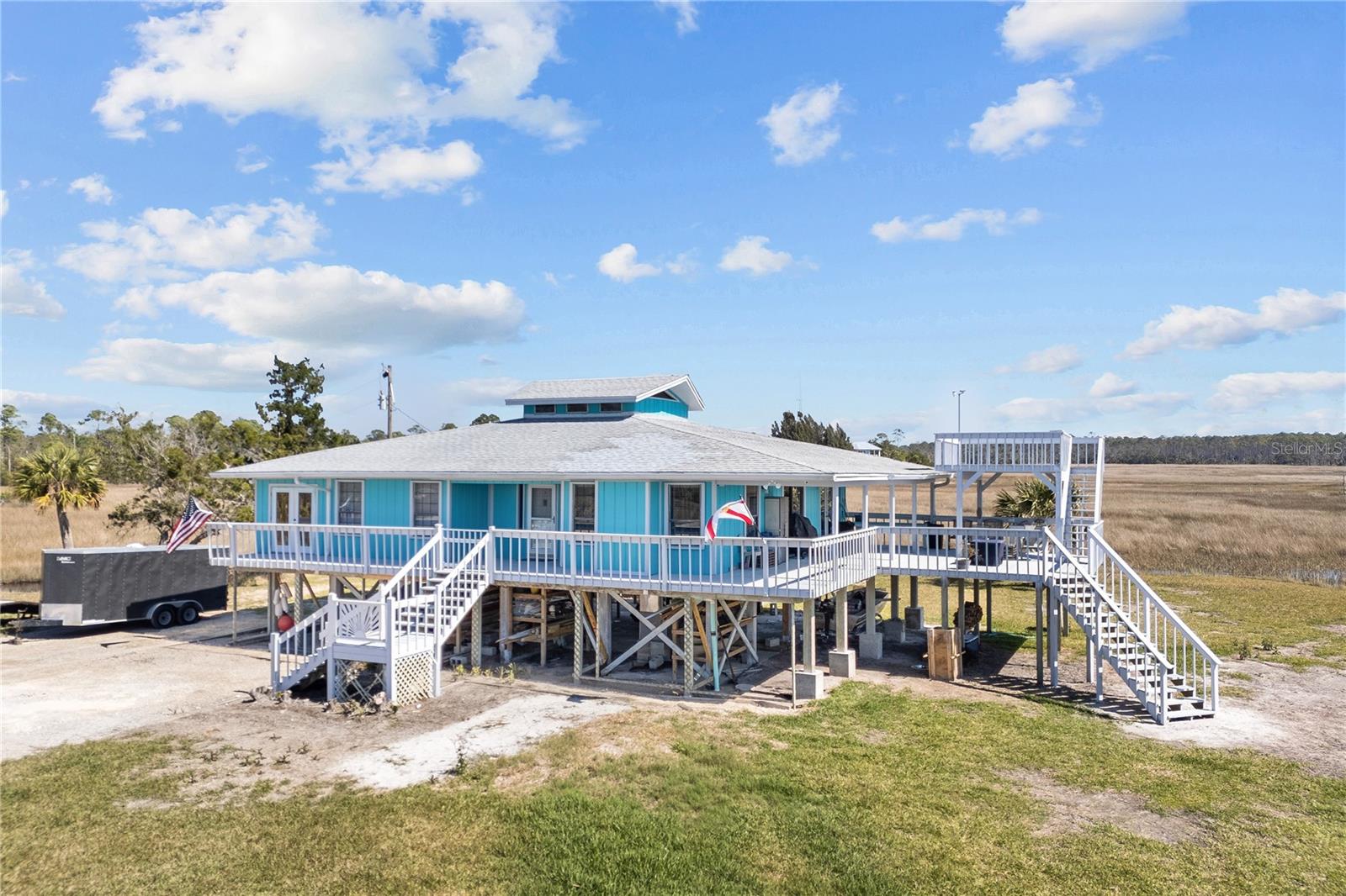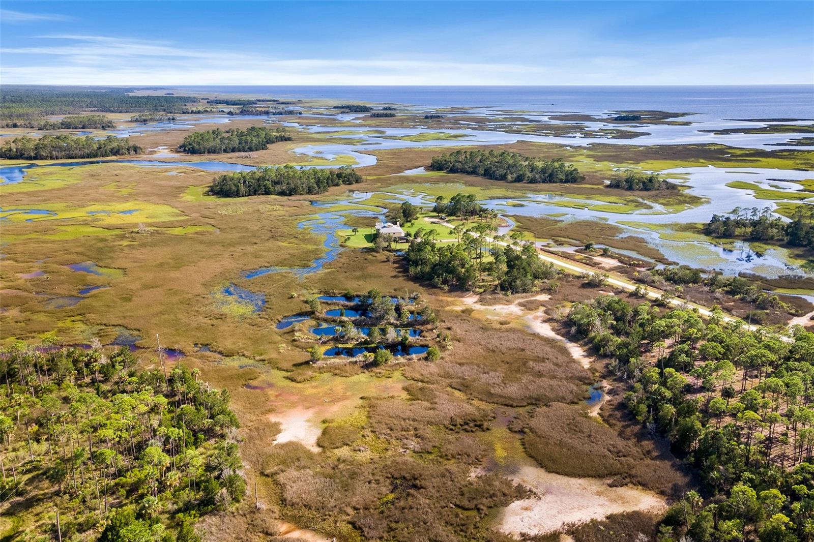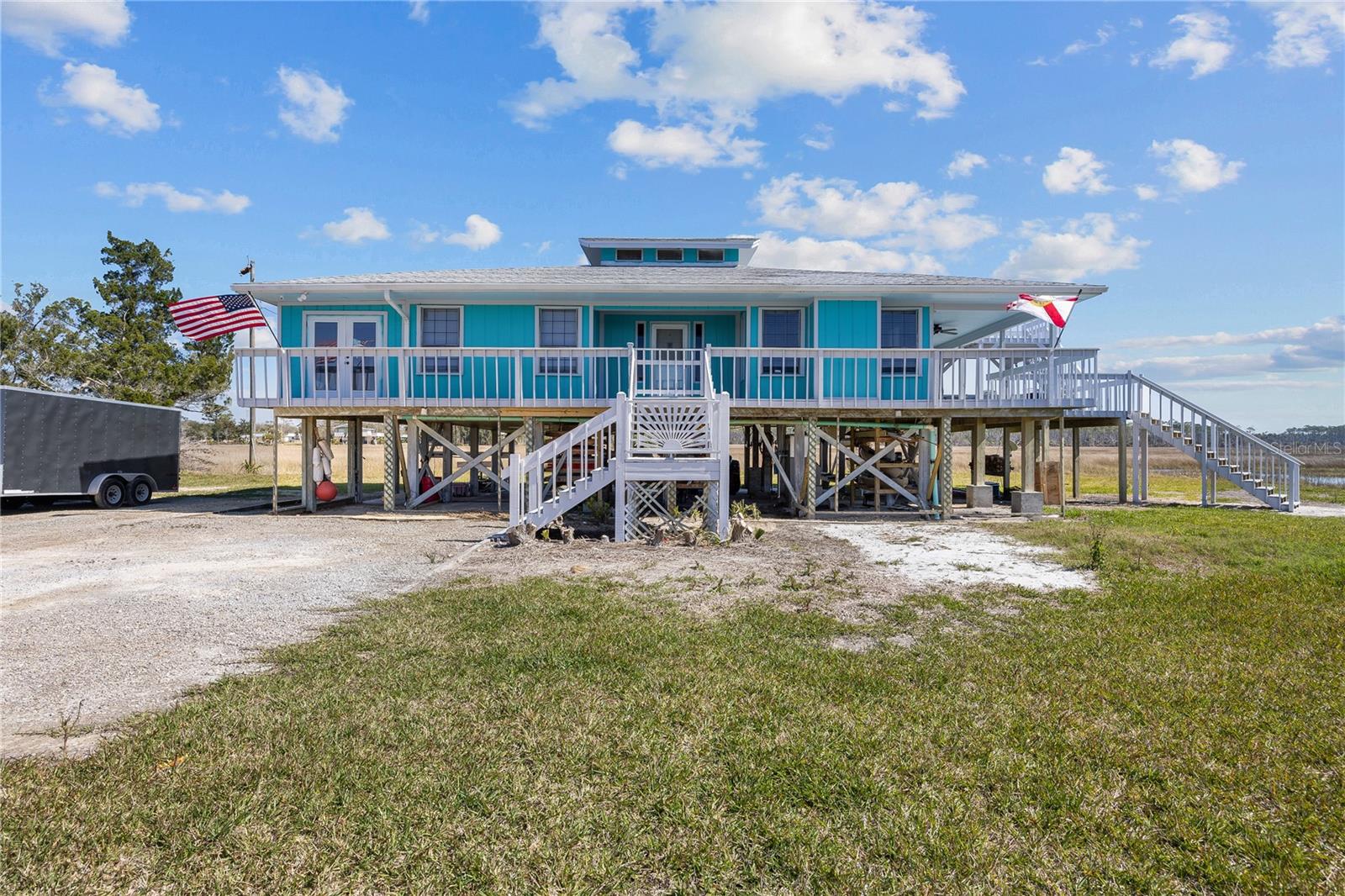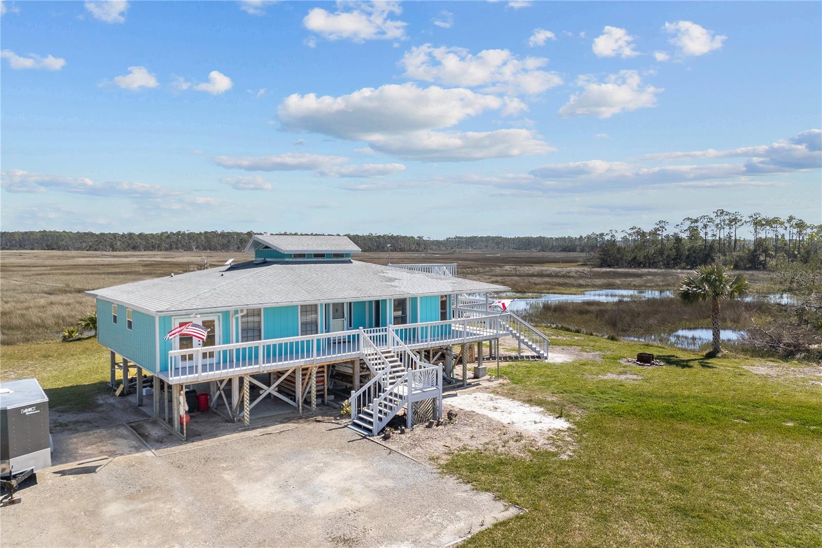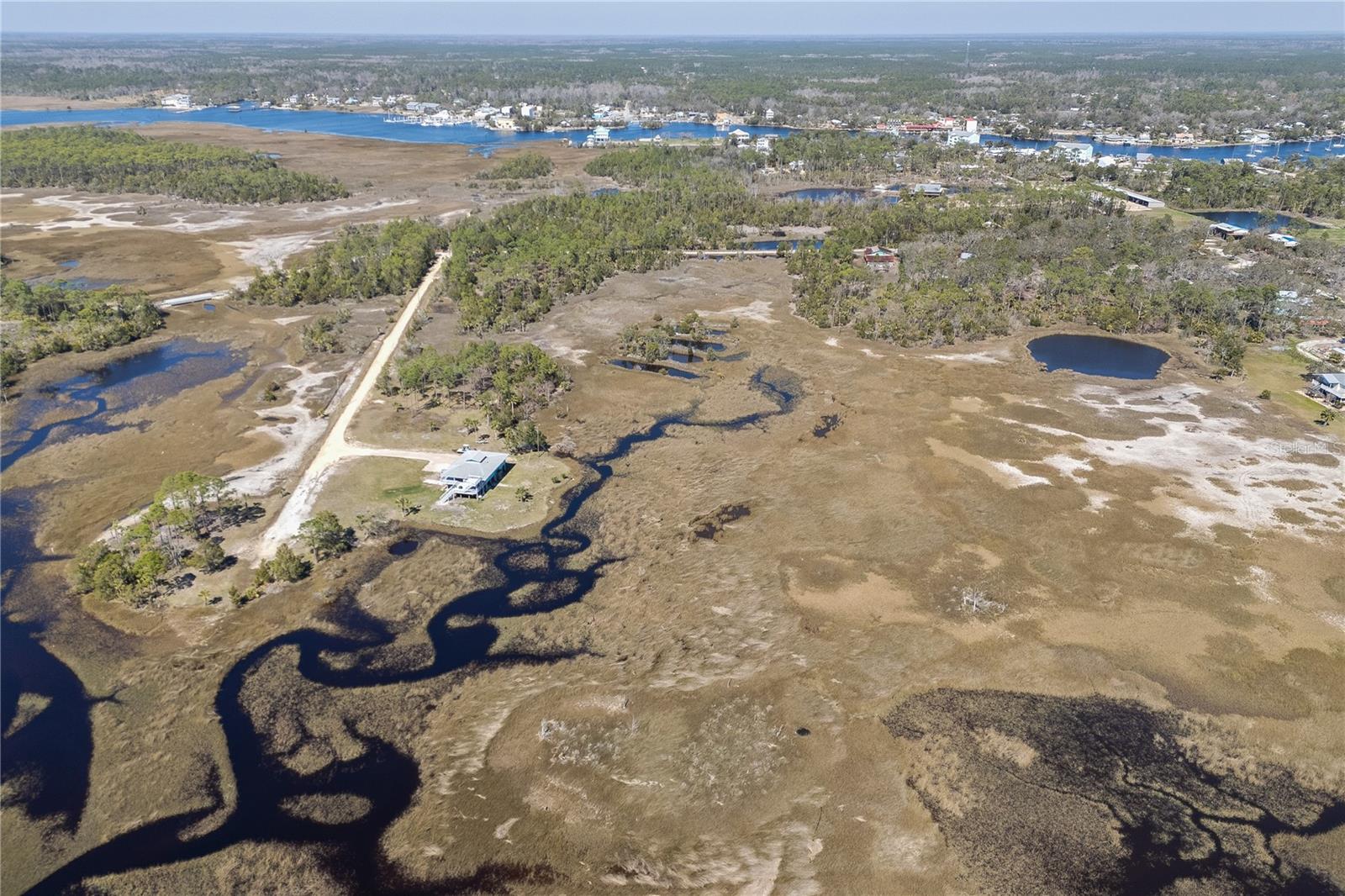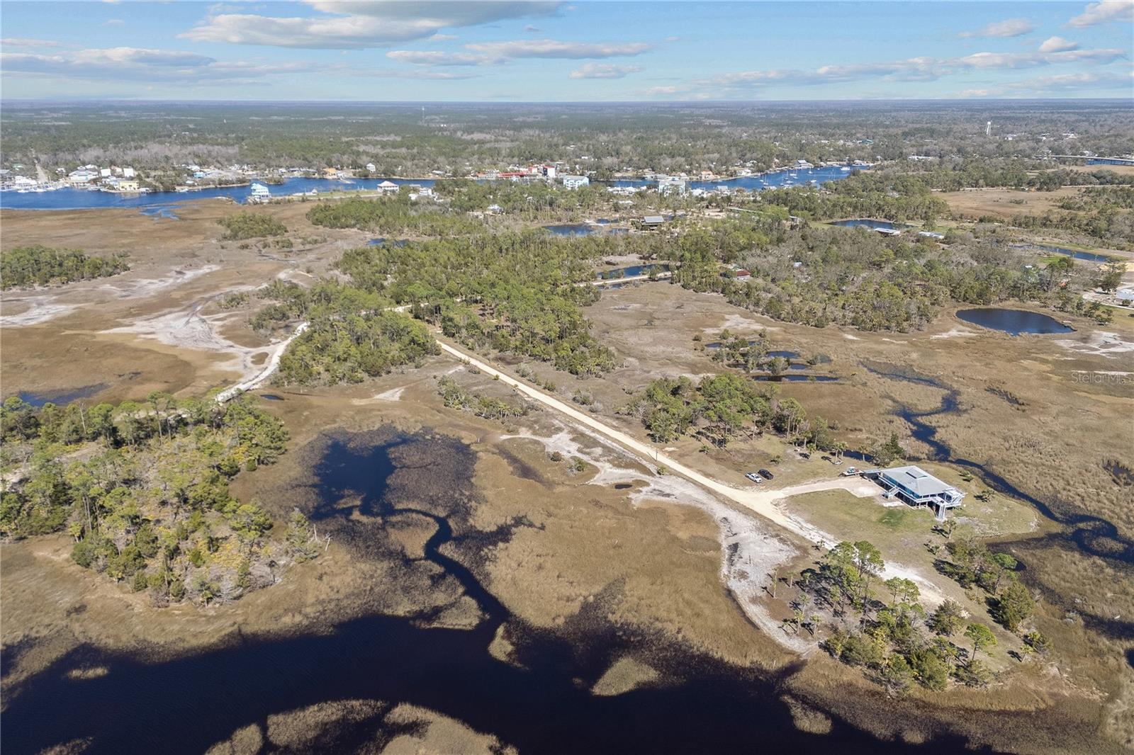 Experience paradise at the end of your private lane, where every vista showcases the beauty of the Gulf of Mexico, saltwater channels, and awe-inspiring sunsets. Nestled on 25.5 +/- acres in the thriving community of Steinhatchee, this 4-bedroom, 2-bathroom haven is a rare gem. Immerse yourself in nature as you relax on one of the decks, fish from your backyard, and marvel at the abundance of wildlife and birds. Recently refreshed with exterior painting, this home has weathered every storm with resilience, standing as a testament to its durability and strength. This home harmoniously blends with its natural surroundings, welcoming you with a charming open floor plan. The kitchen boasts custom-designed copper range hood and handcrafted cedar countertops, adding an artistic touch to the space. Glass French doors off the dining room lead to expansive three sided decks, offering breathtaking views and providing an ideal setting for entertaining friends and family. Below, ample space awaits to park your boat, toys, or create an outdoor kitchen area, offering endless possibilities for enjoyment. With state-owned land to the West and South, as well as a significant portion of the East, rest assured of unparalleled privacy and seclusion. Additionally, the property is divided into 3 separate parcels, opening avenues for future family homes or other ventures. Steinhatchee boasts top-notch amenities, including the state-of-the-art Deadman's Bay marina and the renowned Sea Hag Marina, accompanied by a variety of restaurants and shops. Known for its scalloping season and year-round fishing, this locale caters to outdoor enthusiasts. Conveniently located just an hour and a half from Gainesville, 49 minutes to Chiefland, and minutes from Florida's premier rivers and springs, this waterfront sanctuary offers the perfect blend of tranquility and accessibility. Don't miss this unparalleled opportunity to live in harmony with nature in one of Florida's most sought-after destinations.