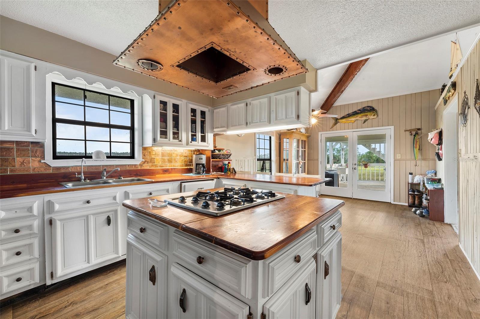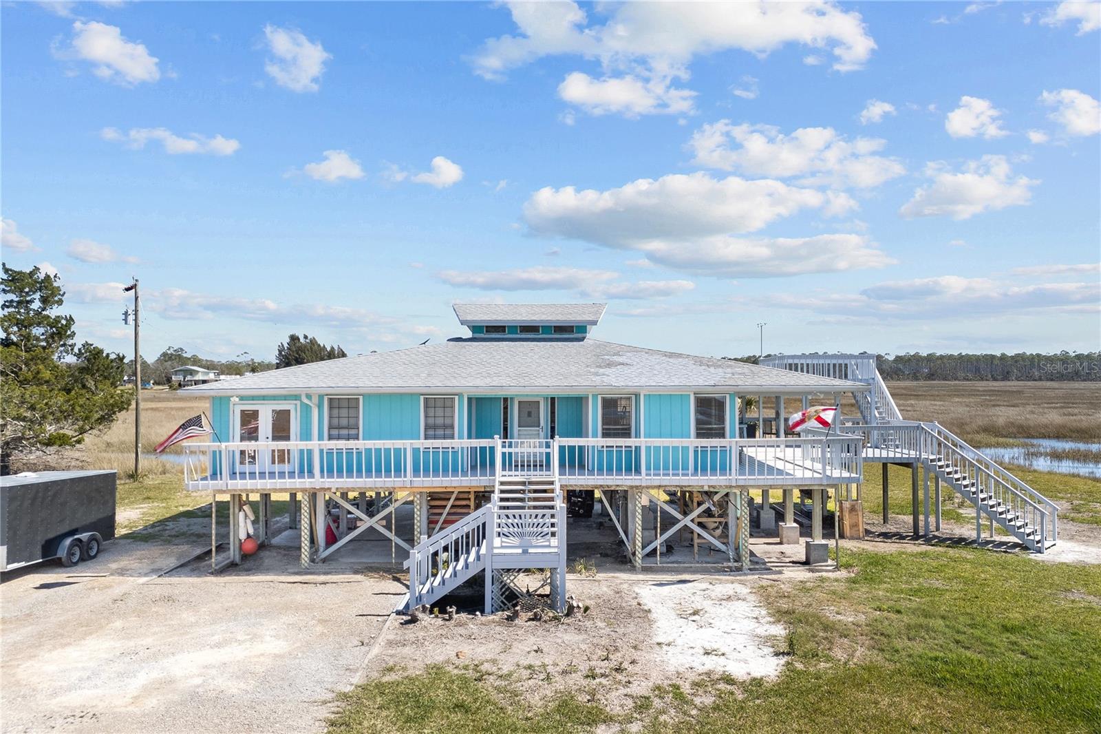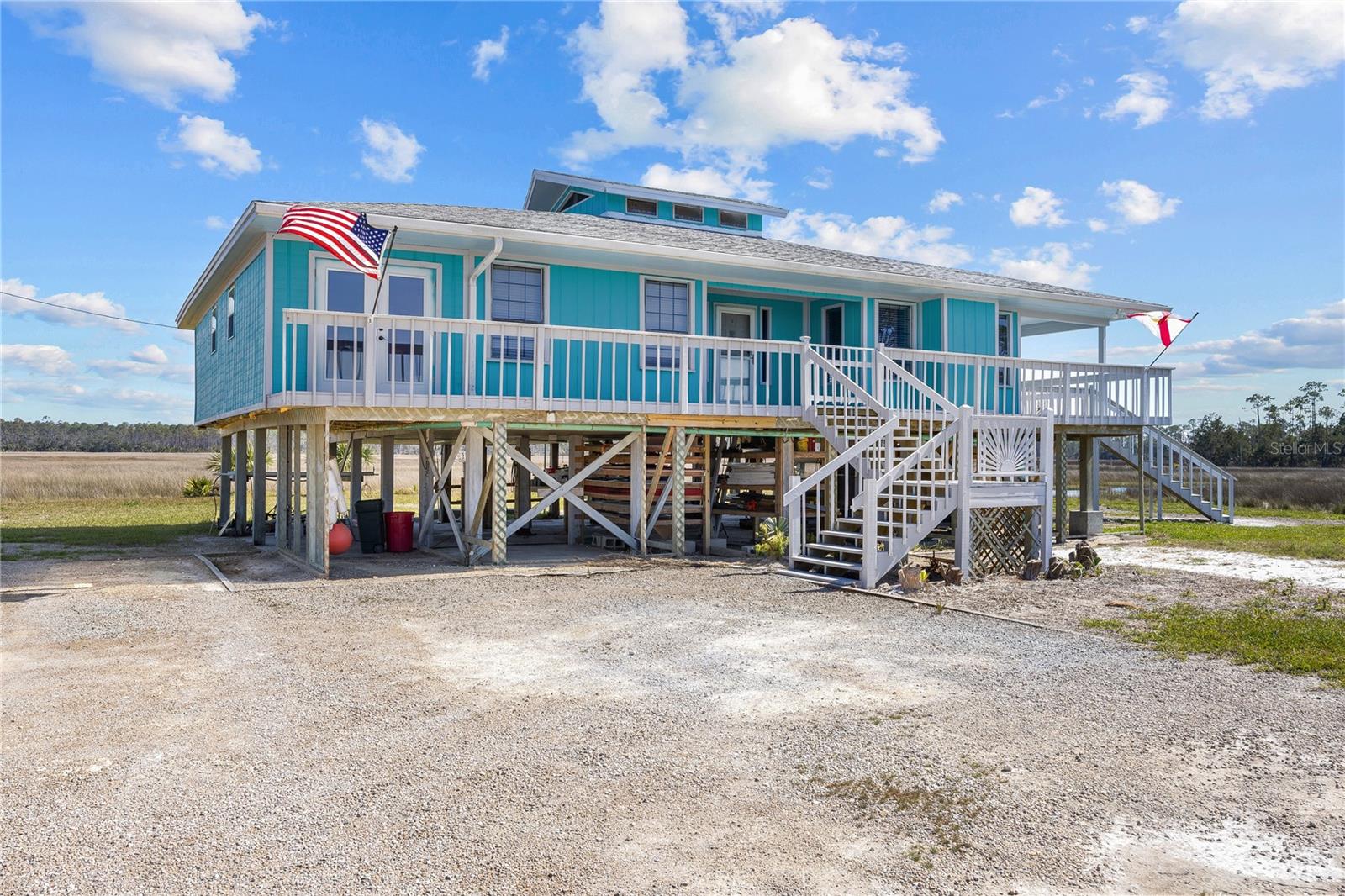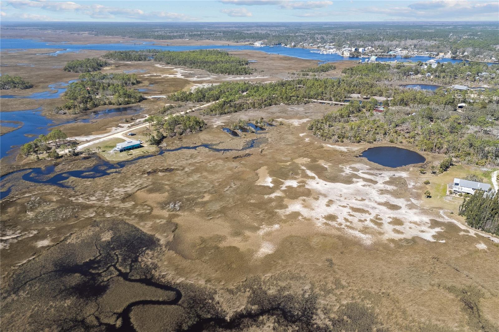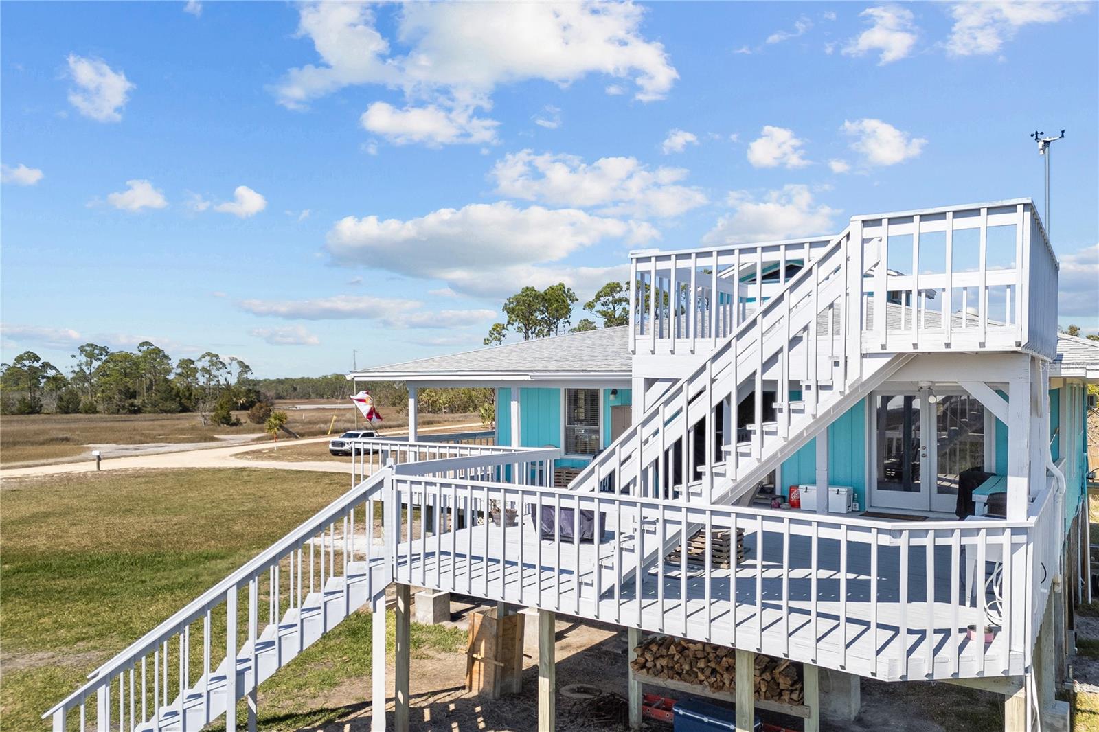 Experience paradise at the end of your private lane, where every vista showcases the beauty of the Gulf of Mexico, saltwater channels, and awe-inspiring sunsets. Nestled on 25.5 +/- acres in the thriving community of Steinhatchee, this 4-bedroom, 2-bathroom haven is a rare gem. Immerse yourself in nature as you relax on one of the decks, fish from your backyard, and marvel at the abundance of wildlife and birds. Recently refreshed with exterior painting, this home has weathered every storm with resilience, standing as a testament to its durability and strength. This home harmoniously blends with its natural surroundings, welcoming you with a charming open floor plan. The kitchen boasts custom-designed copper range hood and handcrafted cedar countertops, adding an artistic touch to the space. Glass French doors off the dining room lead to expansive three sided decks, offering breathtaking views and providing an ideal setting for entertaining friends and family. Below, ample space awaits to park your boat, toys, or create an outdoor kitchen area, offering endless possibilities for enjoyment. With state-owned land to the West and South, as well as a significant portion of the East, rest assured of unparalleled privacy and seclusion. Additionally, the property is divided into 3 separate parcels, opening avenues for future family homes or other ventures. Steinhatchee boasts top-notch amenities, including the state-of-the-art Deadman's Bay marina and the renowned Sea Hag Marina, accompanied by a variety of restaurants and shops. Known for its scalloping season and year-round fishing, this locale caters to outdoor enthusiasts. Conveniently located just an hour and a half from Gainesville, 49 minutes to Chiefland, and minutes from Florida's premier rivers and springs, this waterfront sanctuary offers the perfect blend of tranquility and accessibility. Don't miss this unparalleled opportunity to live in harmony with nature in one of Florida's most sought-after destinations.
