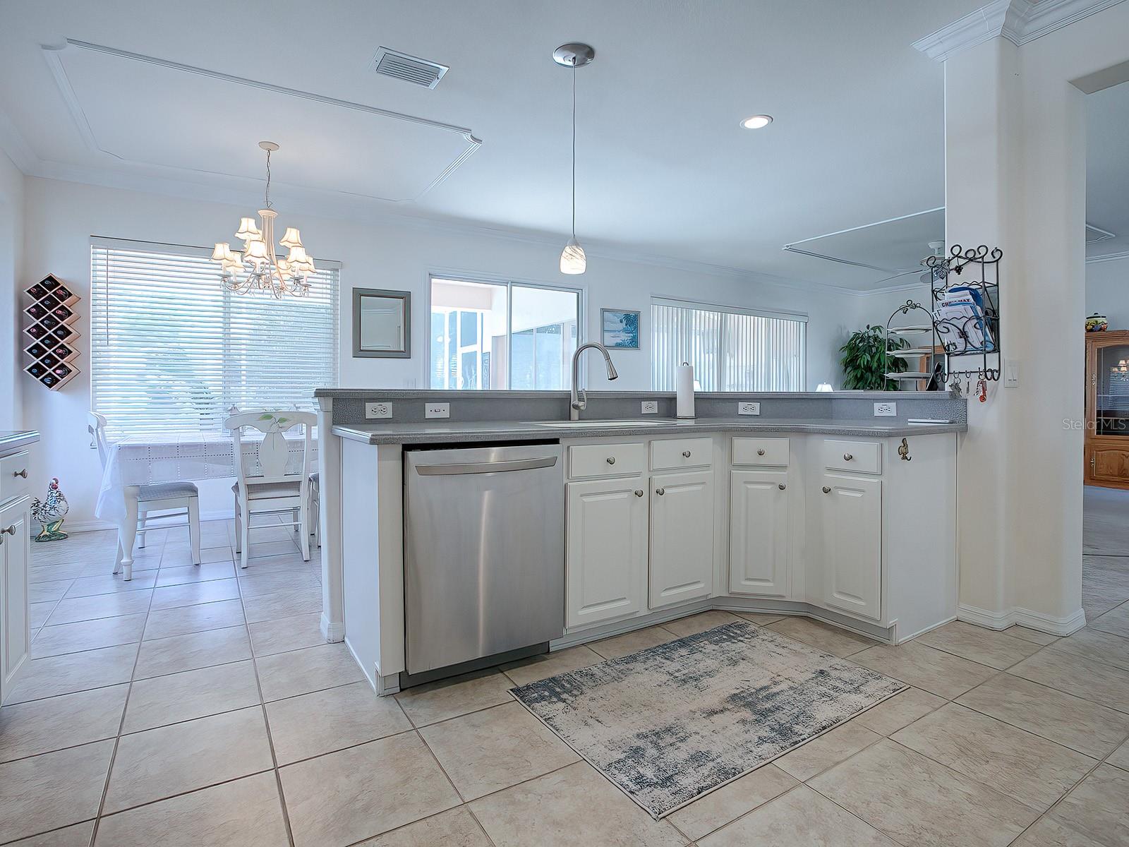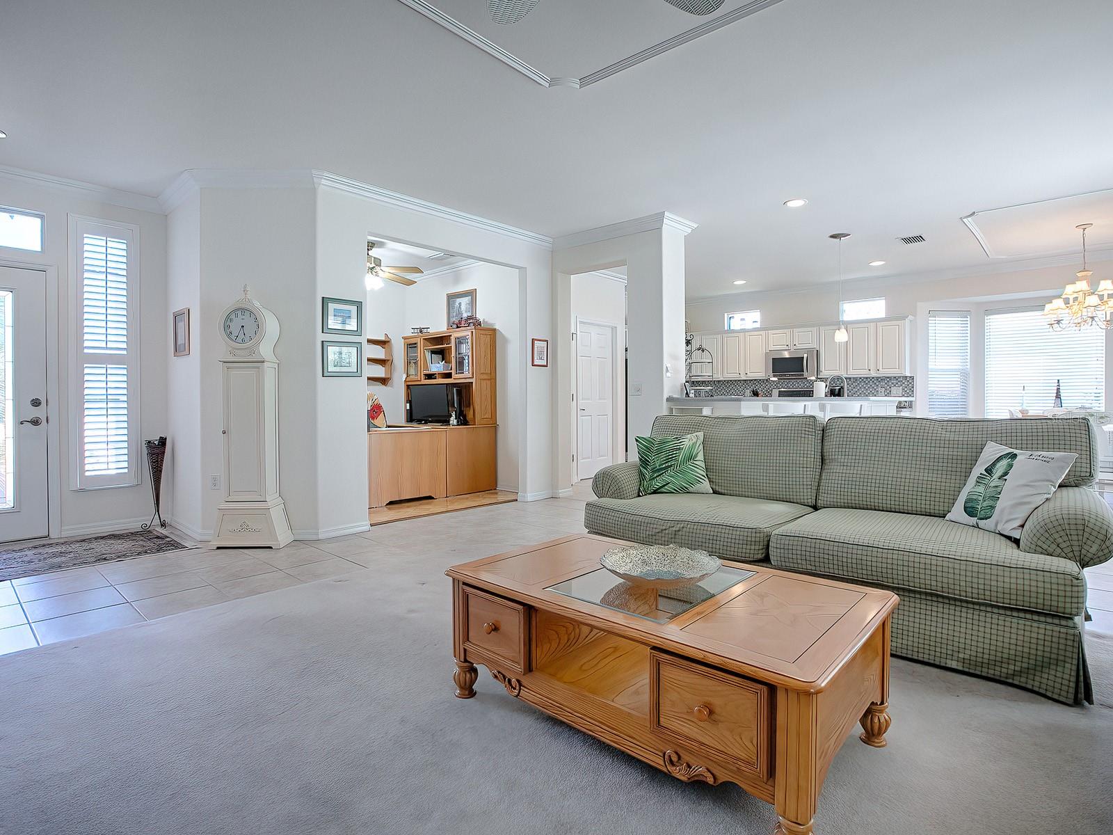 This open floor plan Madeira home boasts a stunning design that you won't want to miss. As you approach, you'll be greeted by a charming courtyard leading to a leaded glass door. Upon entry, you'll immediately notice the fine features throughout the home, including 2 bedrooms, 2 bathrooms, and an office/study.The kitchen is a highlight, featuring elegant white cabinets and stainless steel appliances. It overlooks the spacious great room, creating a perfect space for entertaining or relaxing. Tile flooring predominates, with plush carpeting in the bedrooms and part of the great room. Crown molding adds a touch of sophistication throughout the residence.The master bedroom is generously sized at 13 x 15 feet and includes a large walk-in closet, offering ample storage space. The guest bathroom is equipped with a highly sought-after therapeutic tub, complete with jets for a relaxing soak, as well as a shower.Convenience is key with an inside laundry room that opens to an extended garage, providing additional storage or workspace. Outside, the large lanai offers both privacy and versatility, with one half enclosed and the other open to a birdcage.For those interested, furniture is available separately, allowing you to easily furnish this beautiful home to your taste and style. Don't miss the opportunity to see this exceptional Madeira home with its inviting layout and desirable features.