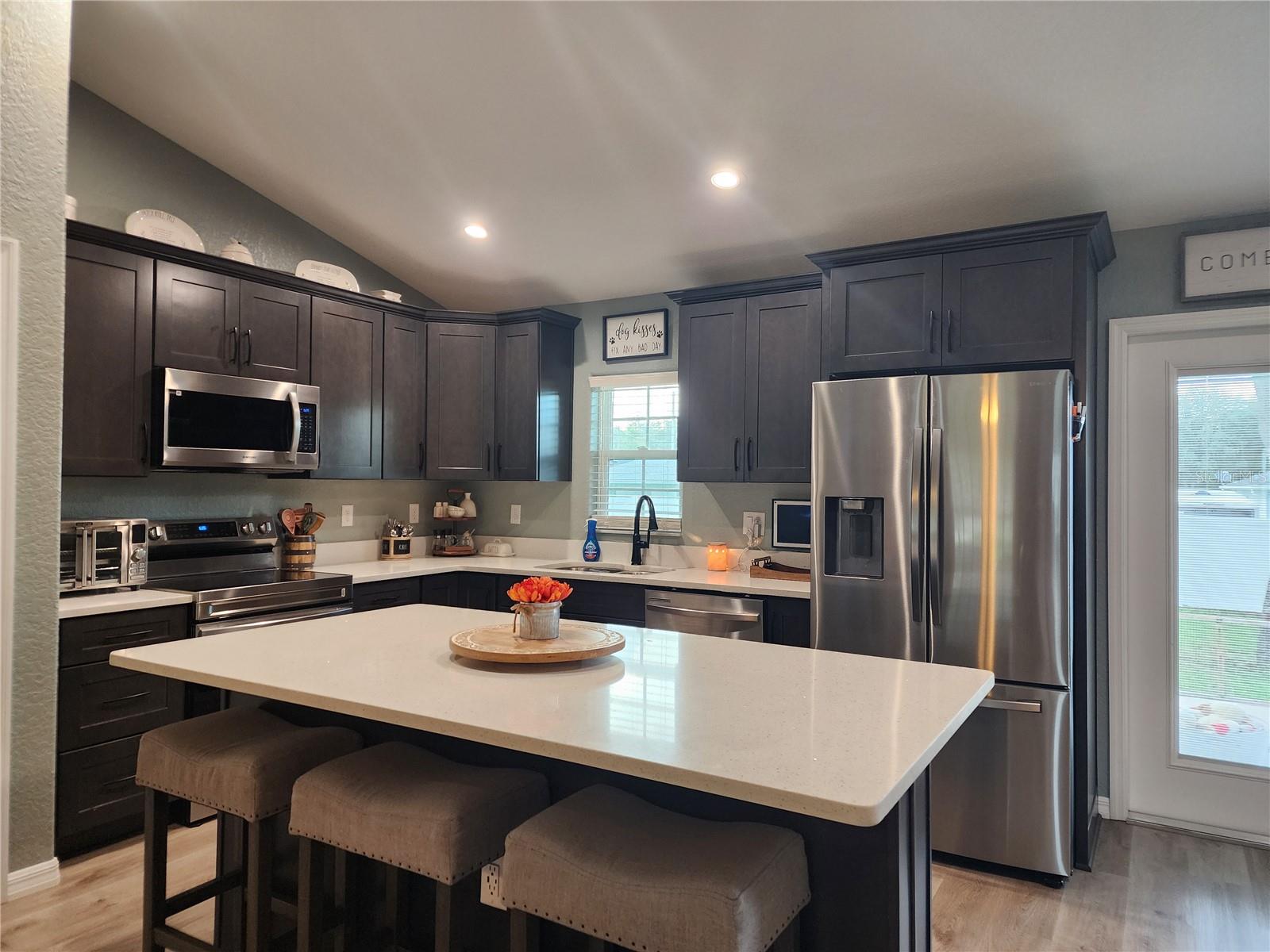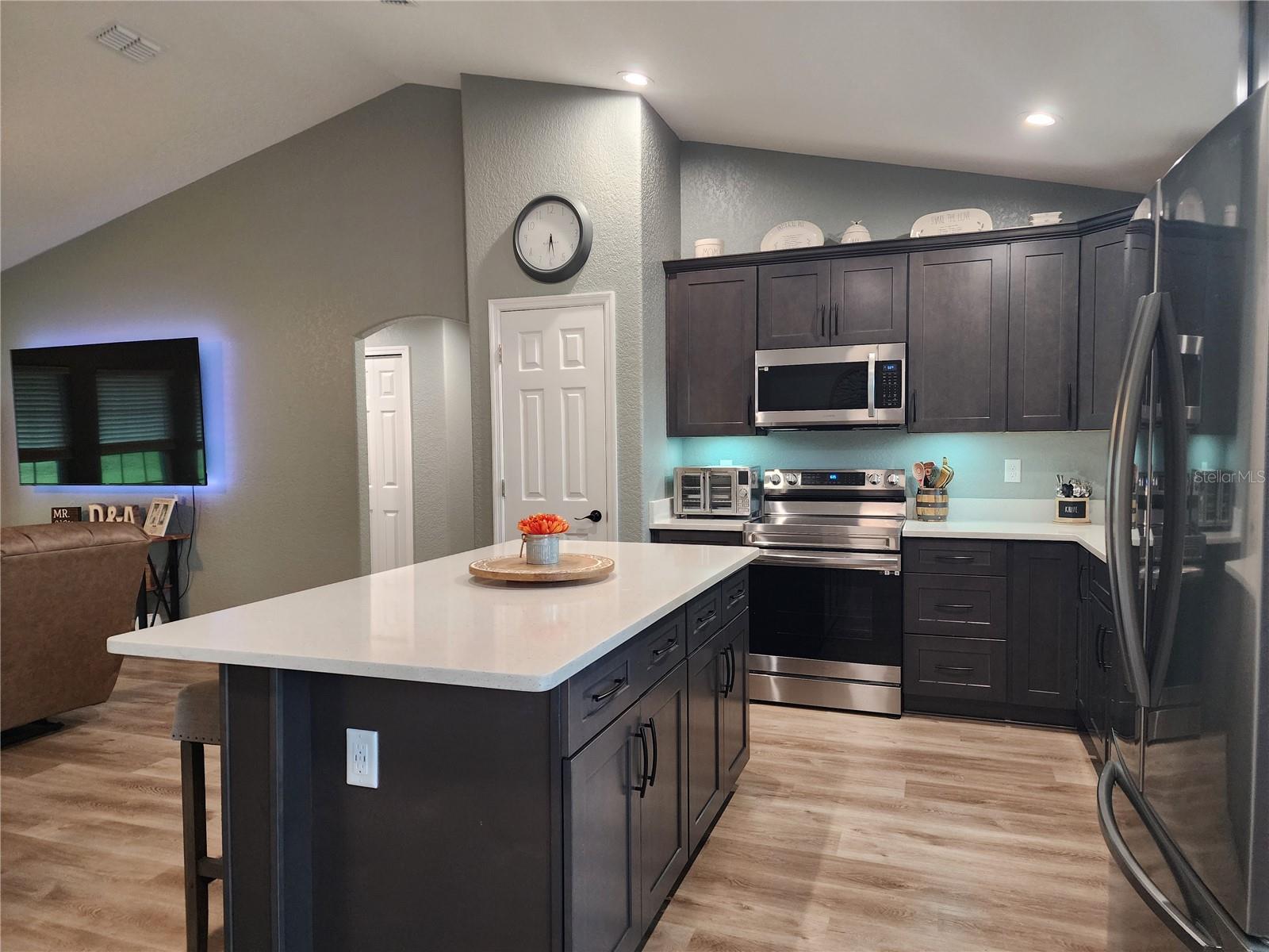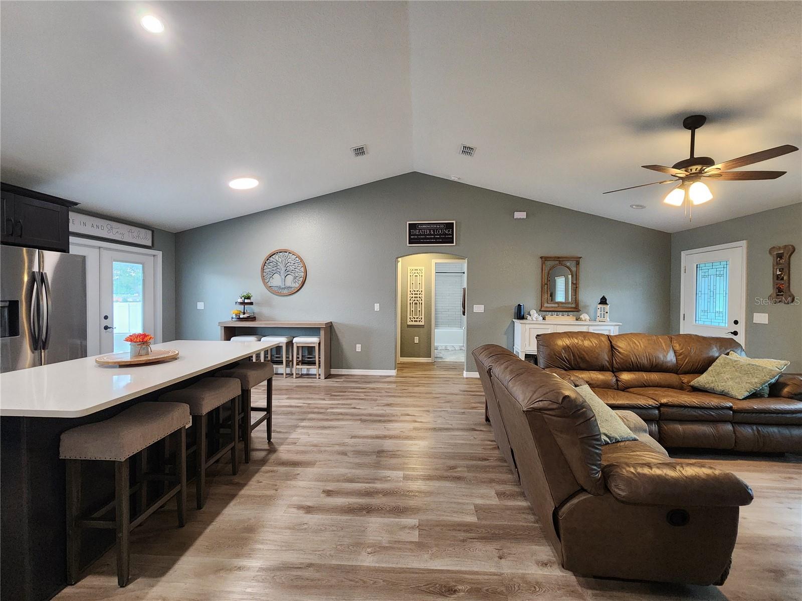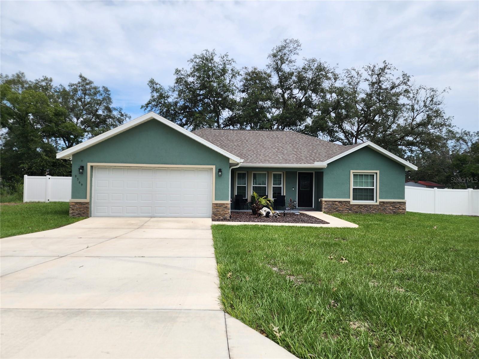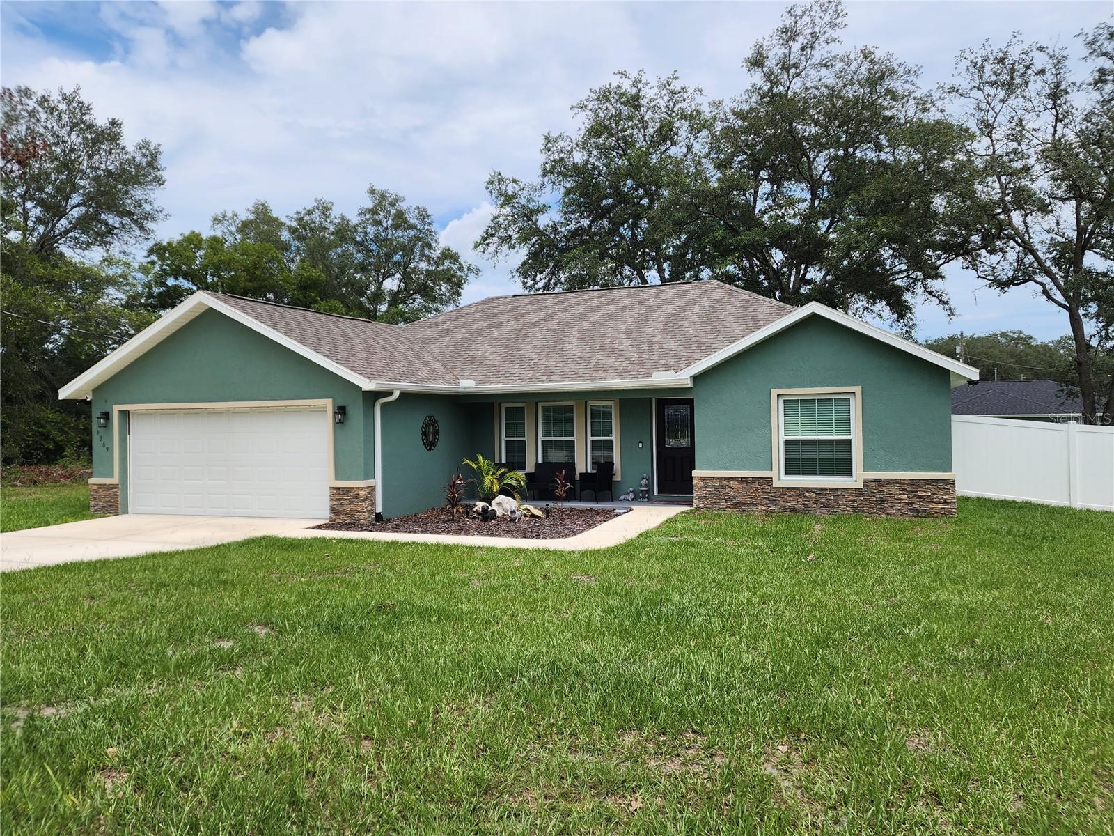 Step into this stunning 3-bedroom, 2-bathroom home in the sought-after Orange Blossom Hills community, just minutes from The Villages, Ocala, and Belleview. As you enter, you're welcomed by a spacious great room with soaring vaulted ceilings, flowing seamlessly into the dining area and kitchen, all beautifully accented by luxury vinyl plank flooring throughout for a cohesive and low-maintenance finish. The kitchen is truly the heart of the home, featuring sleek stainless steel appliances, wood cabinetry with soft-close hardware, crown molding, lazy- susan, and a pantry closet for extra storage. The beautiful quartz countertops and open kitchen with island provide ample space for meal prep, entertaining, or simply enjoying a morning coffee. With this split bedroom layout, you’ll find the inviting bedrooms, each offering plush carpeting, ceiling fans, built-in closets and natural lighting. The primary suite is a true retreat with its own; walk-in closet and bathroom with a fabulous pebble tiled floor in the shower, and linen closet. The guest bathroom is equally impressive, boasting a relaxing tub/shower combo. Step outside to discover a beautiful, large vinyl-fenced yard, offering privacy and a safe space for the family to enjoy. The outdoor space is highlighted by a front covered porch, and rear porch. Florida days or hosting summer gatherings, perfect for unwinding after a long day. Convenience is at your fingertips with an inside laundry room, while the attached 2-car garage provides plenty of room for parking and storage, epoxy finished floor, pull-down attic stairs and a garage service door. With a total of 1,955 sq. ft. under roof and 1,440 sq. ft. under air, this home offers both space and style in a prime location. Make this beautiful home your own!