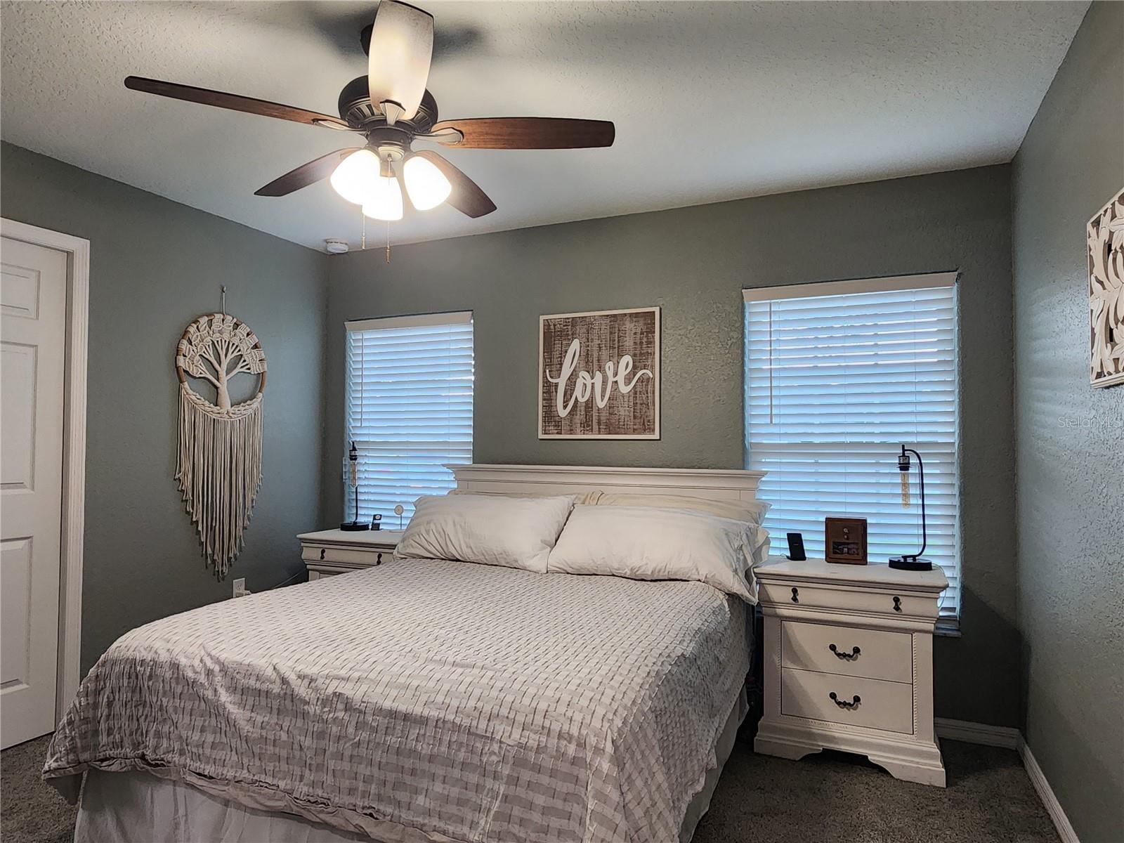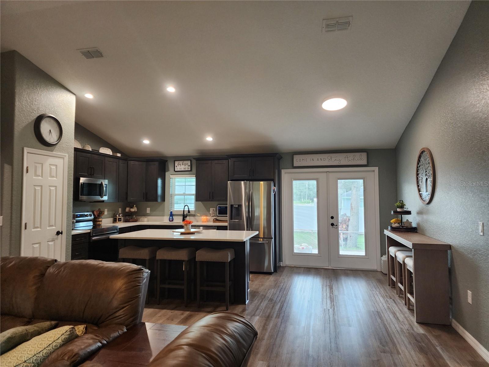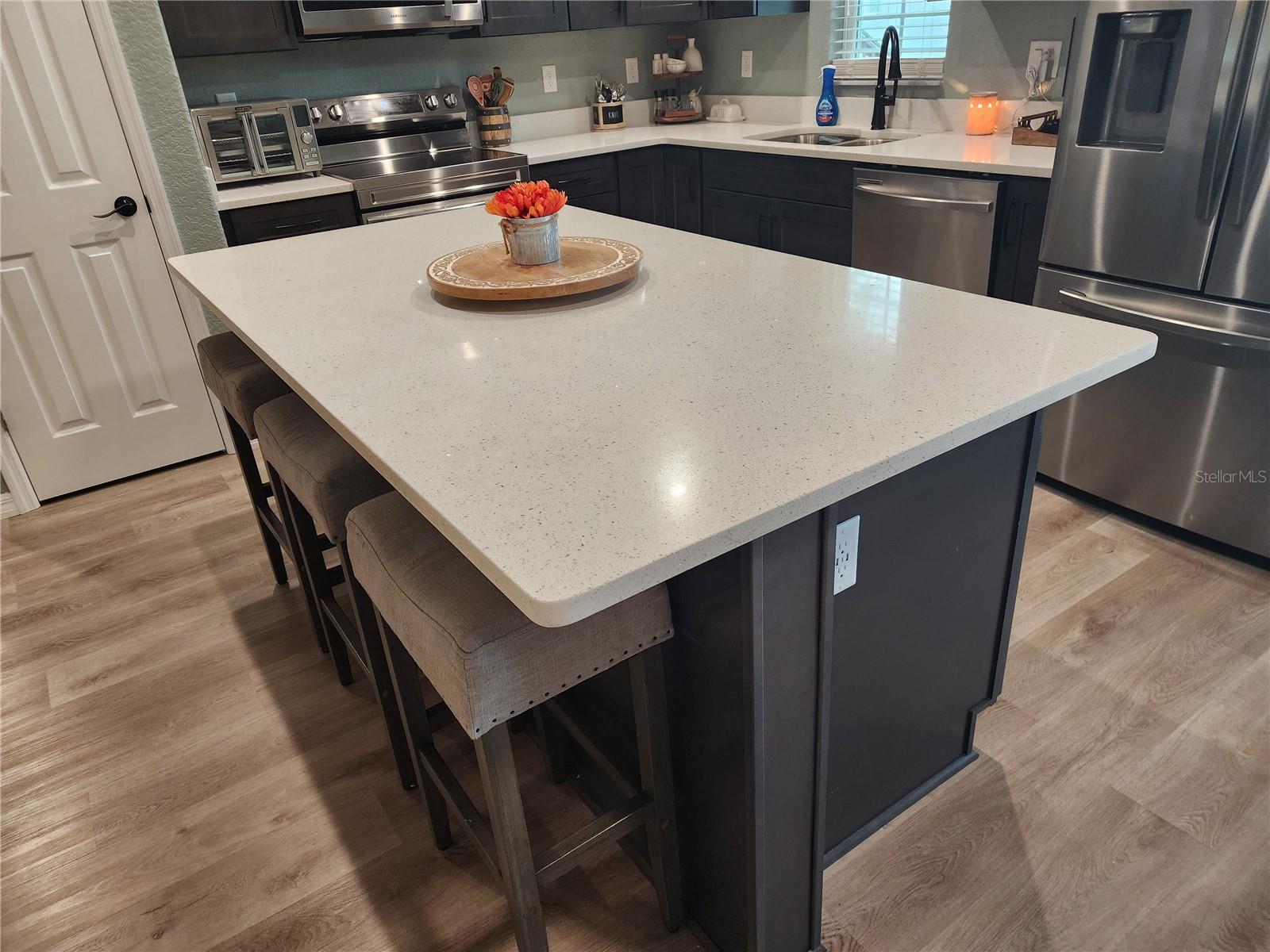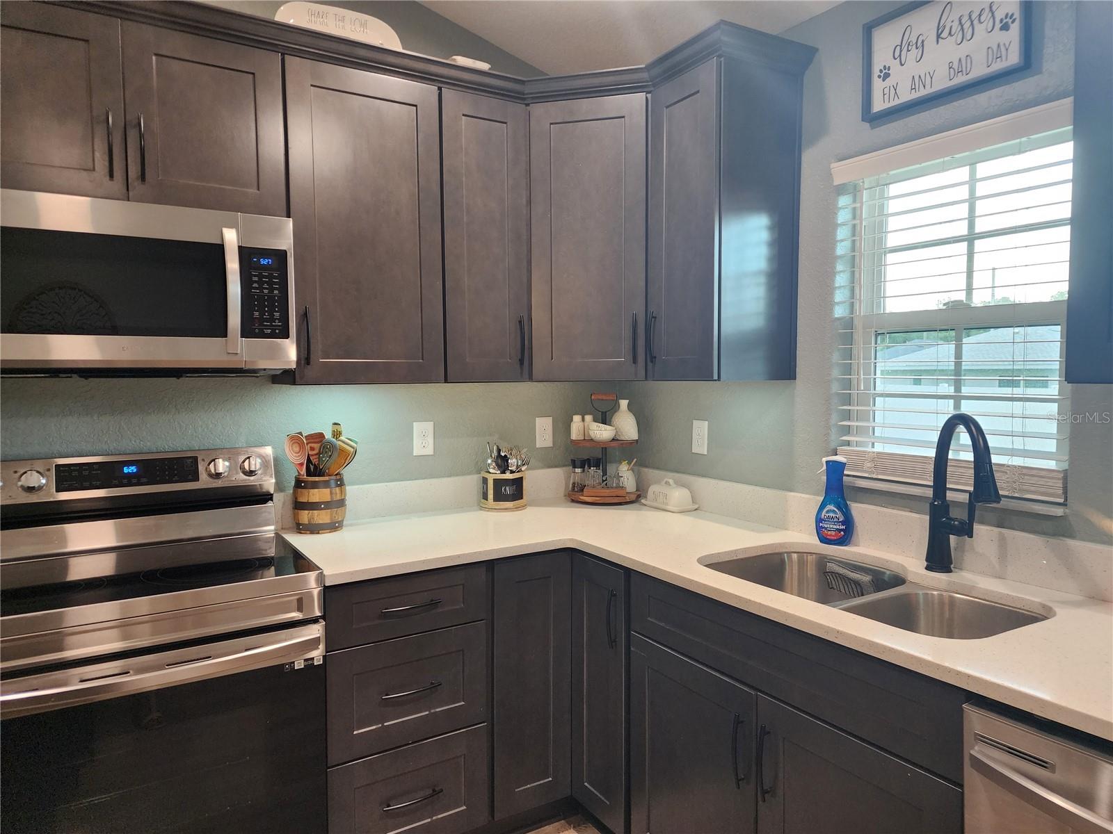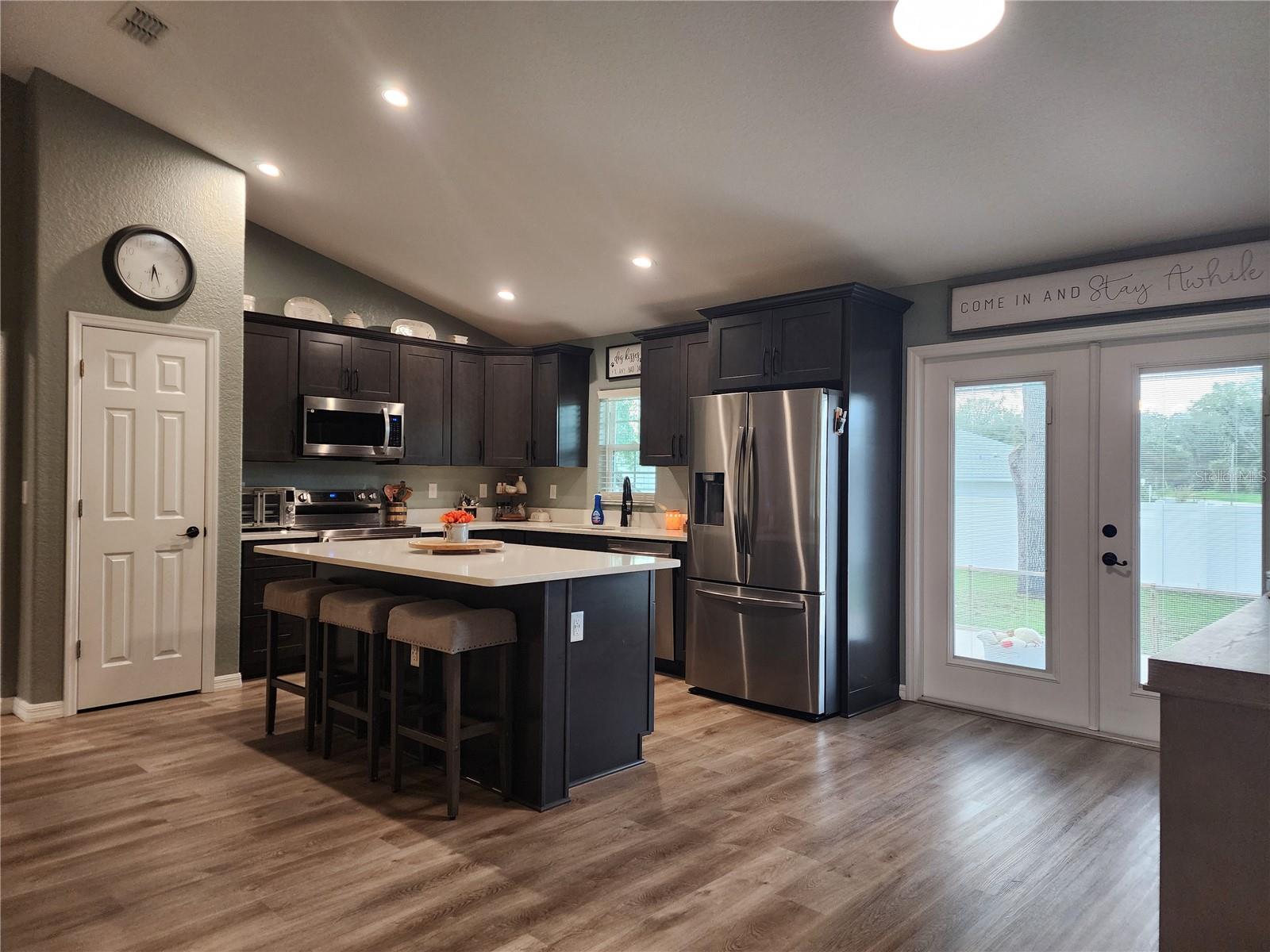Step into this stunning 3-bedroom, 2-bathroom home in the sought-after Orange Blossom Hills community, just minutes from The Villages, Ocala, and Belleview. As you enter, you're welcomed by a spacious great room with soaring vaulted ceilings, flowing seamlessly into the dining area and kitchen, all beautifully accented by luxury vinyl plank flooring throughout for a cohesive and low-maintenance finish. The kitchen is truly the heart of the home, featuring sleek stainless steel appliances, wood cabinetry with soft-close hardware, crown molding, lazy- susan, and a pantry closet for extra storage. The beautiful quartz countertops and open kitchen with island provide ample space for meal prep, entertaining, or simply enjoying a morning coffee. With this split bedroom layout, you’ll find the inviting bedrooms, each offering plush carpeting, ceiling fans, built-in closets and natural lighting. The primary suite is a true retreat with its own; walk-in closet and bathroom with a fabulous pebble tiled floor in the shower, and linen closet. The guest bathroom is equally impressive, boasting a relaxing tub/shower combo. Step outside to discover a beautiful, large vinyl-fenced yard, offering privacy and a safe space for the family to enjoy. The outdoor space is highlighted by a front covered porch, and rear porch. Florida days or hosting summer gatherings, perfect for unwinding after a long day. Convenience is at your fingertips with an inside laundry room, while the attached 2-car garage provides plenty of room for parking and storage, epoxy finished floor, pull-down attic stairs and a garage service door. With a total of 1,955 sq. ft. under roof and 1,440 sq. ft. under air, this home offers both space and style in a prime location. Make this beautiful home your own!