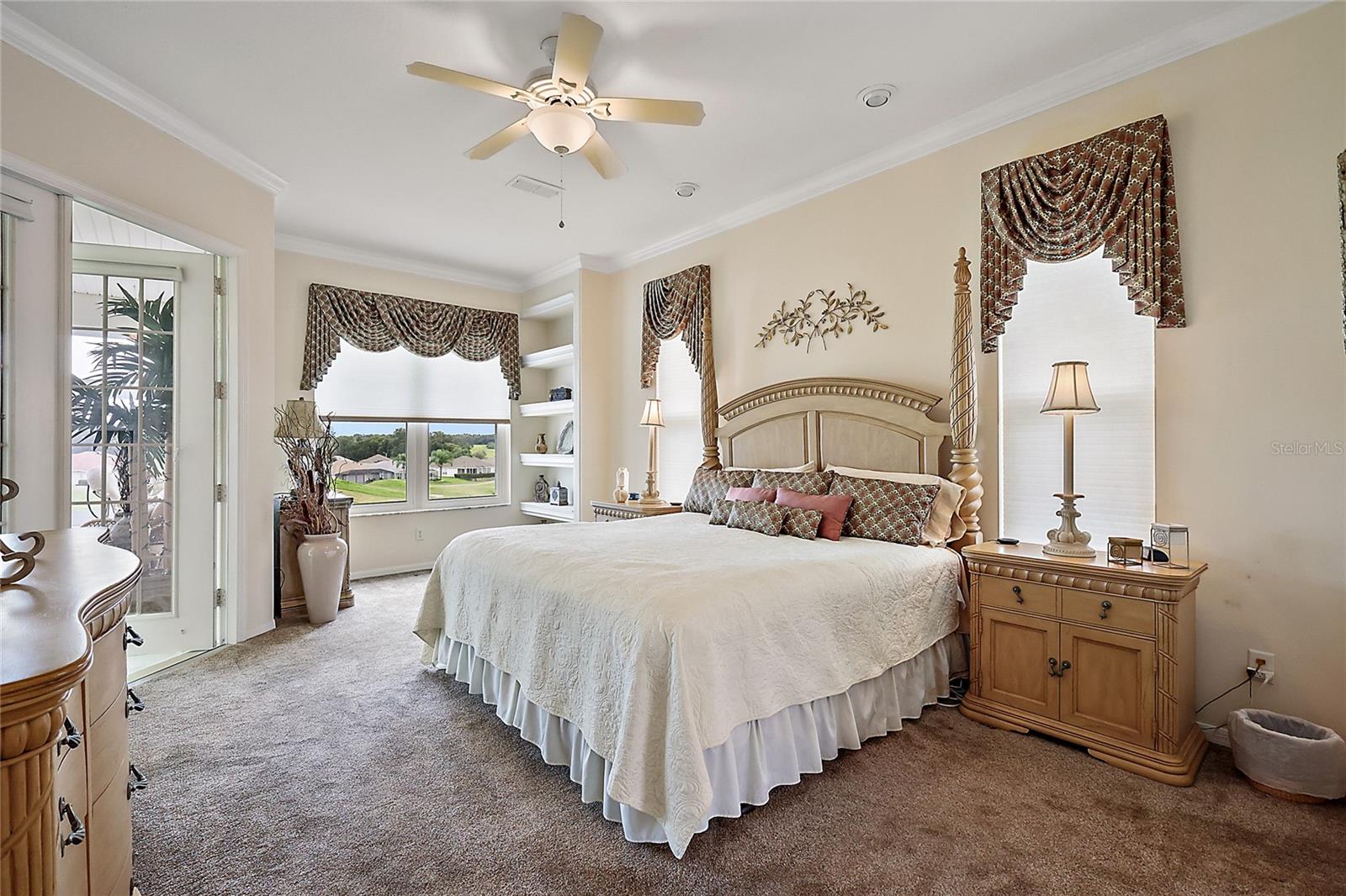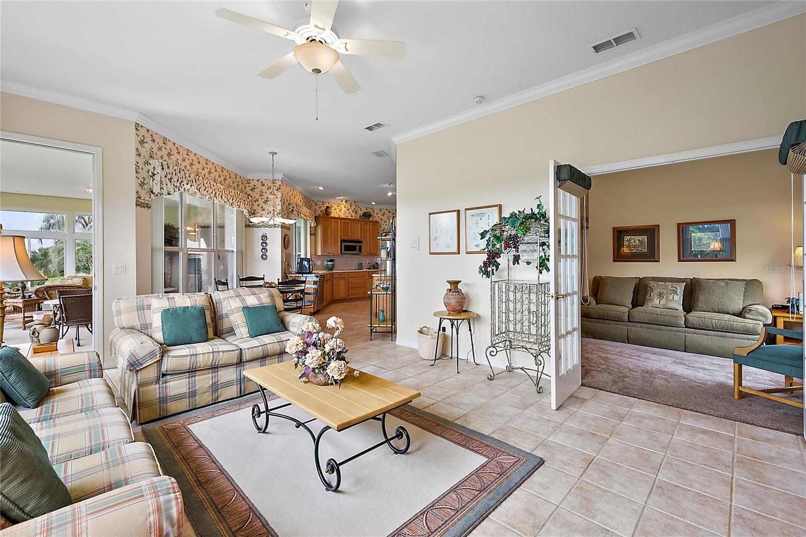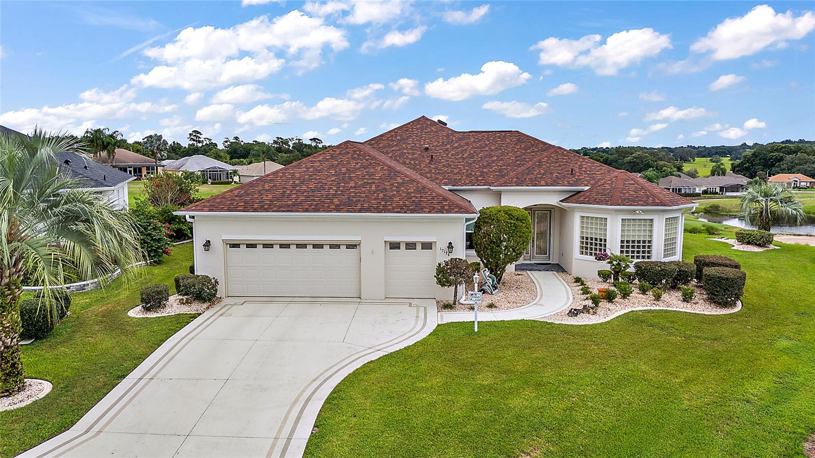 STONECREST is a 55+ Golf Course Community With All The Amenities, and just a Bridge Away By Golf Cart To The Villages! ROOF 2020, Windows 2021 (house and lanai), HVAC 2023, Outside Painted 2024. Stunning GOLF FRONT 2/2 + Den Concrete Block and Stucco San Marco with a 2 Car + Golf Cart Garage on a Cul-de-Sac Lot, property sits high and dry on a hill with a Spectacular Panoramic View of the Golf Course. This well appointed home offers, a Retractable Front Door screen, Soaring 12ft Ceiling graduating to 10ft Ceilings, Crown molding throughout, Upgraded Light Fixtures throughout home and an Enclosed Lanai under Heat and Air. Open Concept floor plan with the Dining Room featuring a Stunning Double Tray Ceiling! The Large Eat in Kitchen boasts Stainless Steele appliances, Built in Oven, Corian Countertops, Center Island, 42" Wood Cabinets, Pantry closet, Utility closet, Generous Breakfast Bar, and French door access to the Enclosed Lanai! The lanai makes a fabulous space for entertaining your family and friends! Relax on the enclosed Lanai and take in the intoxicating Sunset View of the Golf Course, a truly wonderful addition to the overall living space of the home! The Split Floor Plan offers maximum Privacy for both the Owners and their Guest, with the Primary suite commanding one side of the home while the guest bedrooms and guest bathroom are located on the opposite side of the home. The Luxurious Primary suite offers a spectacular Golf Course View, a Private French door access to the Lanai, a Walk in Closet, and an En Suite bathroom. The En Suite bathroom features Two Vanities, Large Soaking Tub and Tiled Walk in Shower. Enjoy Your Own Private Oasis with a Fantastic Panoramic Golf Course View and Rear Privacy! . 2 Car + Golf Cart Garage with added insulation! 7x9 Storage room with air, making this the perfect space for storing holiday decor! This home has it all! Stonecrest is a 55+ gated golf course community with all the amenities, pools, pickleball courts, softball, 18 hole championship golf course, Broad Stripes Golf & Social Club and over 80 different clubs to join! Stonecrest is just a bridge away by golf cart to the Villages. It is a community with Private Roads and 24 Hour Security! As a private gated golf course community, you can expect a high level of privacy and security. Overall, this home offers a combination of Tremendous Golf Course Views, luxurious features, a desirable location, and a secure community setting. A WONDERFUL LIFESTYLE AWAITS YOU IN STONECREST!