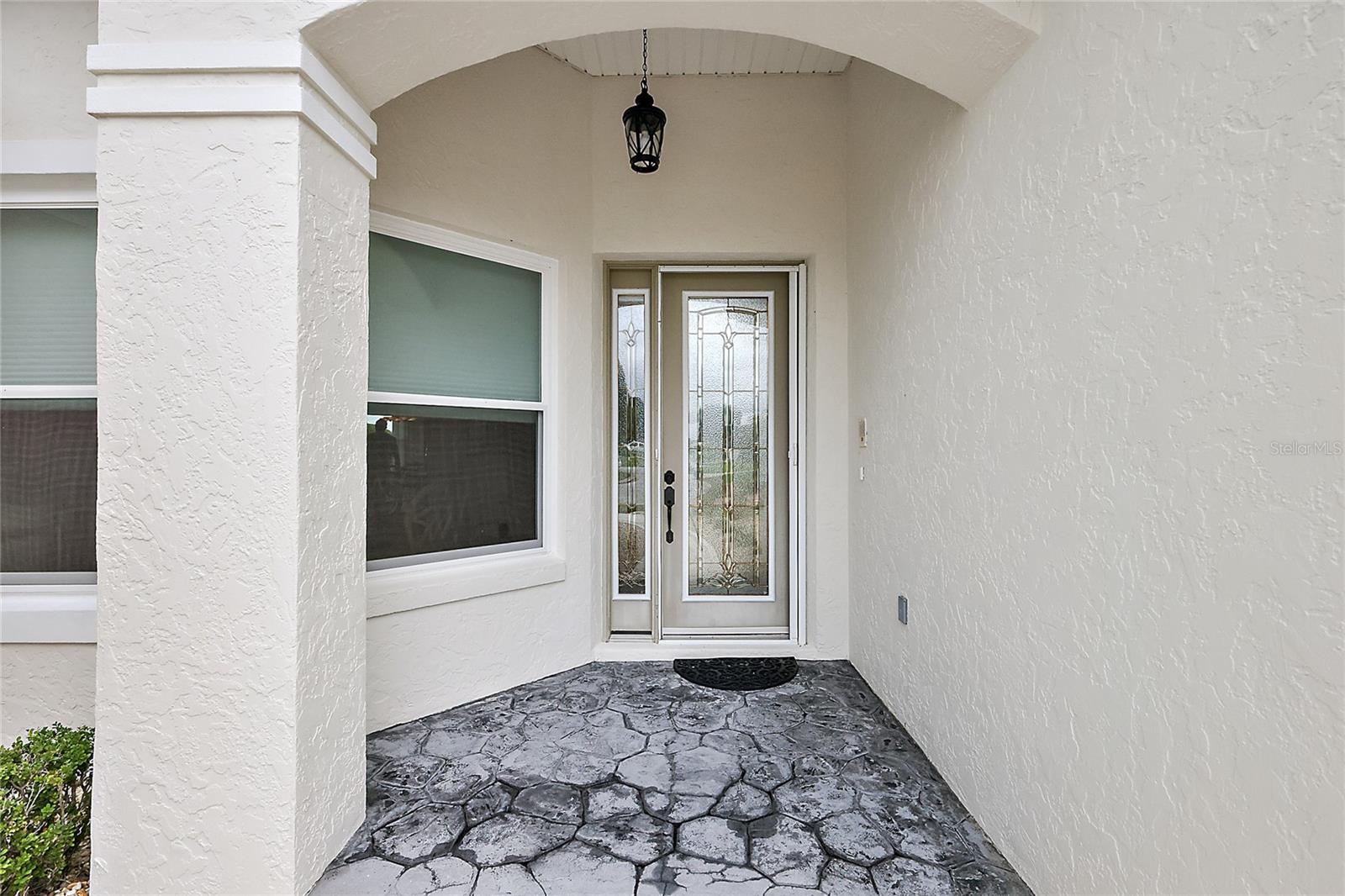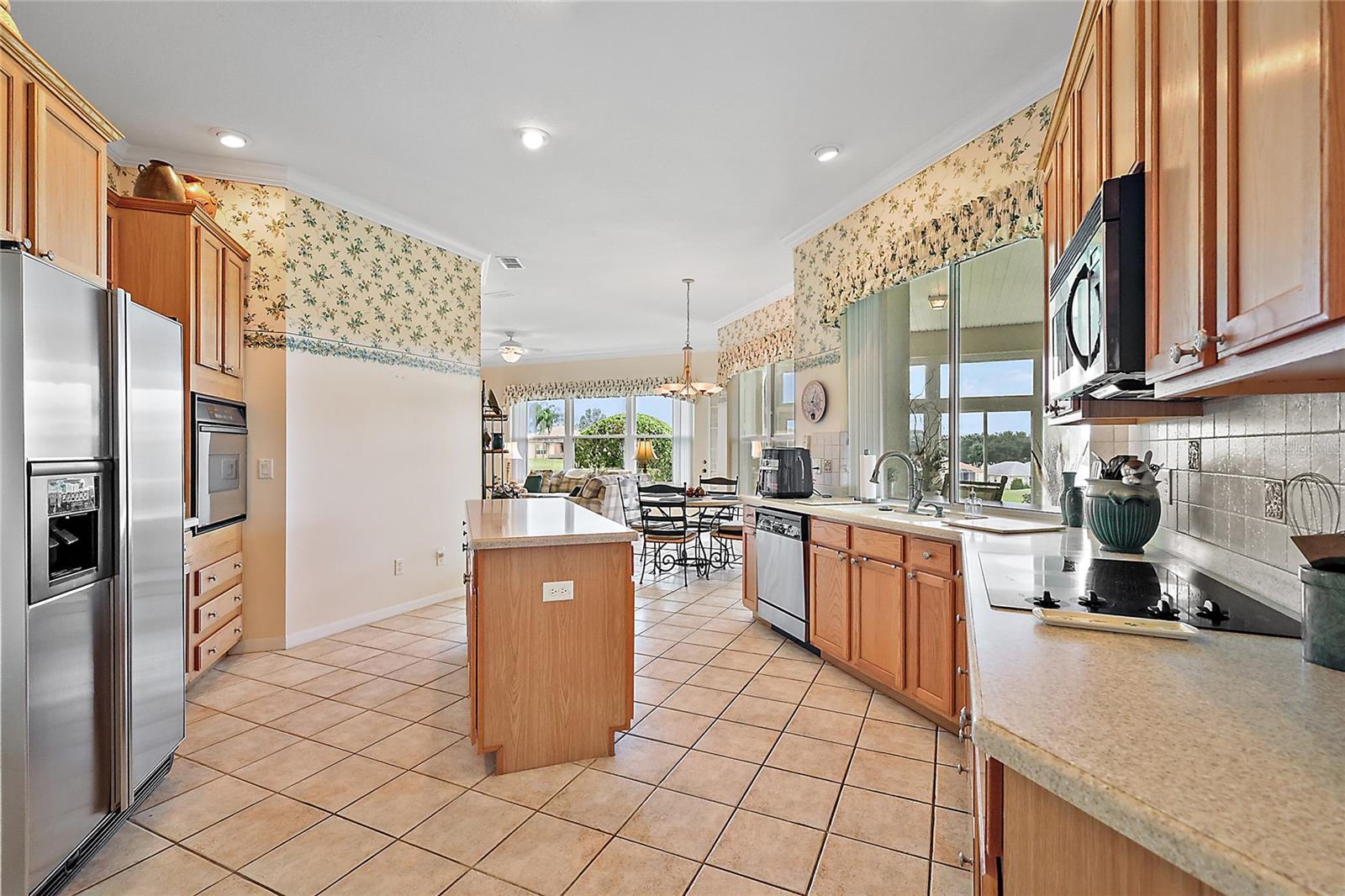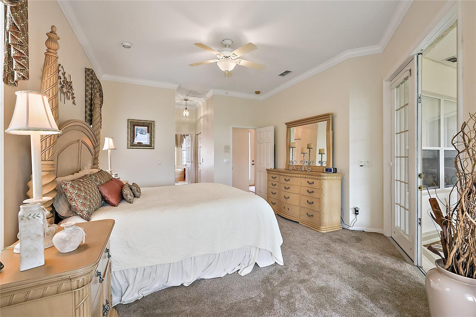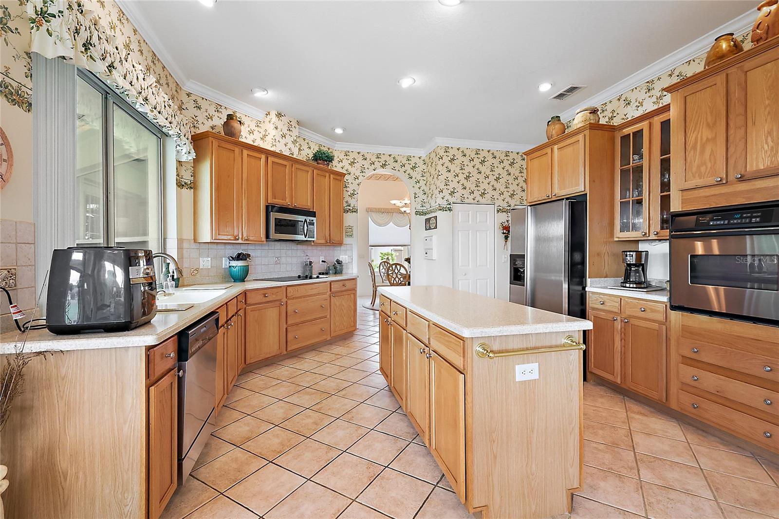 STONECREST is a 55+ Golf Course Community With All The Amenities, and just a Bridge Away By Golf Cart To The Villages! ROOF 2020, Windows 2021 (house and lanai), HVAC 2023, Outside Painted 2024. Stunning GOLF FRONT 2/2 + Den Concrete Block and Stucco San Marco with a 2 Car + Golf Cart Garage on a Cul-de-Sac Lot, property sits high and dry on a hill with a Spectacular Panoramic View of the Golf Course. This well appointed home offers, a Retractable Front Door screen, Soaring 12ft Ceiling graduating to 10ft Ceilings, Crown molding throughout, Upgraded Light Fixtures throughout home and an Enclosed Lanai under Heat and Air. Open Concept floor plan with the Dining Room featuring a Stunning Double Tray Ceiling! The Large Eat in Kitchen boasts Stainless Steele appliances, Built in Oven, Corian Countertops, Center Island, 42" Wood Cabinets, Pantry closet, Utility closet, Generous Breakfast Bar, and French door access to the Enclosed Lanai! The lanai makes a fabulous space for entertaining your family and friends! Relax on the enclosed Lanai and take in the intoxicating Sunset View of the Golf Course, a truly wonderful addition to the overall living space of the home! The Split Floor Plan offers maximum Privacy for both the Owners and their Guest, with the Primary suite commanding one side of the home while the guest bedrooms and guest bathroom are located on the opposite side of the home. The Luxurious Primary suite offers a spectacular Golf Course View, a Private French door access to the Lanai, a Walk in Closet, and an En Suite bathroom. The En Suite bathroom features Two Vanities, Large Soaking Tub and Tiled Walk in Shower. Enjoy Your Own Private Oasis with a Fantastic Panoramic Golf Course View and Rear Privacy! . 2 Car + Golf Cart Garage with added insulation! 7x9 Storage room with air, making this the perfect space for storing holiday decor! This home has it all! Stonecrest is a 55+ gated golf course community with all the amenities, pools, pickleball courts, softball, 18 hole championship golf course, Broad Stripes Golf & Social Club and over 80 different clubs to join! Stonecrest is just a bridge away by golf cart to the Villages. It is a community with Private Roads and 24 Hour Security! As a private gated golf course community, you can expect a high level of privacy and security. Overall, this home offers a combination of Tremendous Golf Course Views, luxurious features, a desirable location, and a secure community setting. A WONDERFUL LIFESTYLE AWAITS YOU IN STONECREST!