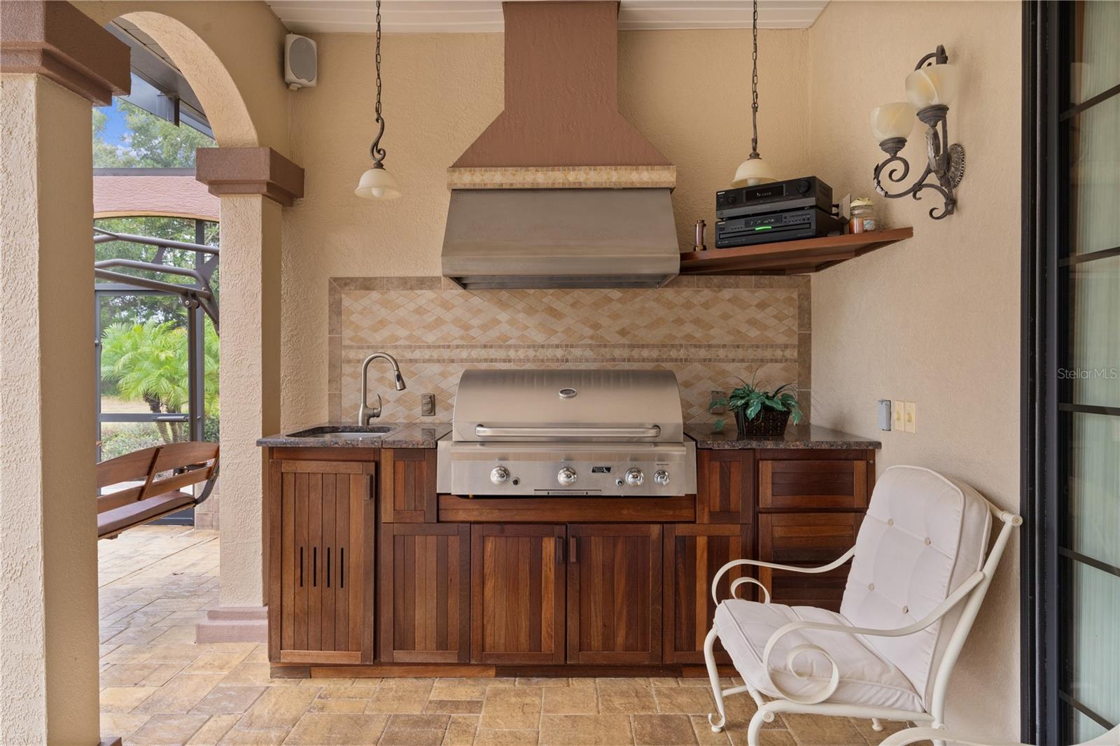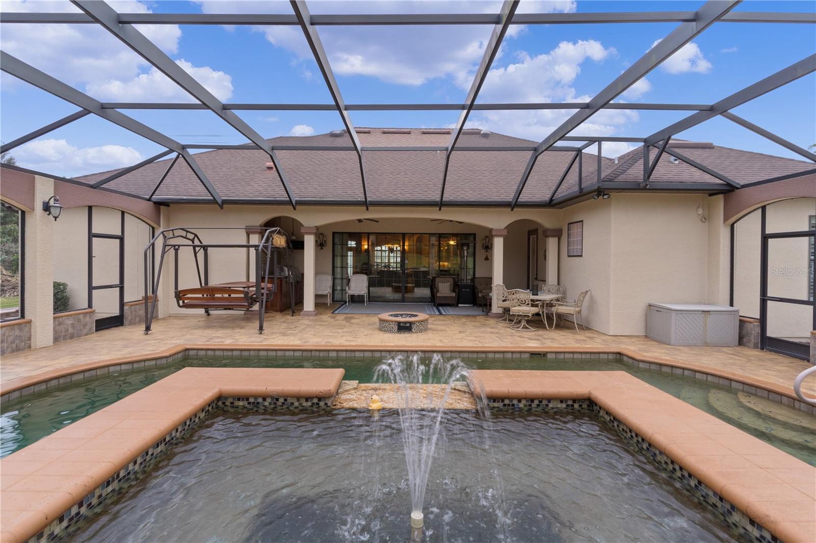 Step into the essence of luxury with this stunning custom-built CHARDONNAY POOL home, located on a serene CUL-DE-SAC in the highly sought-after STONECREST NORTH community. This 3/3 masterpiece offers a one-of-a-kind private resort experience, blending timeless elegance with unparalleled comfort. From the moment you arrive, the meticulously landscaped grounds, adorned with PALM TREES, rocks, and a PAVER DRIVEWAY and WALKWAY, set the stage for what’s to come. The backyard is nothing short of a paradise offering a 30'x15' HEATED SALTWATER POOL with cascading WATERFALLS, an 8-person spa and fire pit, outdoor kitchen, custom lanai w/lush, private landscaping offering a serene escape. Entering the home, you'll step inside through the grand entrance with a LEADED GLASS DOOR to an open-concept design, featuring HIGH CEILINGS, ENGINEERED HARDWOOD floors, and CUSTOM TRAY CEILINGS. The seamless flow of the living areas connects to the outdoor retreat through oversized SLIDING GLASS DOORS, inviting natural light and breathtaking views. The kitchen is a chef's dream, offering a classic feel and elegance, designed for culinary enthusiasts, boasting 2-toned custom 42" cabinetry, w/glass cabinets and under-cabinet lighting, GRANITE COUNTERTOPS, tile backsplash, KitchenAid appliances, PULL-OUT PANTRY and spice racks, a stylish range hood and warming drawer, and a SOLAR TUBE for natural light. Enjoy bar seating around the heart of the kitchen, or take a seat at the dinette area, which overlooks your private pool and gardens. The formal dining room features a double-sided buffet with wine storage, matching the cabinetry and granite of the kitchen, and PLANTATION SHUTTERS for an elevated look. Across the FOYER is a cozy DEN, with a customized coffered ceiling, plantation shutters, and opens into the main living area where the engineered hardwood flooring continues, w/ a TRAY CEILING reaching 12 feet in the height of the LIVING ROOM which is complete with a BUILT IN TV UNIT AND SHELVING, CROWN MOLDING which continues throughout the home, and customized art displays in the hallways. The PRIMARY SUITE offers a tranquil retreat with DOUBLE DOORS, a large walk-in closet, and spa-inspired en-suite bath, featuring a ROMAN SHOWER with multiple heads, GRANITE COUNTERS, and a GARDEN TUB. The guest suite includes 2 spacious rooms with 10-ft ceilings, crown molding, and custom closets. Each guestroom bath has a frameless glass walk-in shower, and one doubles as a POOL BATH. Additional features of the home include a large LAUNDRY ROOM conveniently located off the kitchen with cabinets and a utility sink. An OVERSIZED 3-CAR GARAGE with an additional 8x12 workspace, attic access, a large window allowing natural light in, and ample parking for multiple vehicles completes the luxury of the home. The ROOF, double HOT WATER HEATER, and one HVAC are original. Second HVAC is 2016. There is a PROPANE TANK for the outdoor fireplace, and solar and propane heating for the POOL. This home is nestled in Stonecrest, a deed-restricted, vibrant 55+ golf community offering 4 pools (including an indoor saltwater pool) and spa, fitness center and over 90 clubs, Championship 18-hole golf course, pickleball courts, clubhouse, and casual dining. Make it yours! Don’t miss your opportunity to own this private oasis, blending luxury, comfort, and an active lifestyle. Schedule your private tour today and experience the extraordinary charm of this one-of-a-kind property!