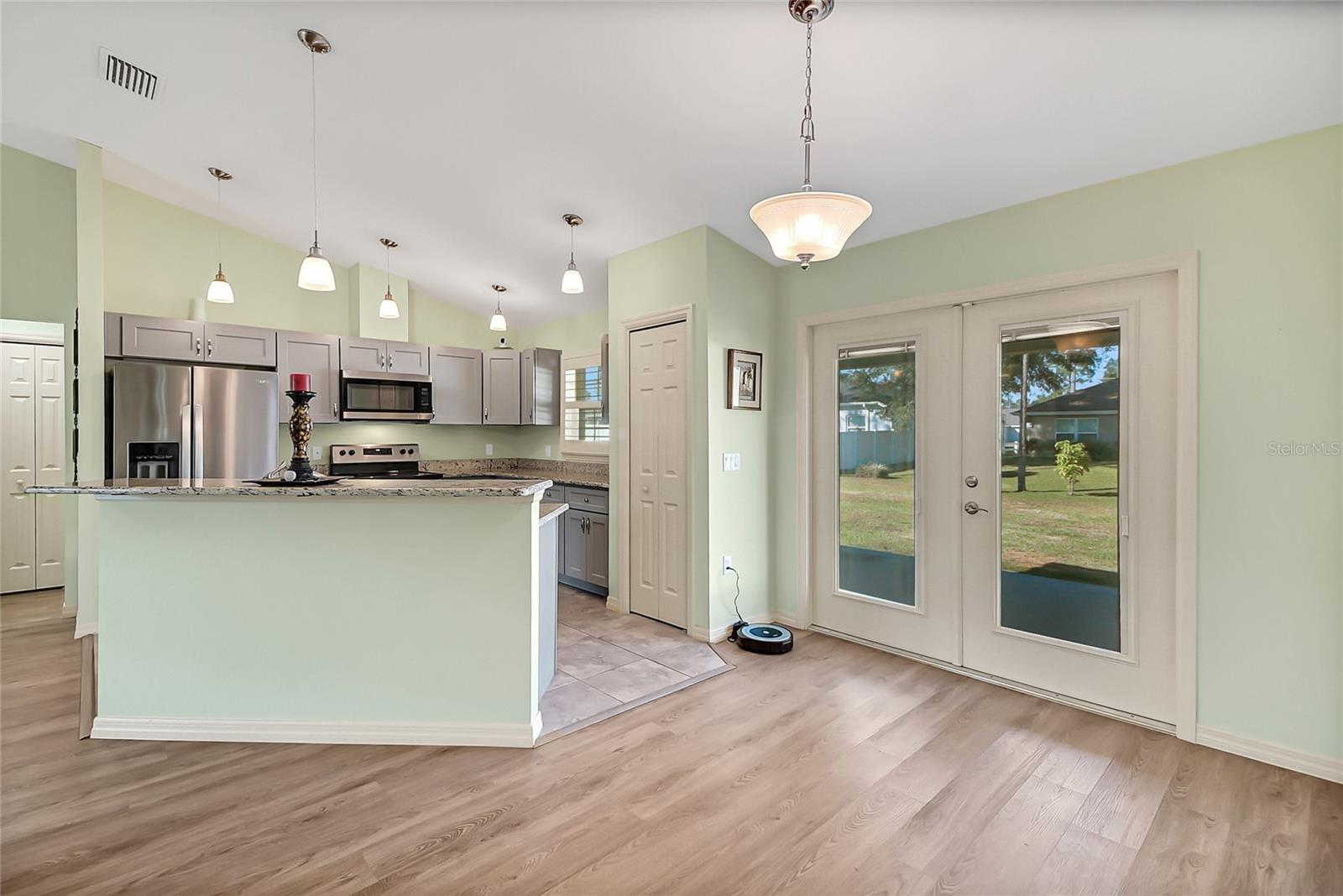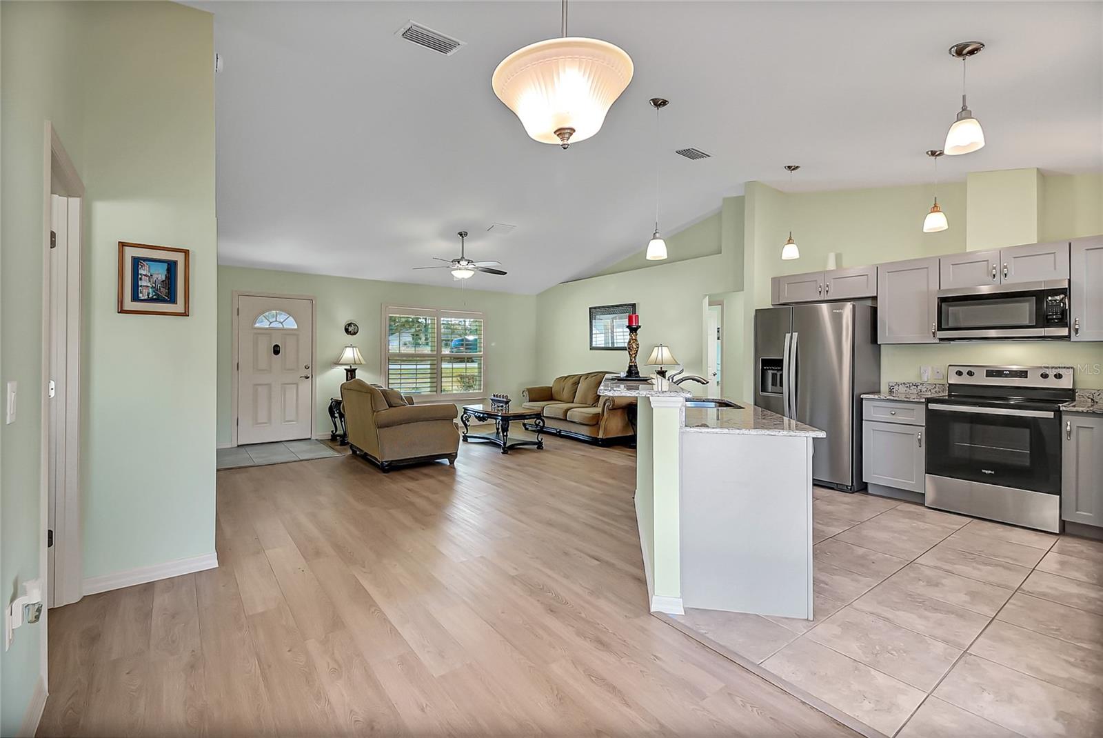Welcome to this gorgeous 3-bedroom, 2-bathroom home, newly built in 2021. Enjoy your morning coffee on the charming front or roomy back porch (17'x10'). The open floor plan with vaulted ceilings creates a spacious, airy feel, complemented by neutral-toned luxury laminate and tile flooring. The kitchen features granite countertops, stainless steel appliances, sleek gray cabinets, a pantry, and a breakfast bar. Both bathrooms include granite countertops, with the ensuite offering a dual vanity. Plantation shutters adorn the windows, and French doors with inset blinds ensure privacy. Additional highlights include an indoor laundry room with space to add storage. This home offers modern elegance, comfort, and functionality. A high-tech water filtration system is located in the garage. All rooms have been wired for internet and cable. The HVAC, sprinkler system, and garage are on WiFi. The furniture can be purchased separately. Conveniently located near shopping/dining and also a stone's throw away from The Villages.