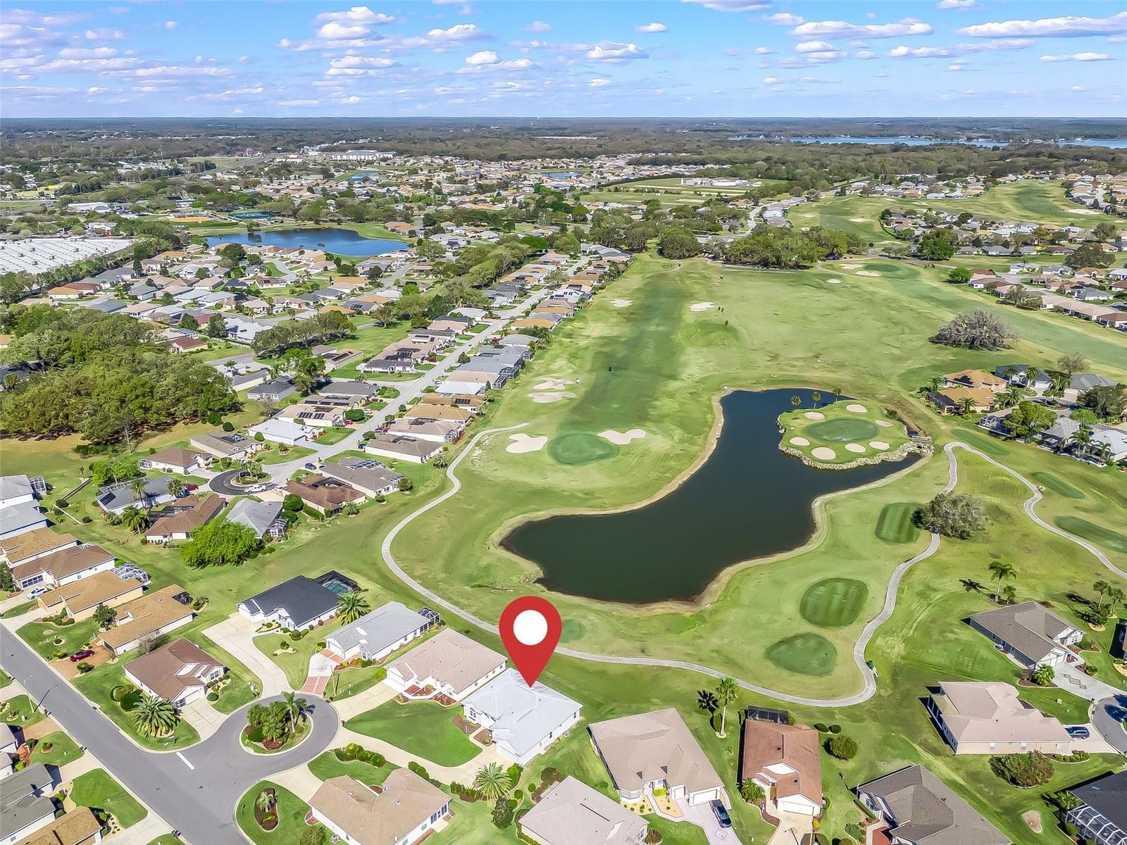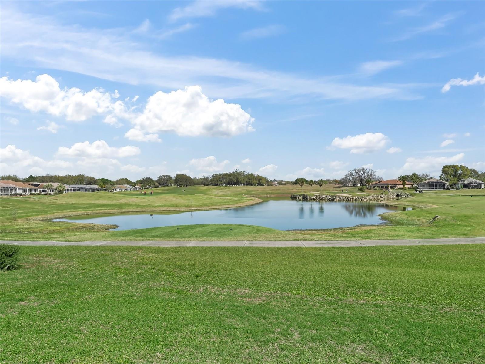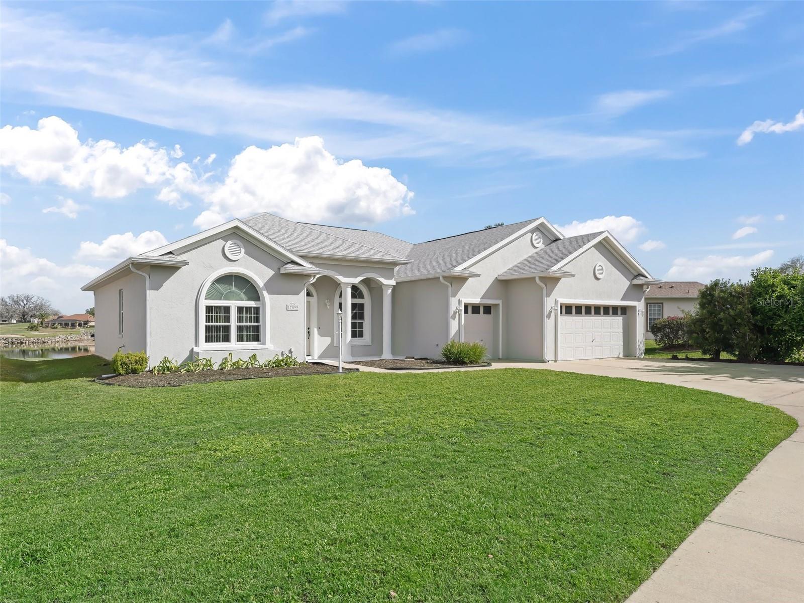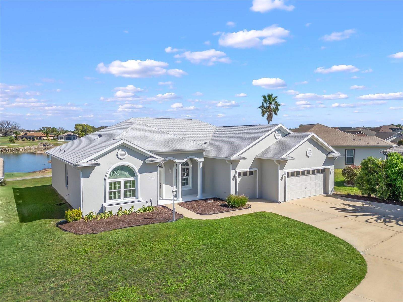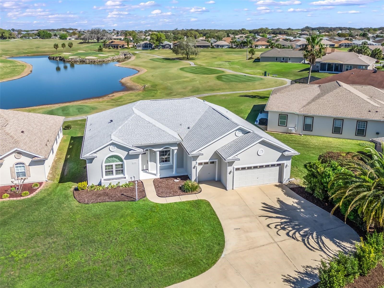 STONECREST is a 55+ Golf Course Community With All The Amenities, and just a Bridge Away By Golf Cart To The Villages! Stunning GOLF FRONT 3/3 Concrete Block and Stucco Cedar with a Water View, and a 2 + Golf Cart Garage on a Quiet Cul de Sac Lot with Room for a Pool! ROOF 2019! HVAC 2019! This well appointed home boasts a Tremendous Golf Course View, Water View, Upgraded light fixtures, Newer interior paint, 10' ceilings, and French door entry to the Study/Den (Living Room in original floor plan)! This Cedar model offers an Open Concept Floor plan with Soaring 10' ceilings throughout, and a Large Great Room off the Eat in Kitchen with stackable sliders to the Large Screened Lanai, creating a Spectacular Space for Social Gatherings, and relaxing with Family! This Spacious Kitchen features Quartz countertops that Sparkle like Diamonds, a nice size Pantry Closet, Wood cabinets, an Eat in Area, a Generous Breakfast bar, and Stunning Golf Course, and Water Views. The Split Floor plan provides Privacy for both the Owners and their Guest, with the Primary Suite commanding one side of the home, while the guest bedrooms and bathrooms are located on the opposite side of the home. The Luxurious Primary suite offers a Private access to the lanai, Walk in Closet, and an En Suite Bathroom. The En Suite Bathroom features a Two Sink Vanity, large Soaking Tub, Linen Closet, and a Walk in Shower. Guest bedroom 2 offers a Double closet, and an En suite bathroom with a Tiled Walk in shower, providing your guests with Convenience, and Privacy! Guest bedroom 3 is conveniently situated next to the additional guest bathroom with a Tub and Shower combination, a Private door to the Lanai, and has a double closet, offering plenty of space for the comfort of your guests! Enjoy the additional entertaining space provided by the Screened Lanai with tile flooring, and appreciate the beautiful Florida Sunsets from the comfort of the large screened lanai with unencumbered views, enhancing the outdoor living experience! This Stunning Cedar model offers a well designed floor plan, Room for a Pool, a Fabulous Golf Course, and Water View! Stonecrest is a 55+ gated golf course community with all the amenities, pools, pickleball courts, softball, 18 hole championship golf course, Broad Stripes Golf & Social Club and over 80 different clubs to join! Stonecrest is just a bridge away by golf cart to the Villages. It is a community with Private Roads and 24 Hour Security! As a private gated golf course community, you can expect a high level of privacy and security. Overall, this home offers a combination of Tremendous Outdoor Space, luxurious features, a desirable location, and a secure community setting. A WONDERFUL LIFESTYLE AWAITS YOU IN STONECREST!