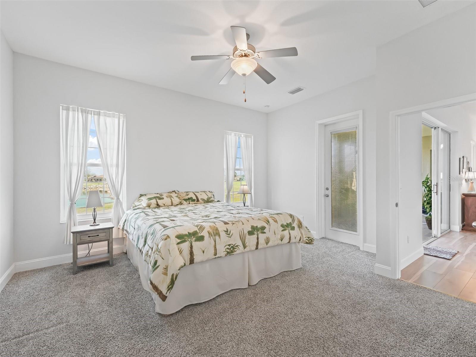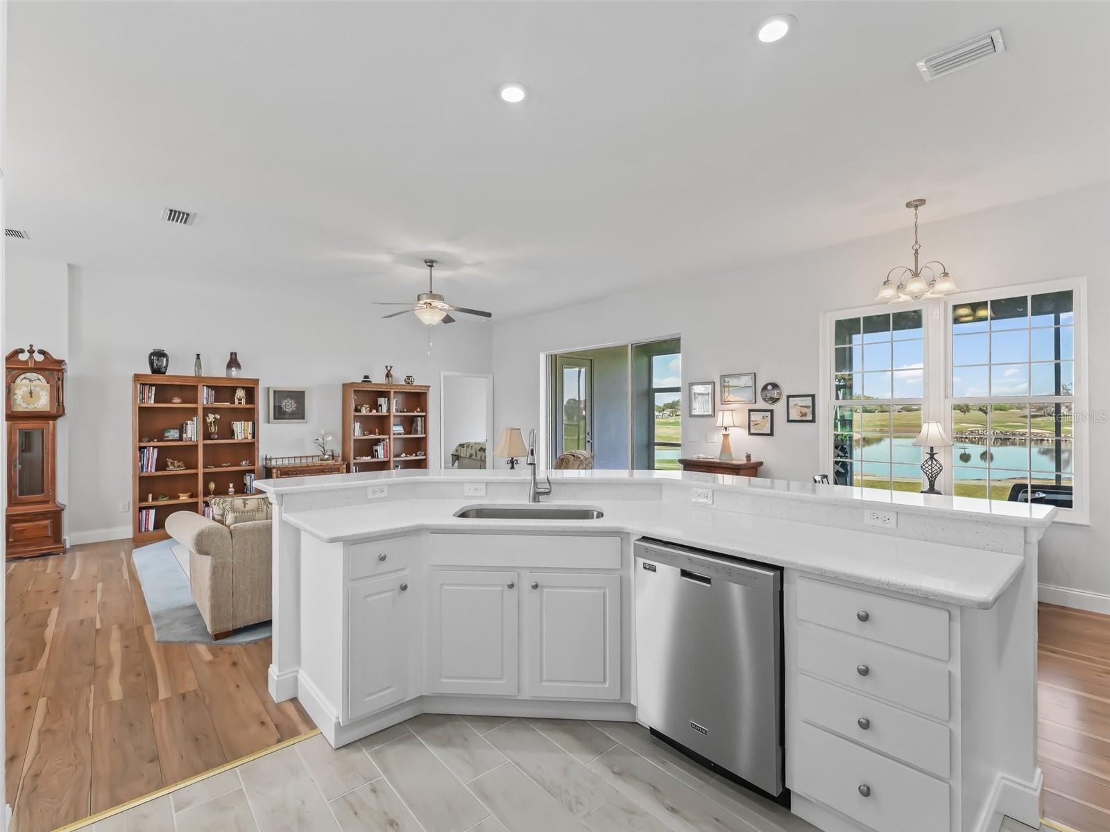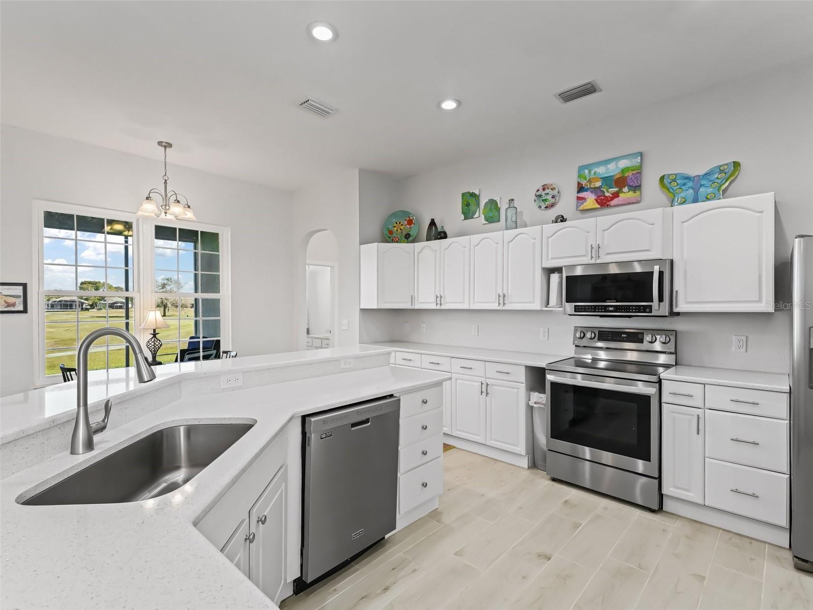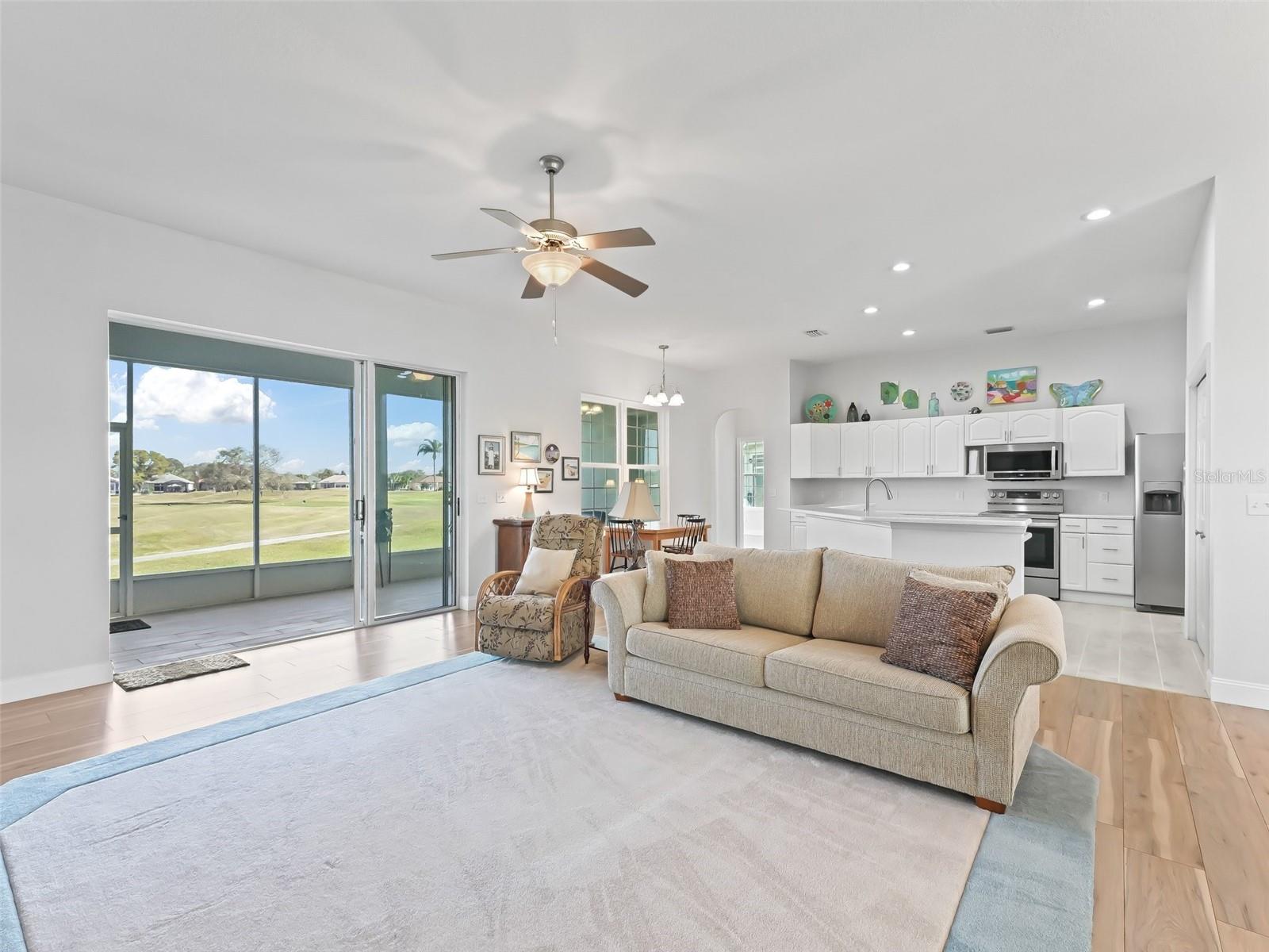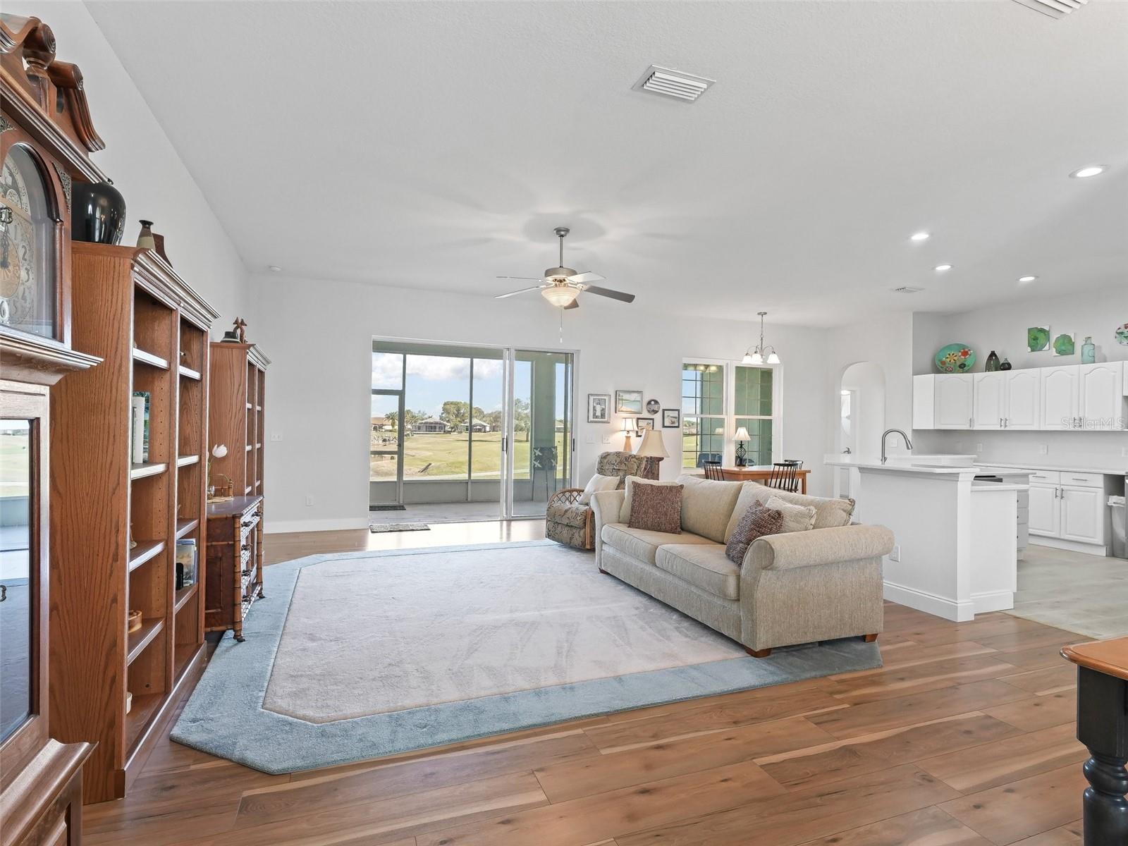 STONECREST is a 55+ Golf Course Community With All The Amenities, and just a Bridge Away By Golf Cart To The Villages! Stunning GOLF FRONT 3/3 Concrete Block and Stucco Cedar with a Water View, and a 2 + Golf Cart Garage on a Quiet Cul de Sac Lot with Room for a Pool! ROOF 2019! HVAC 2019! This well appointed home boasts a Tremendous Golf Course View, Water View, Upgraded light fixtures, Newer interior paint, 10' ceilings, and French door entry to the Study/Den (Living Room in original floor plan)! This Cedar model offers an Open Concept Floor plan with Soaring 10' ceilings throughout, and a Large Great Room off the Eat in Kitchen with stackable sliders to the Large Screened Lanai, creating a Spectacular Space for Social Gatherings, and relaxing with Family! This Spacious Kitchen features Quartz countertops that Sparkle like Diamonds, a nice size Pantry Closet, Wood cabinets, an Eat in Area, a Generous Breakfast bar, and Stunning Golf Course, and Water Views. The Split Floor plan provides Privacy for both the Owners and their Guest, with the Primary Suite commanding one side of the home, while the guest bedrooms and bathrooms are located on the opposite side of the home. The Luxurious Primary suite offers a Private access to the lanai, Walk in Closet, and an En Suite Bathroom. The En Suite Bathroom features a Two Sink Vanity, large Soaking Tub, Linen Closet, and a Walk in Shower. Guest bedroom 2 offers a Double closet, and an En suite bathroom with a Tiled Walk in shower, providing your guests with Convenience, and Privacy! Guest bedroom 3 is conveniently situated next to the additional guest bathroom with a Tub and Shower combination, a Private door to the Lanai, and has a double closet, offering plenty of space for the comfort of your guests! Enjoy the additional entertaining space provided by the Screened Lanai with tile flooring, and appreciate the beautiful Florida Sunsets from the comfort of the large screened lanai with unencumbered views, enhancing the outdoor living experience! This Stunning Cedar model offers a well designed floor plan, Room for a Pool, a Fabulous Golf Course, and Water View! Stonecrest is a 55+ gated golf course community with all the amenities, pools, pickleball courts, softball, 18 hole championship golf course, Broad Stripes Golf & Social Club and over 80 different clubs to join! Stonecrest is just a bridge away by golf cart to the Villages. It is a community with Private Roads and 24 Hour Security! As a private gated golf course community, you can expect a high level of privacy and security. Overall, this home offers a combination of Tremendous Outdoor Space, luxurious features, a desirable location, and a secure community setting. A WONDERFUL LIFESTYLE AWAITS YOU IN STONECREST!
